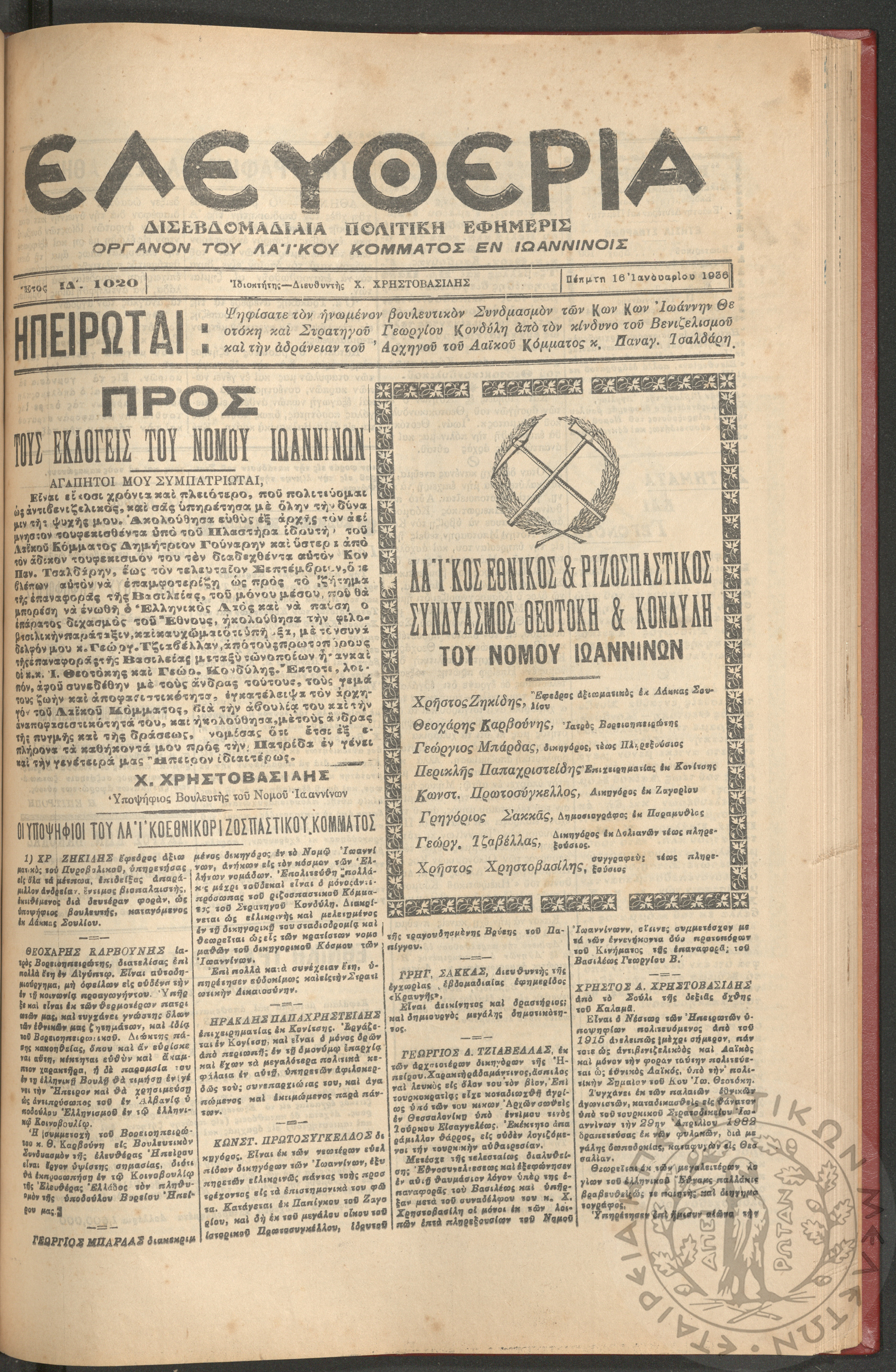 Ελευθερία: δισεβδομαδιαία Ηπειρωτική πολιτική εφημερίς, 1936, φ. 1020