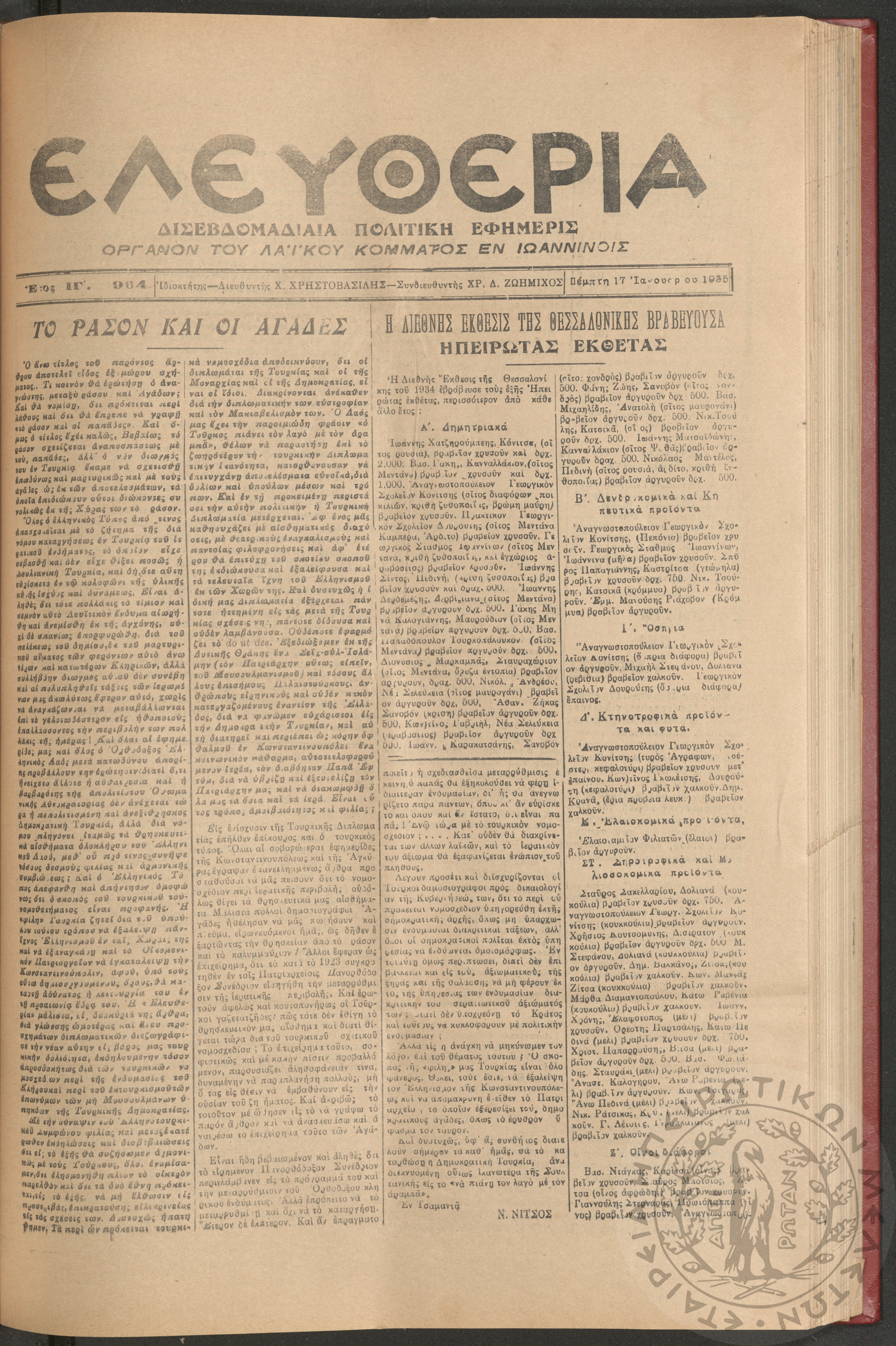 Ελευθερία: δισεβδομαδιαία Ηπειρωτική πολιτική εφημερίς, 1935, φ. 964