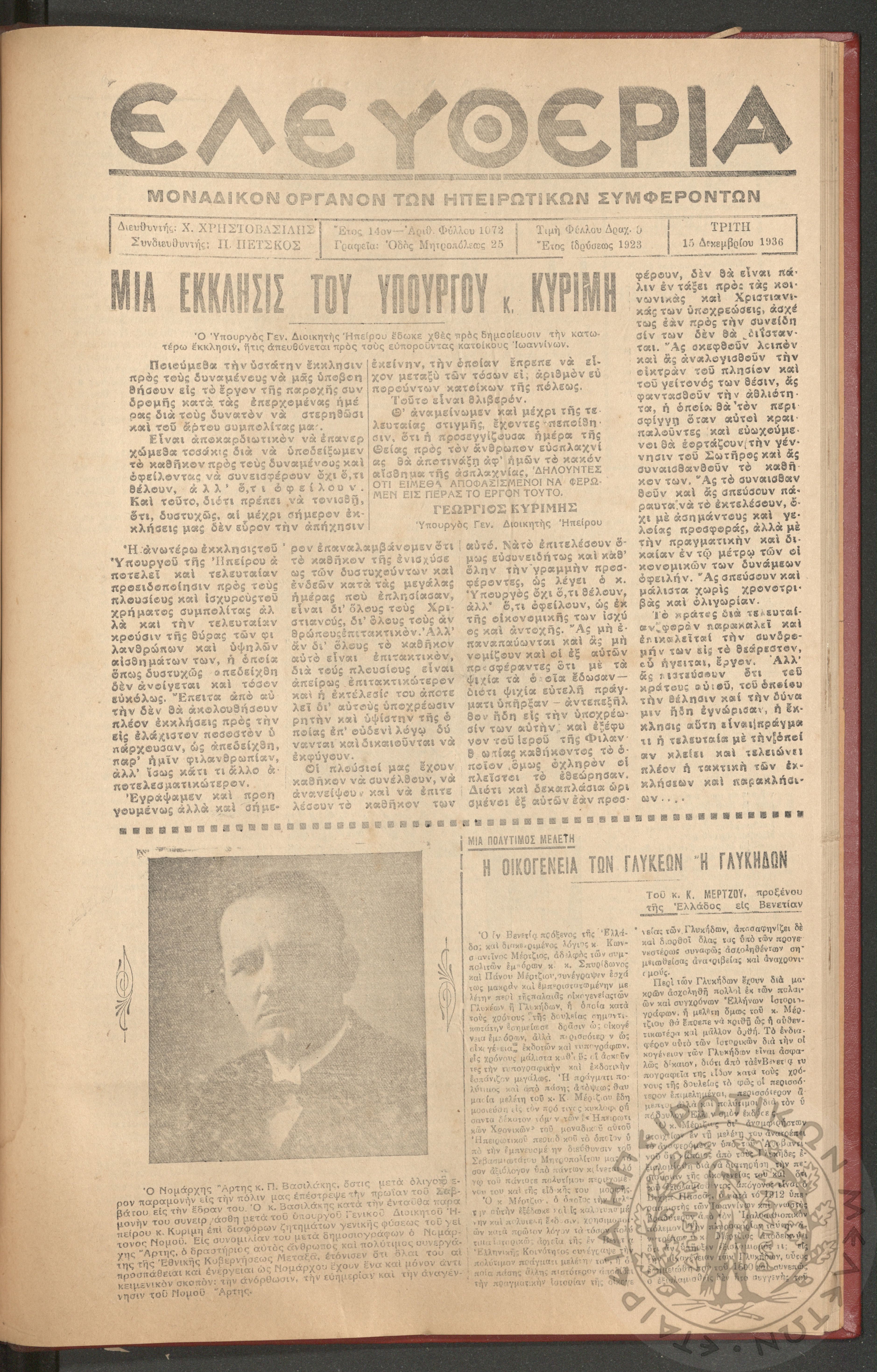 Ελευθερία: δισεβδομαδιαία Ηπειρωτική πολιτική εφημερίς, 1936, φ. 1072