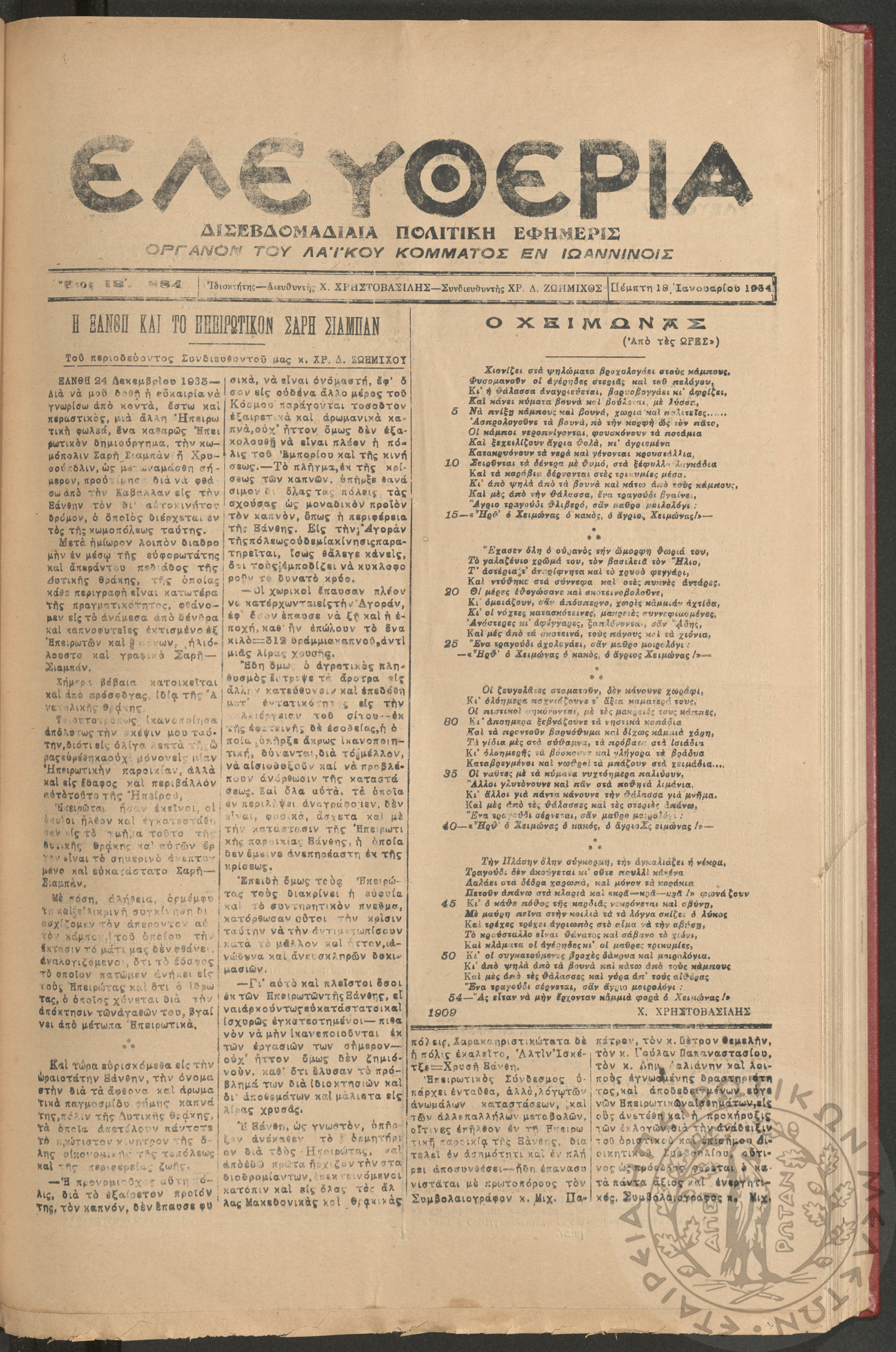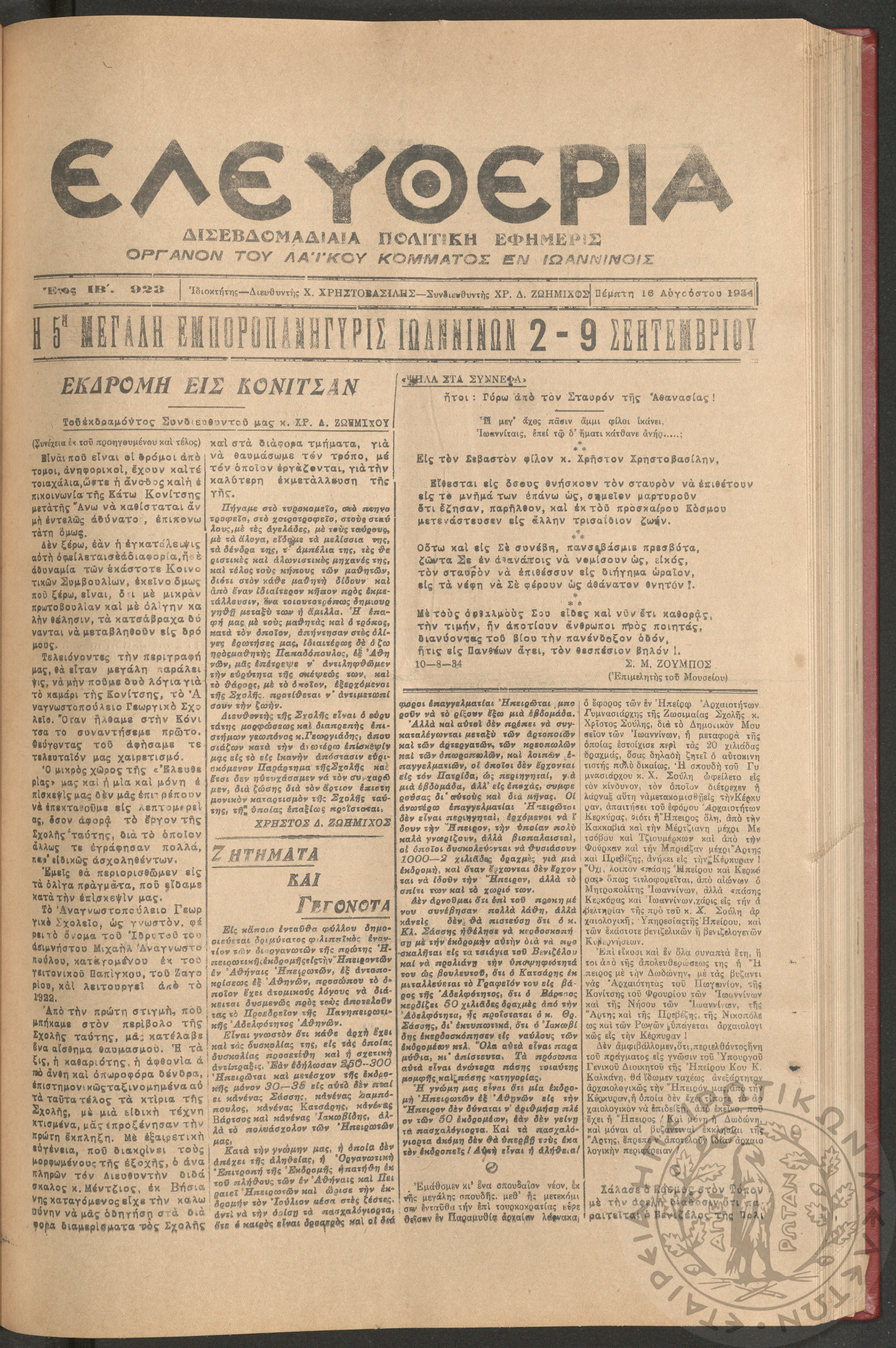 Ελευθερία: δισεβδομαδιαία Ηπειρωτική πολιτική εφημερίς, 1934, φ. 923