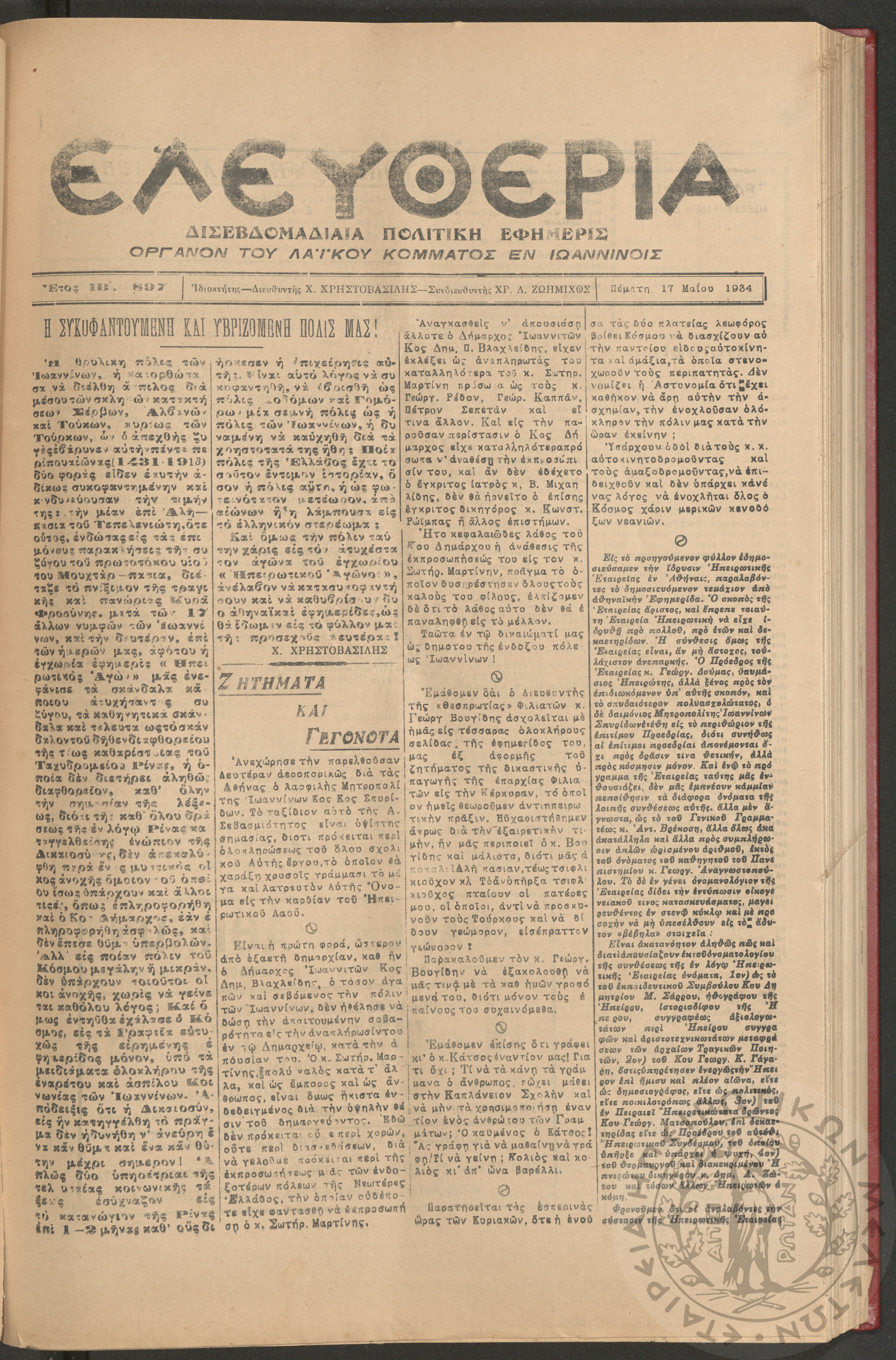 Ελευθερία: δισεβδομαδιαία Ηπειρωτική πολιτική εφημερίς, 1934, φ. 897