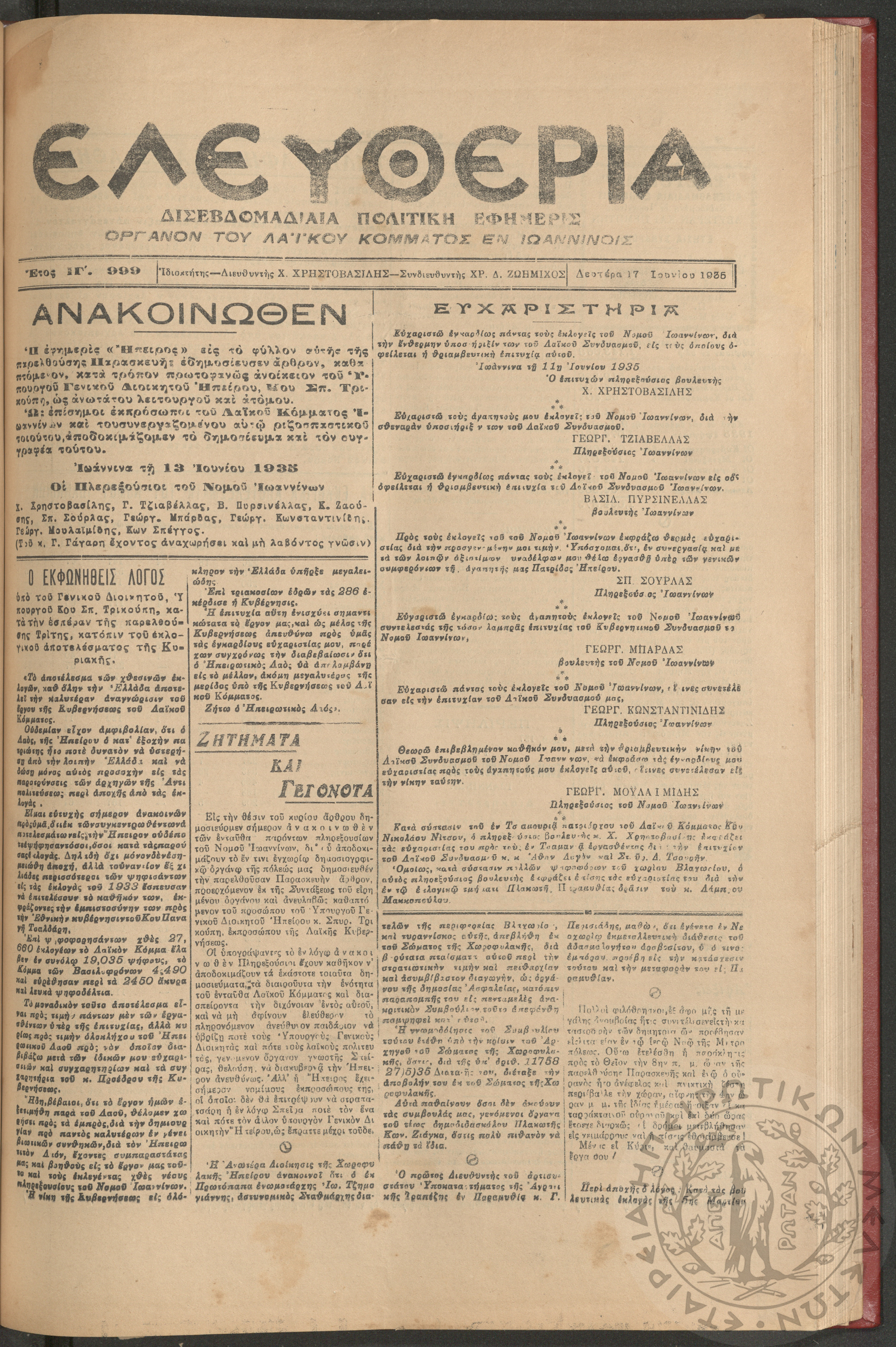 Ελευθερία: δισεβδομαδιαία Ηπειρωτική πολιτική εφημερίς, 1935, φ. 999