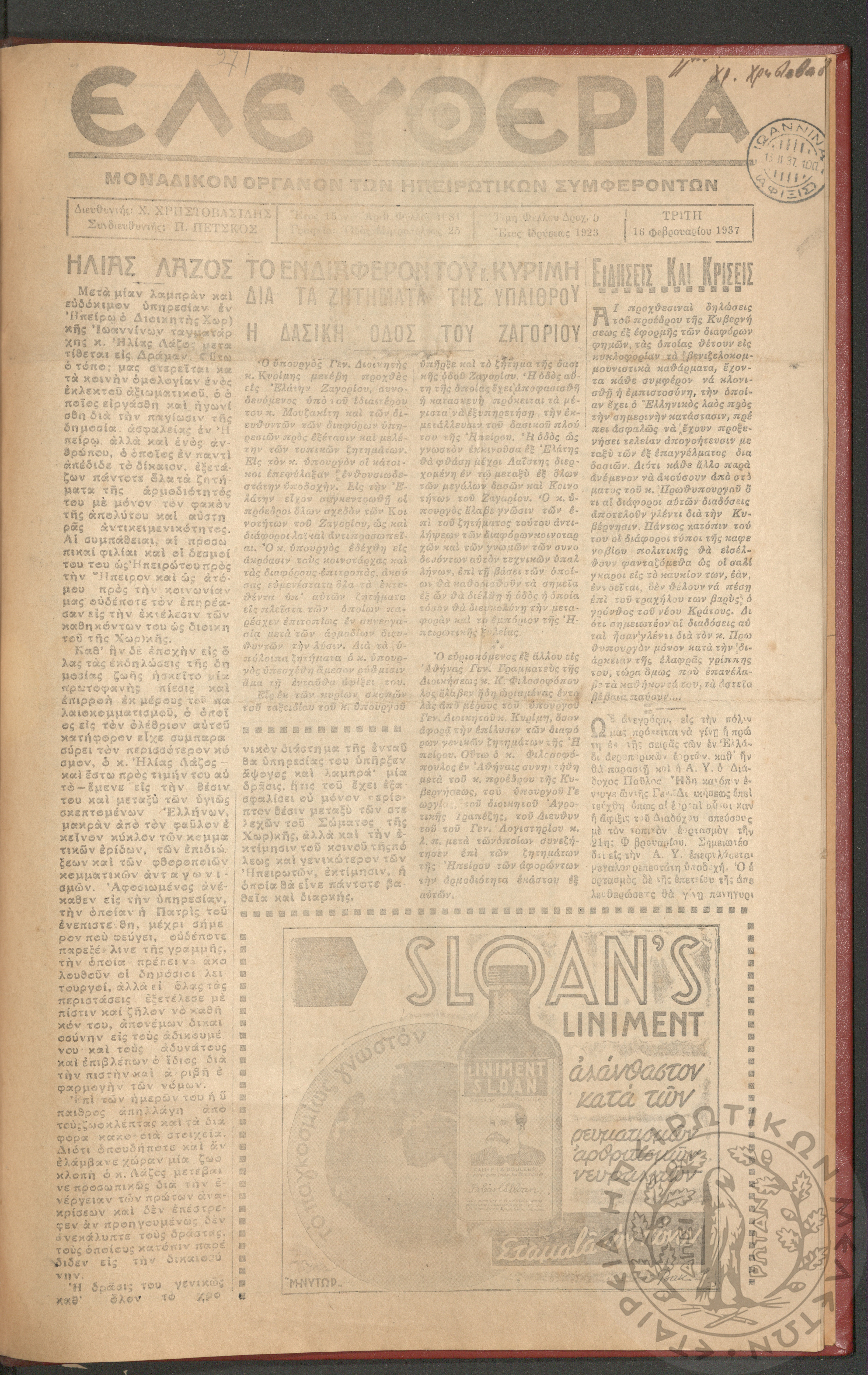 Ελευθερία: δισεβδομαδιαία Ηπειρωτική πολιτική εφημερίς, 1937, φ. 1081