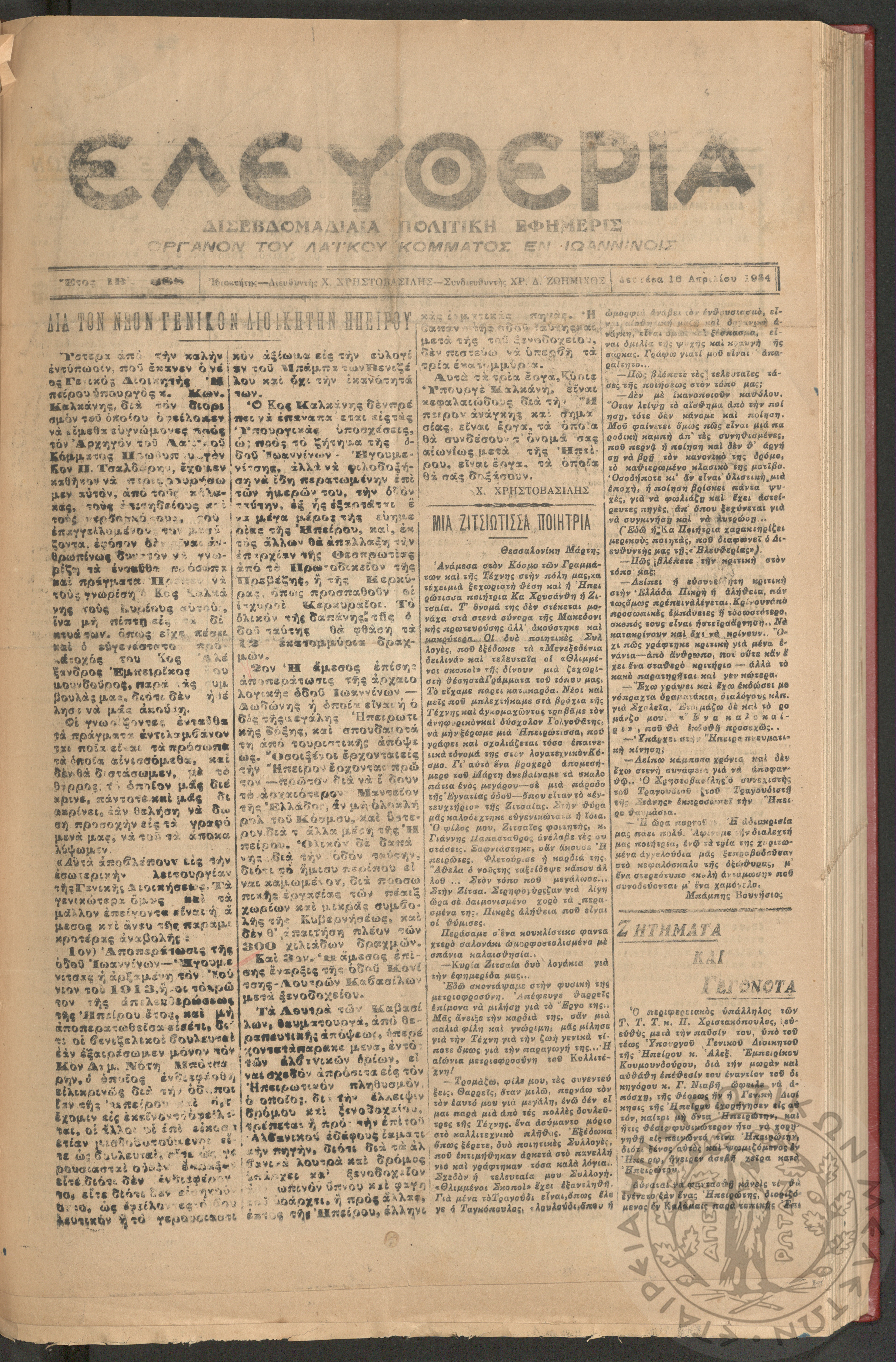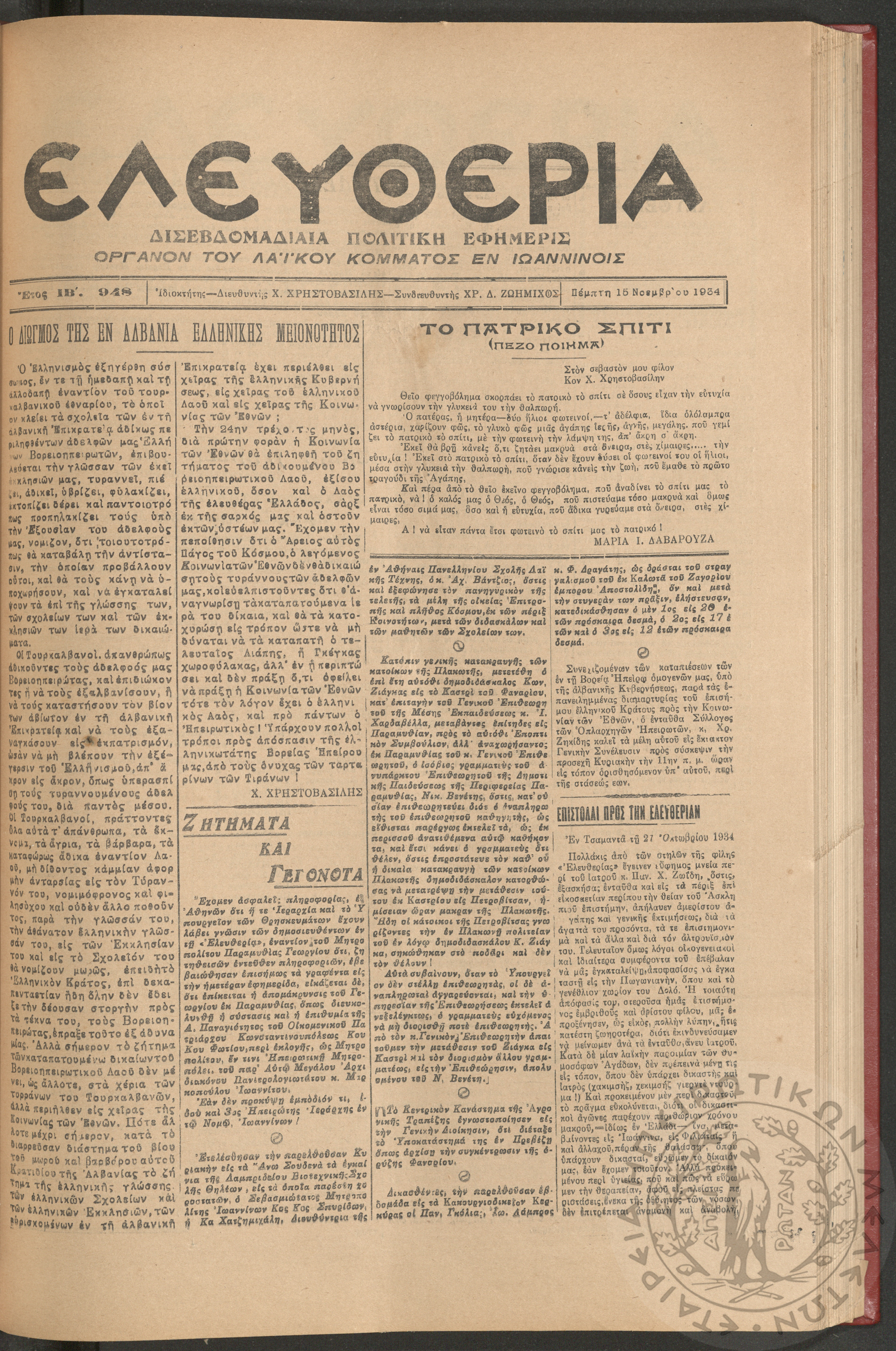 Ελευθερία: δισεβδομαδιαία Ηπειρωτική πολιτική εφημερίς, 1934, φ. 948