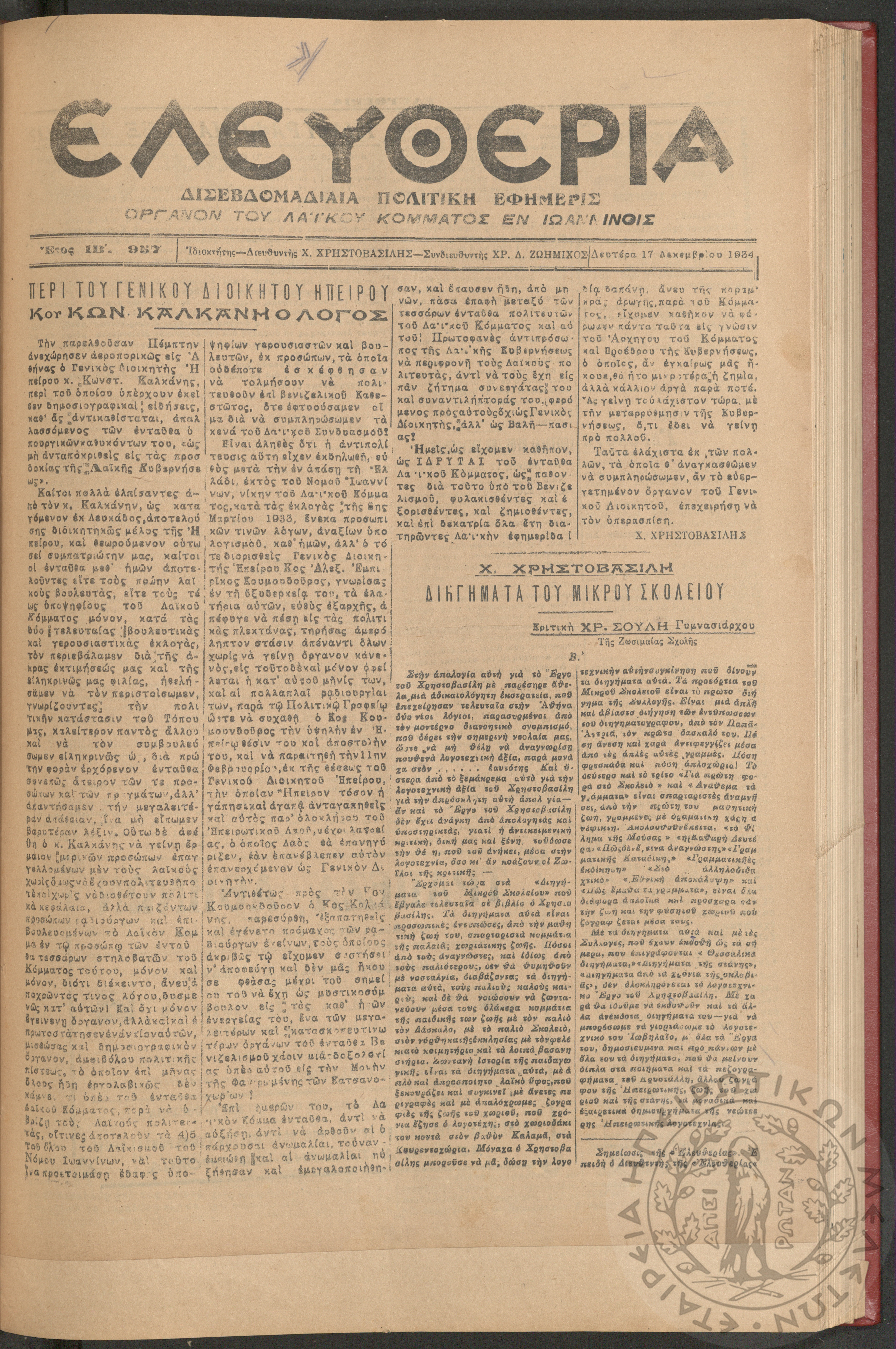 Ελευθερία: δισεβδομαδιαία Ηπειρωτική πολιτική εφημερίς, 1934, φ. 957