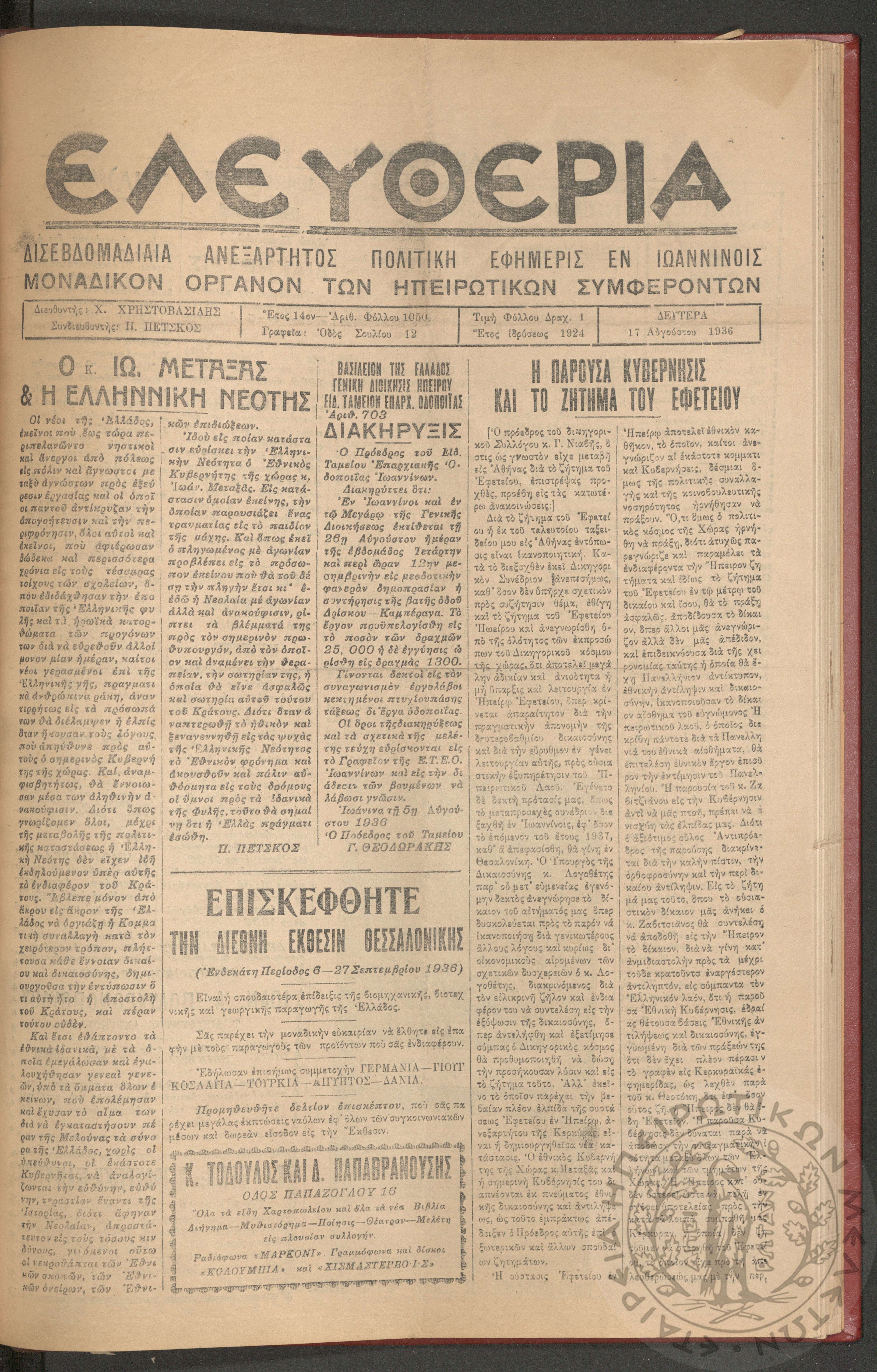 Ελευθερία: δισεβδομαδιαία Ηπειρωτική πολιτική εφημερίς, 1936, φ. 1050