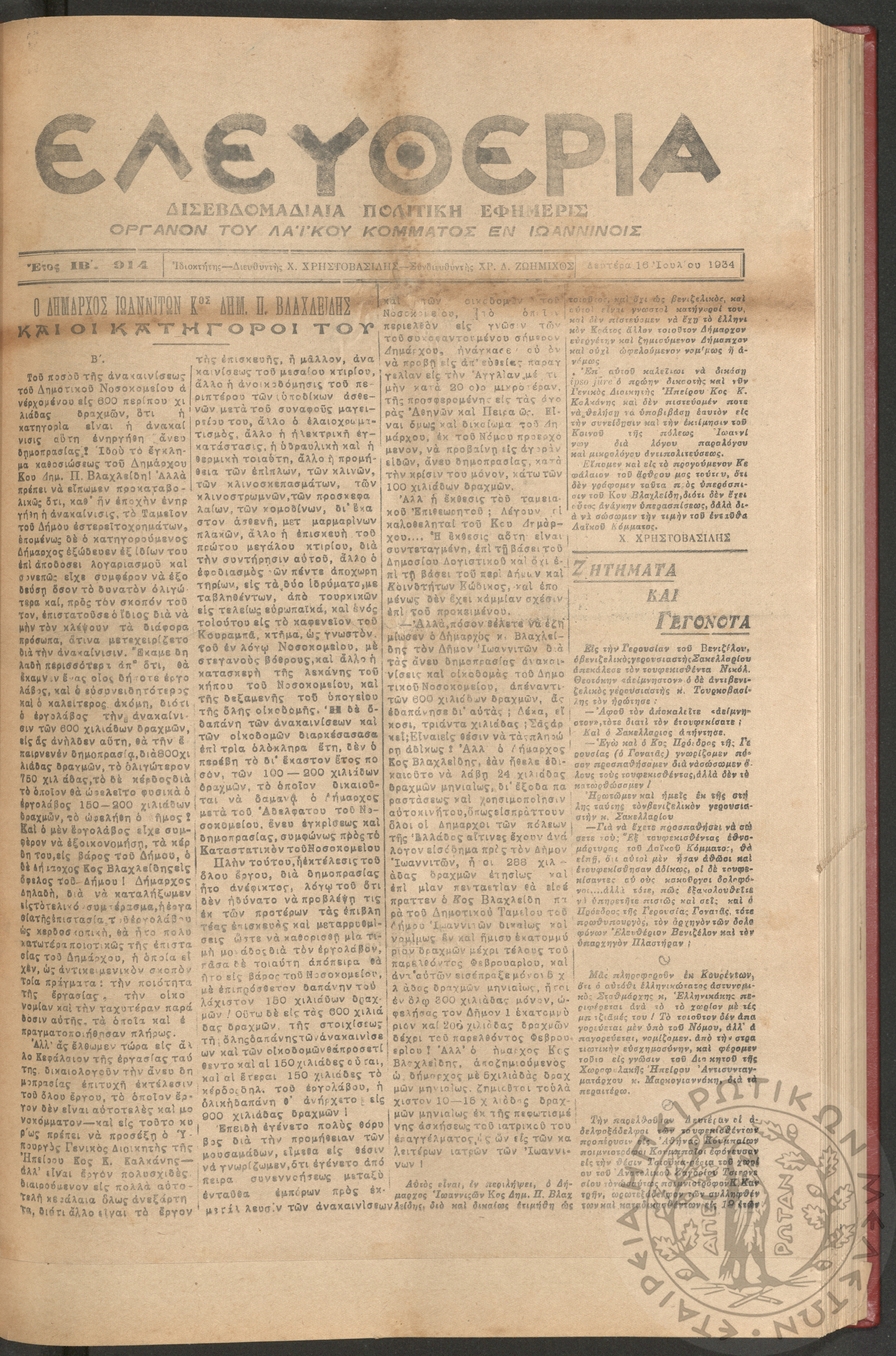 Ελευθερία: δισεβδομαδιαία Ηπειρωτική πολιτική εφημερίς, 1934, φ. 914