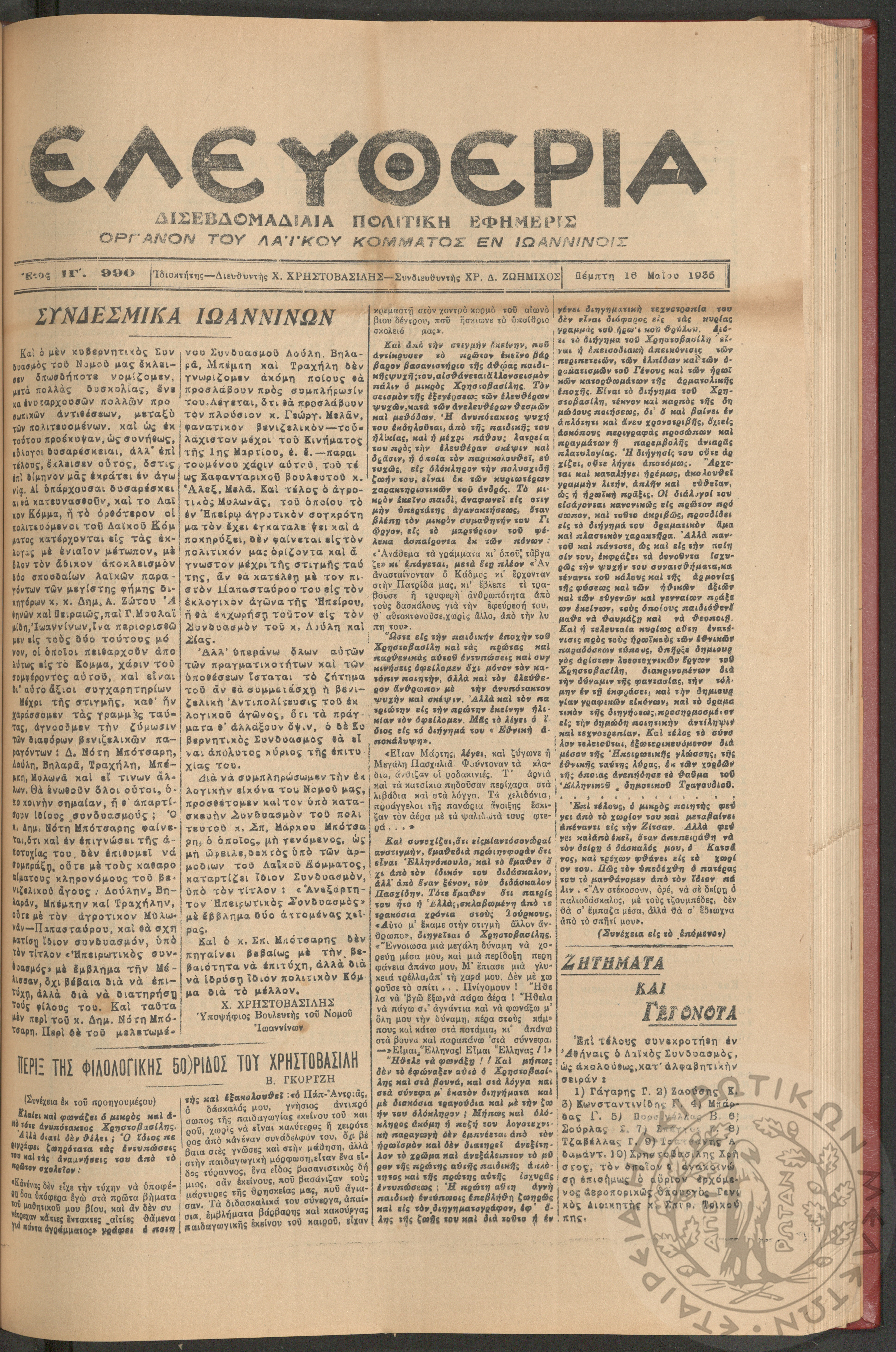 Ελευθερία: δισεβδομαδιαία Ηπειρωτική πολιτική εφημερίς, 1935, φ. 990