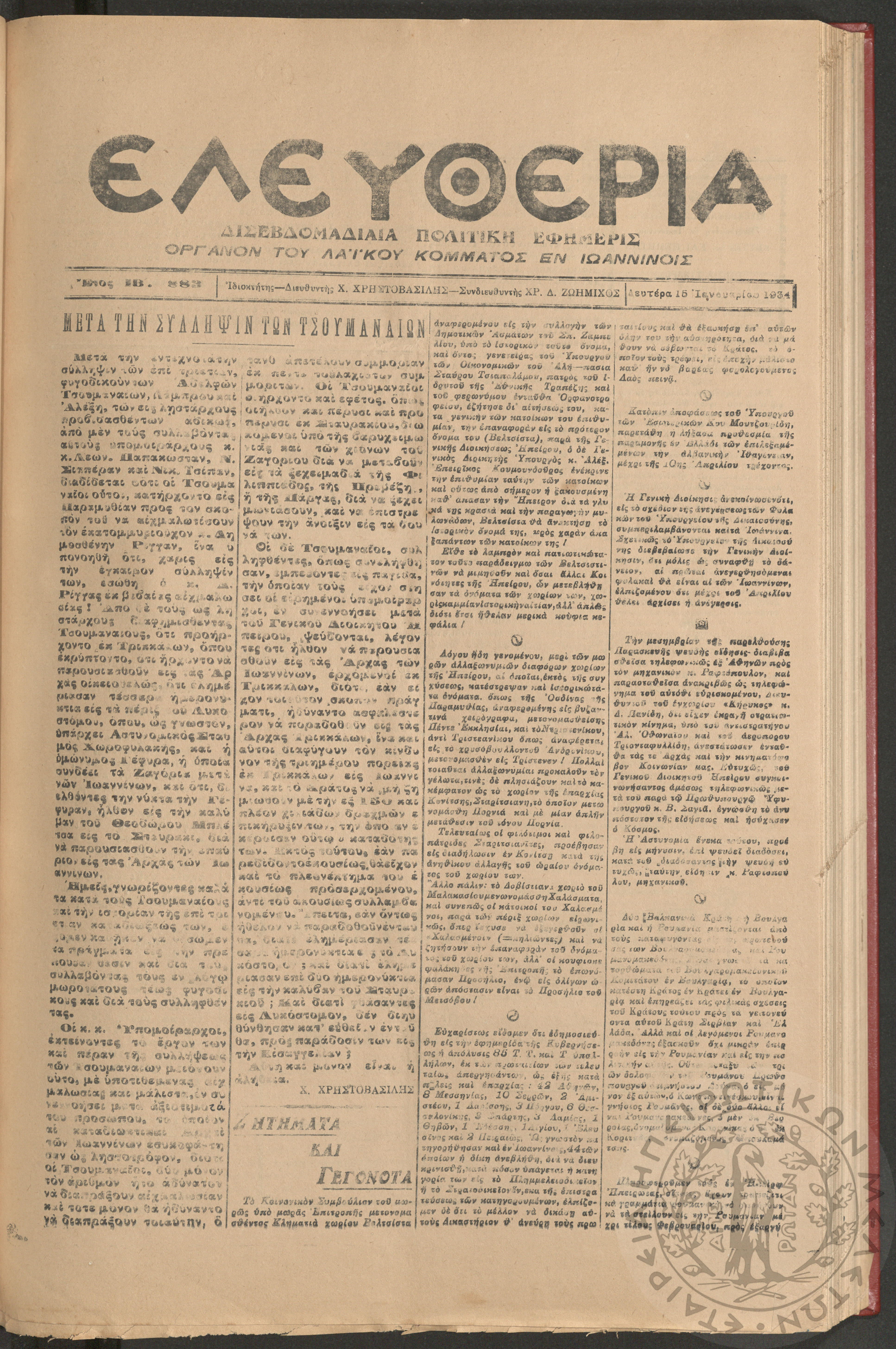 Ελευθερία: δισεβδομαδιαία Ηπειρωτική πολιτική εφημερίς, 1934, φ. 883