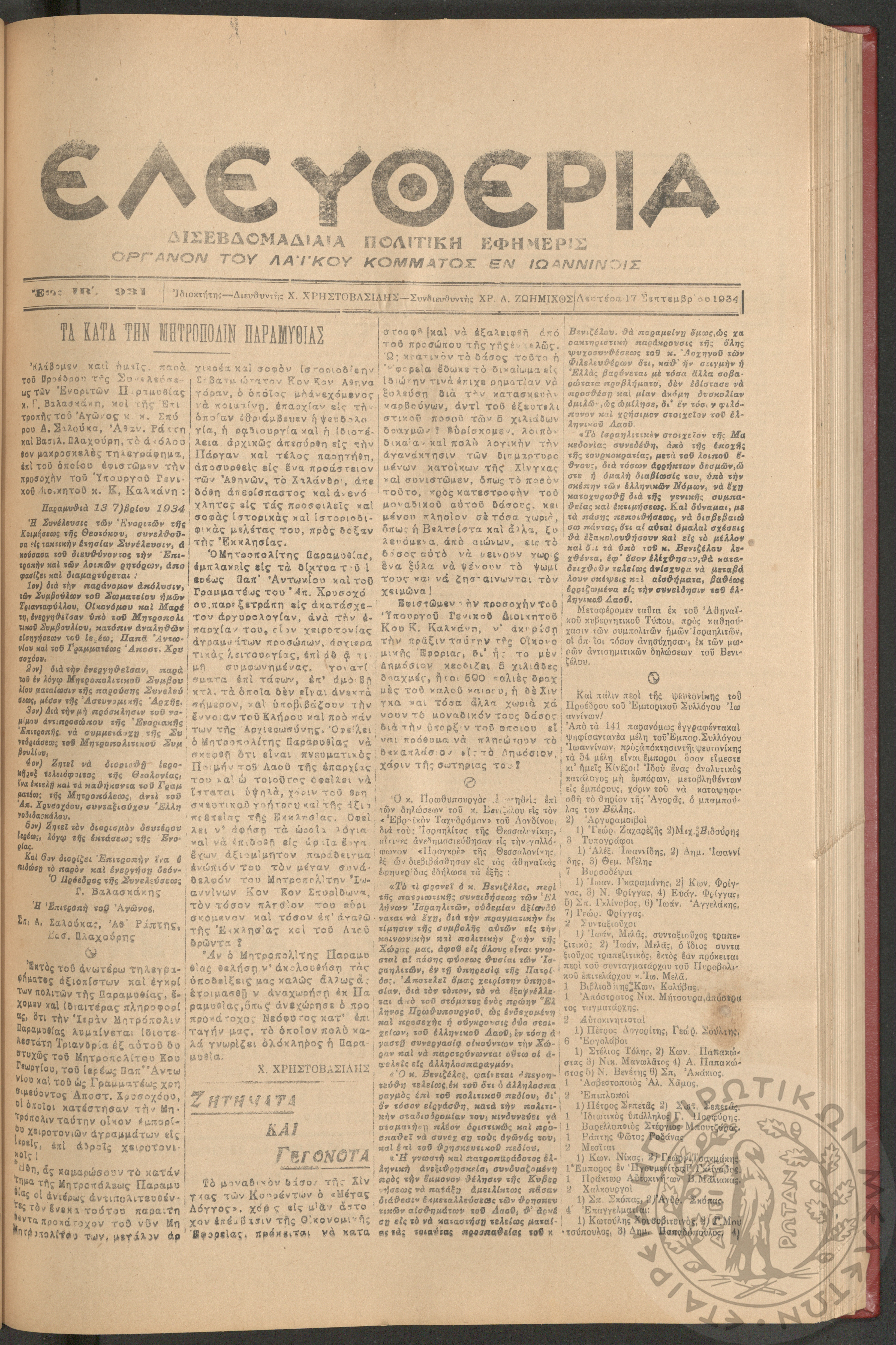 Ελευθερία: δισεβδομαδιαία Ηπειρωτική πολιτική εφημερίς, 1934, φ. 931