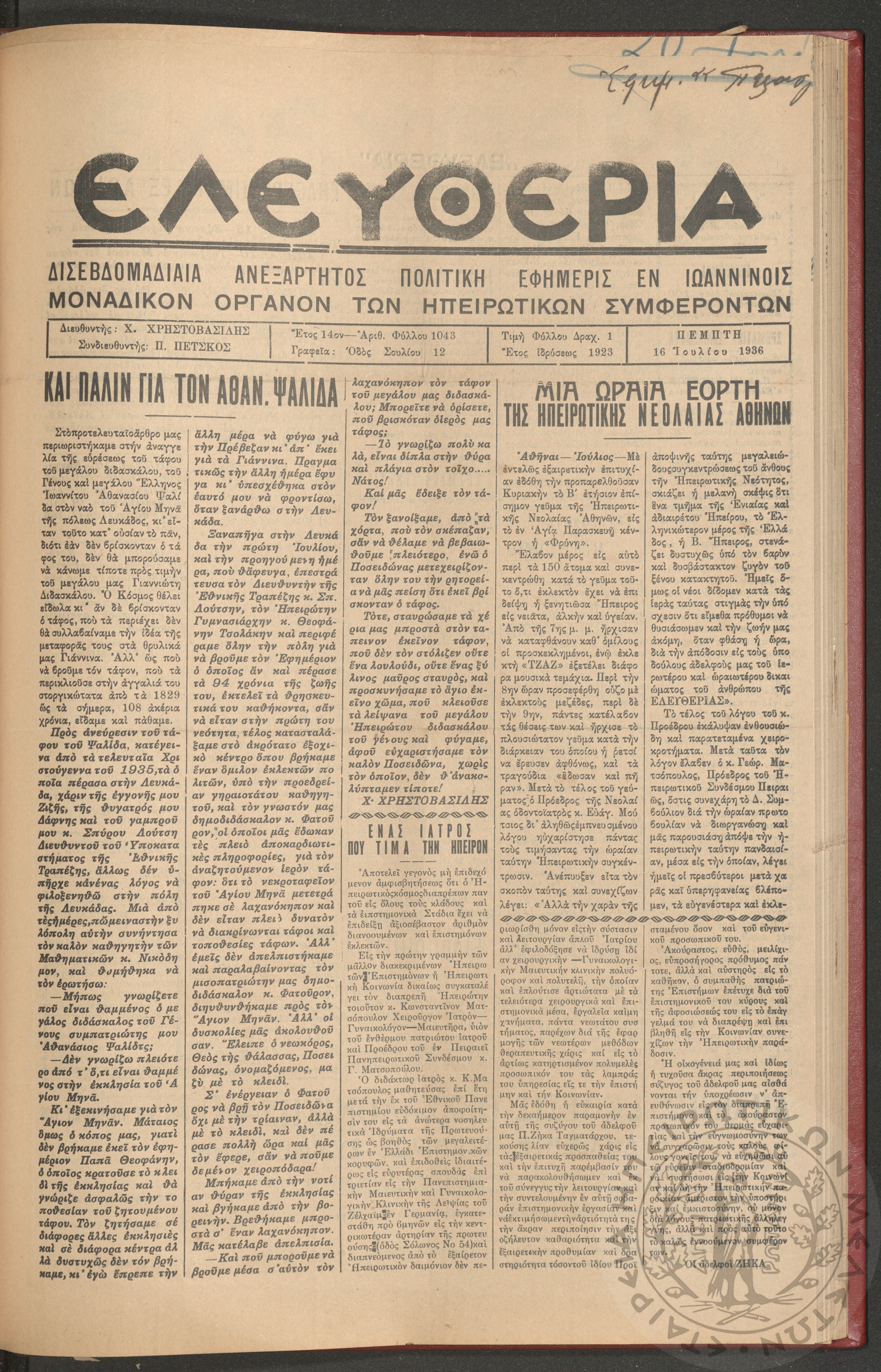 Ελευθερία: δισεβδομαδιαία Ηπειρωτική πολιτική εφημερίς, 1936, φ. 1043