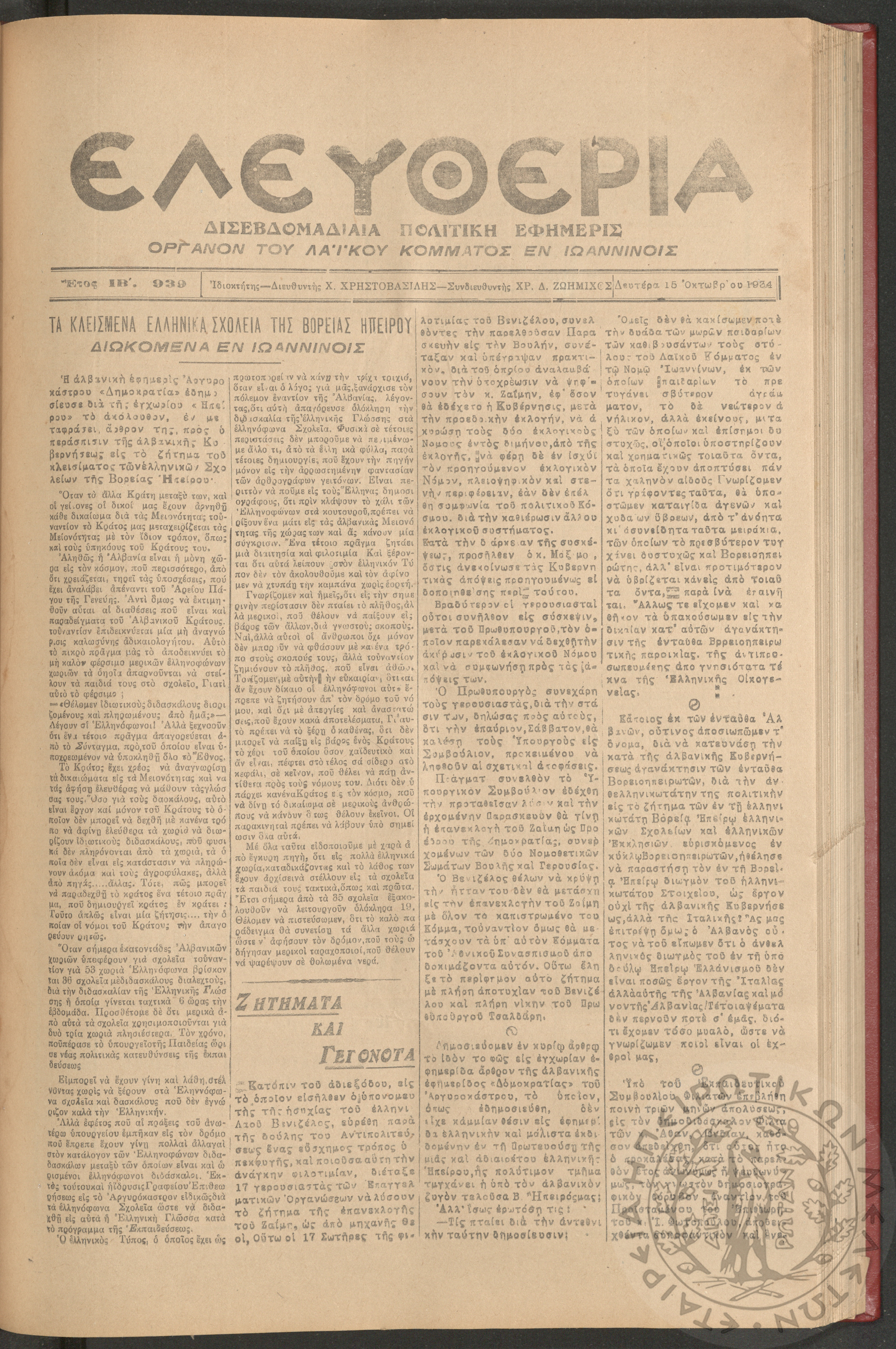 Ελευθερία: δισεβδομαδιαία Ηπειρωτική πολιτική εφημερίς, 1934, φ. 939