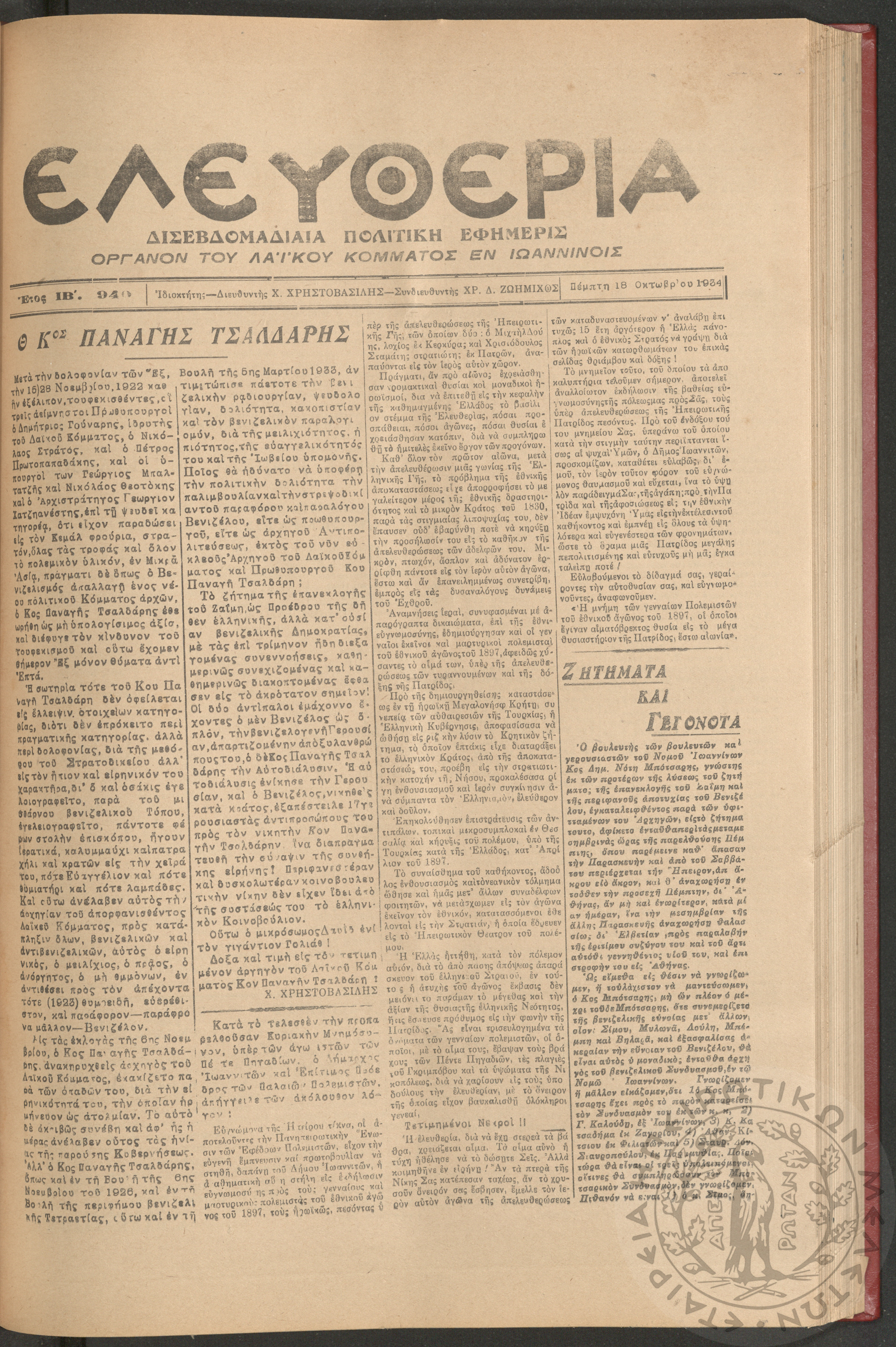 Ελευθερία: δισεβδομαδιαία Ηπειρωτική πολιτική εφημερίς, 1934, φ. 940