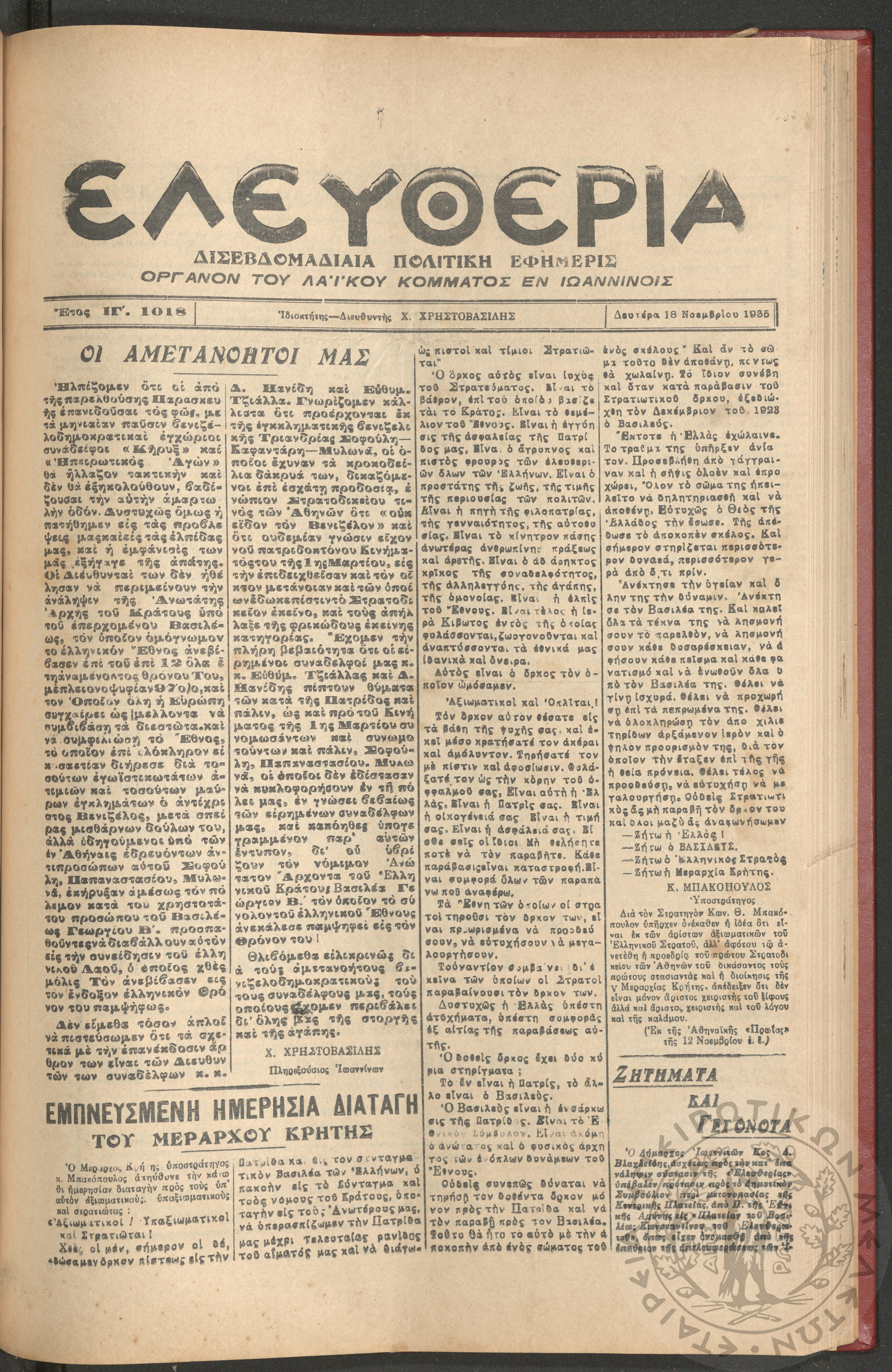 Ελευθερία: δισεβδομαδιαία Ηπειρωτική πολιτική εφημερίς, 1935, φ. 1018