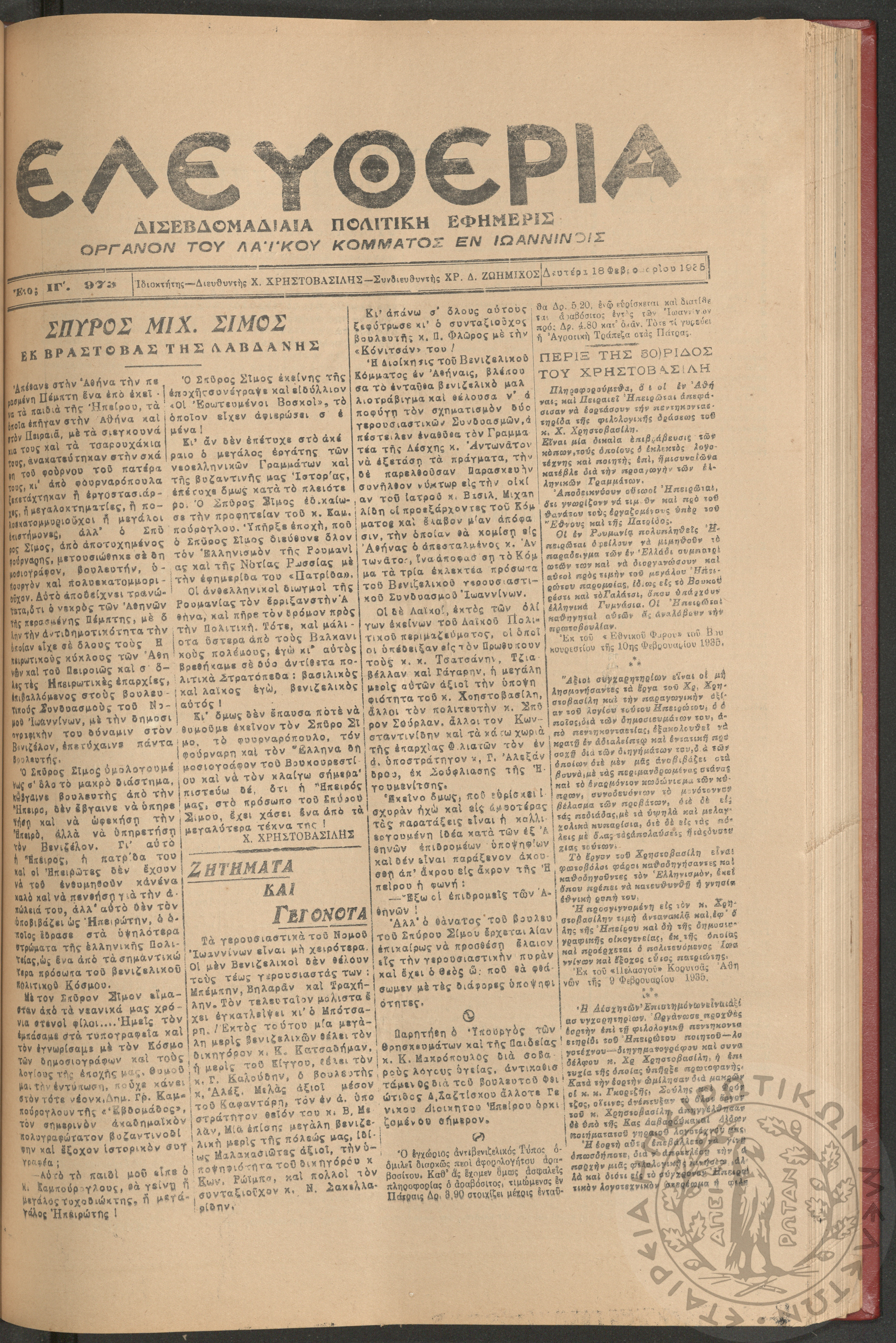 Ελευθερία: δισεβδομαδιαία Ηπειρωτική πολιτική εφημερίς, 1935, φ. 973