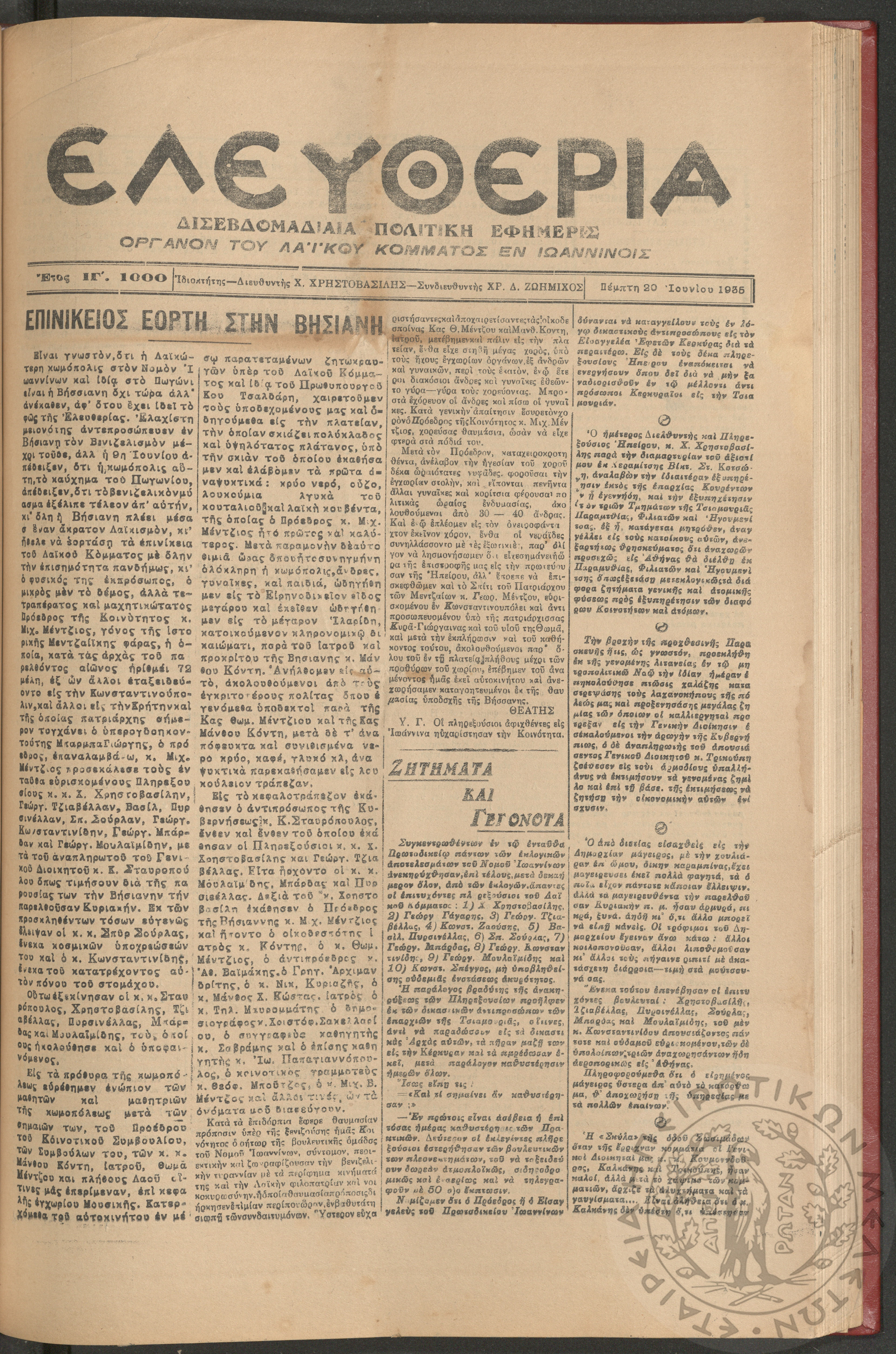 Ελευθερία: δισεβδομαδιαία Ηπειρωτική πολιτική εφημερίς, 1935, φ. 1000