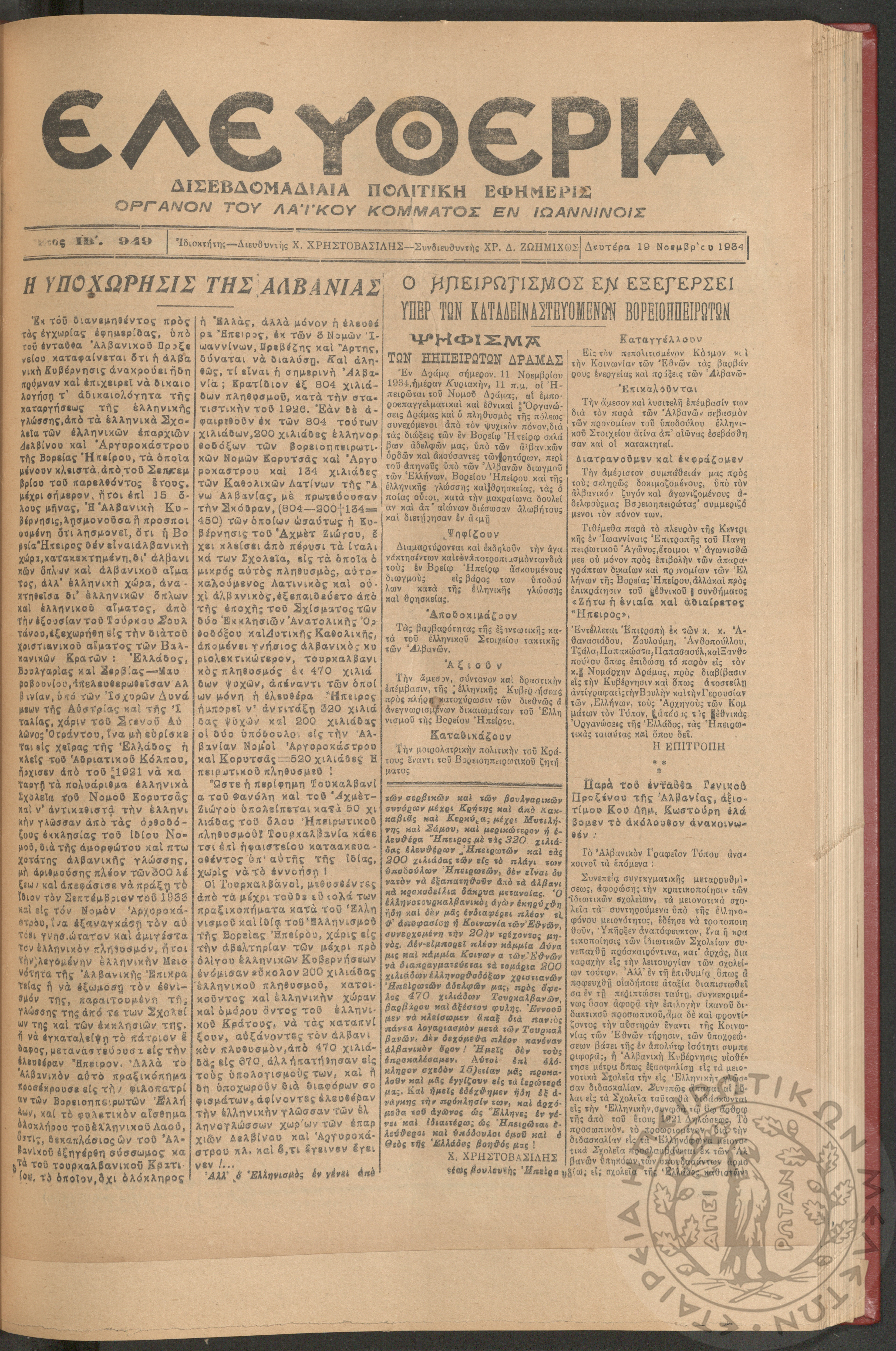 Ελευθερία: δισεβδομαδιαία Ηπειρωτική πολιτική εφημερίς, 1934, φ. 949