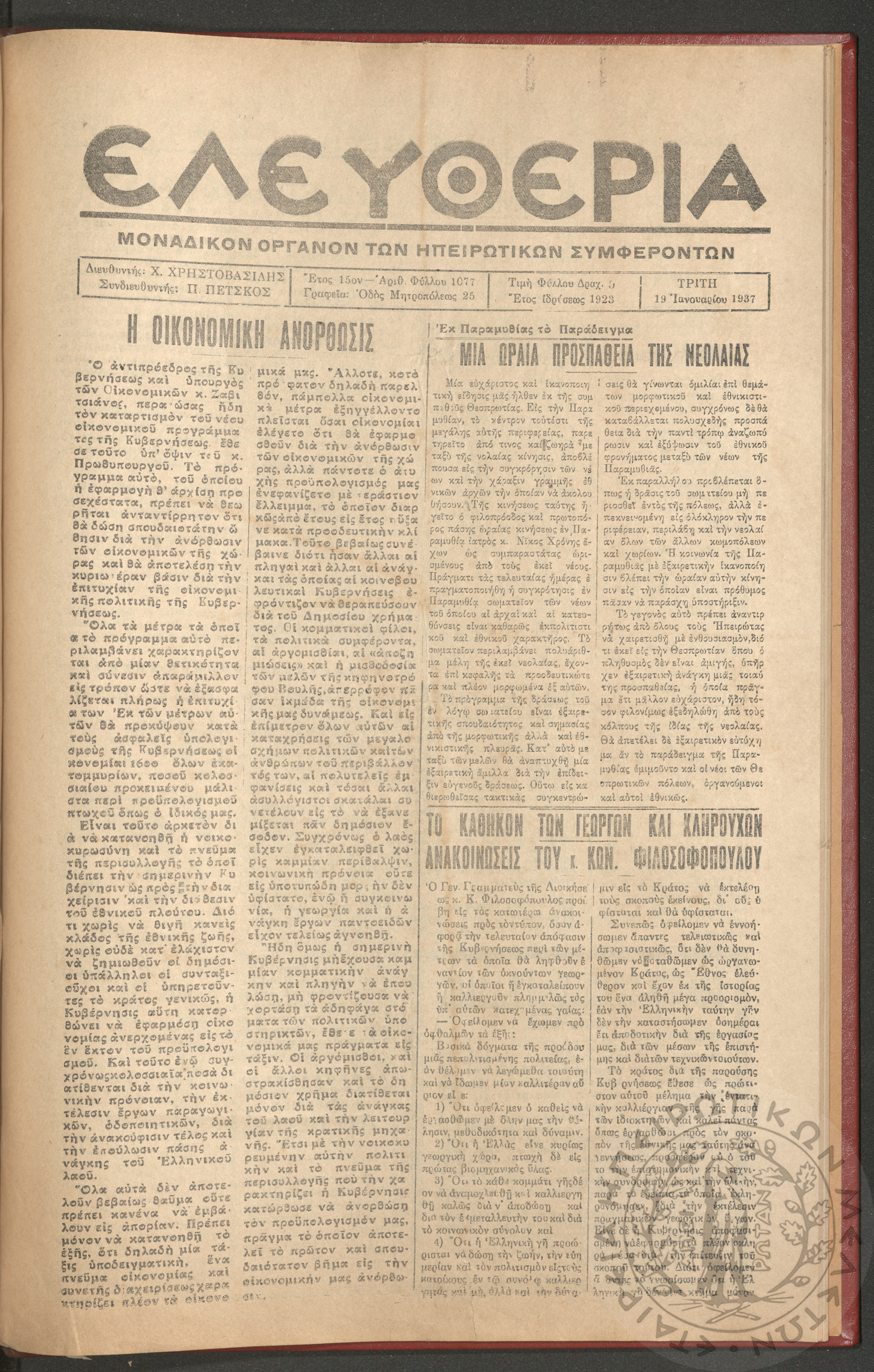 Ελευθερία: δισεβδομαδιαία Ηπειρωτική πολιτική εφημερίς, 1937, φ. 1077
