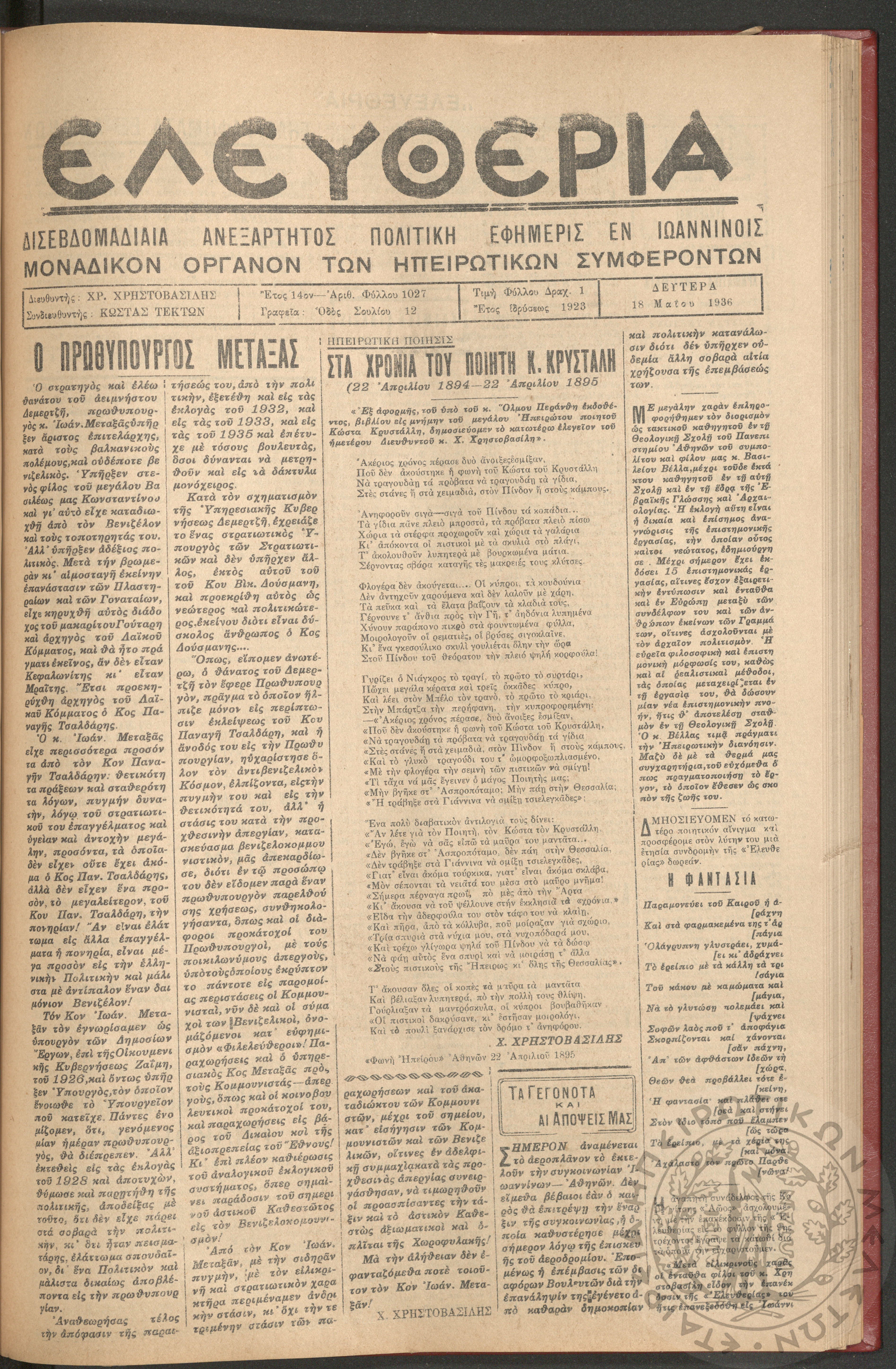 Ελευθερία: δισεβδομαδιαία Ηπειρωτική πολιτική εφημερίς, 1936, φ. 1027