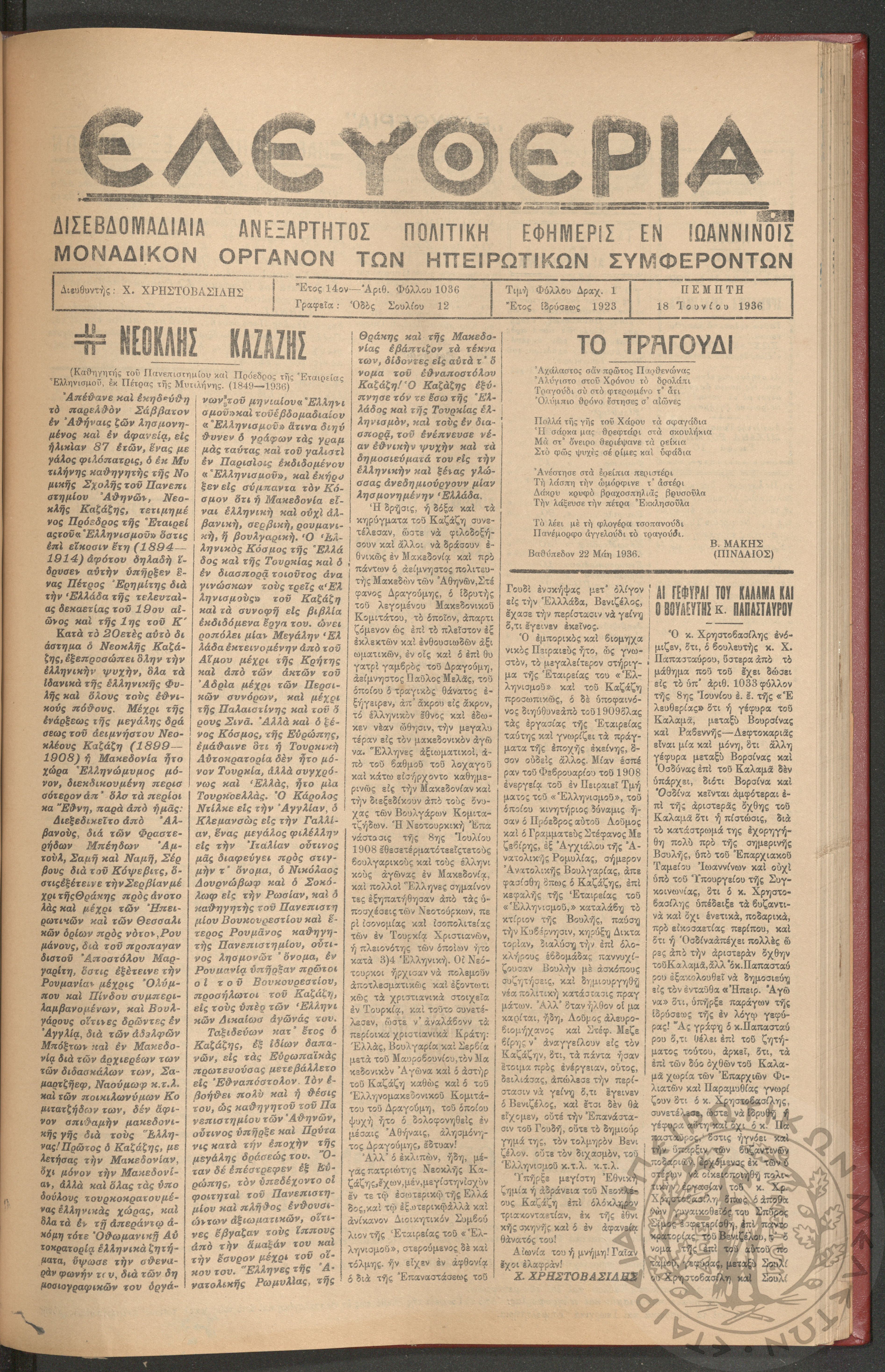 Ελευθερία: δισεβδομαδιαία Ηπειρωτική πολιτική εφημερίς, 1936, φ. 1036
