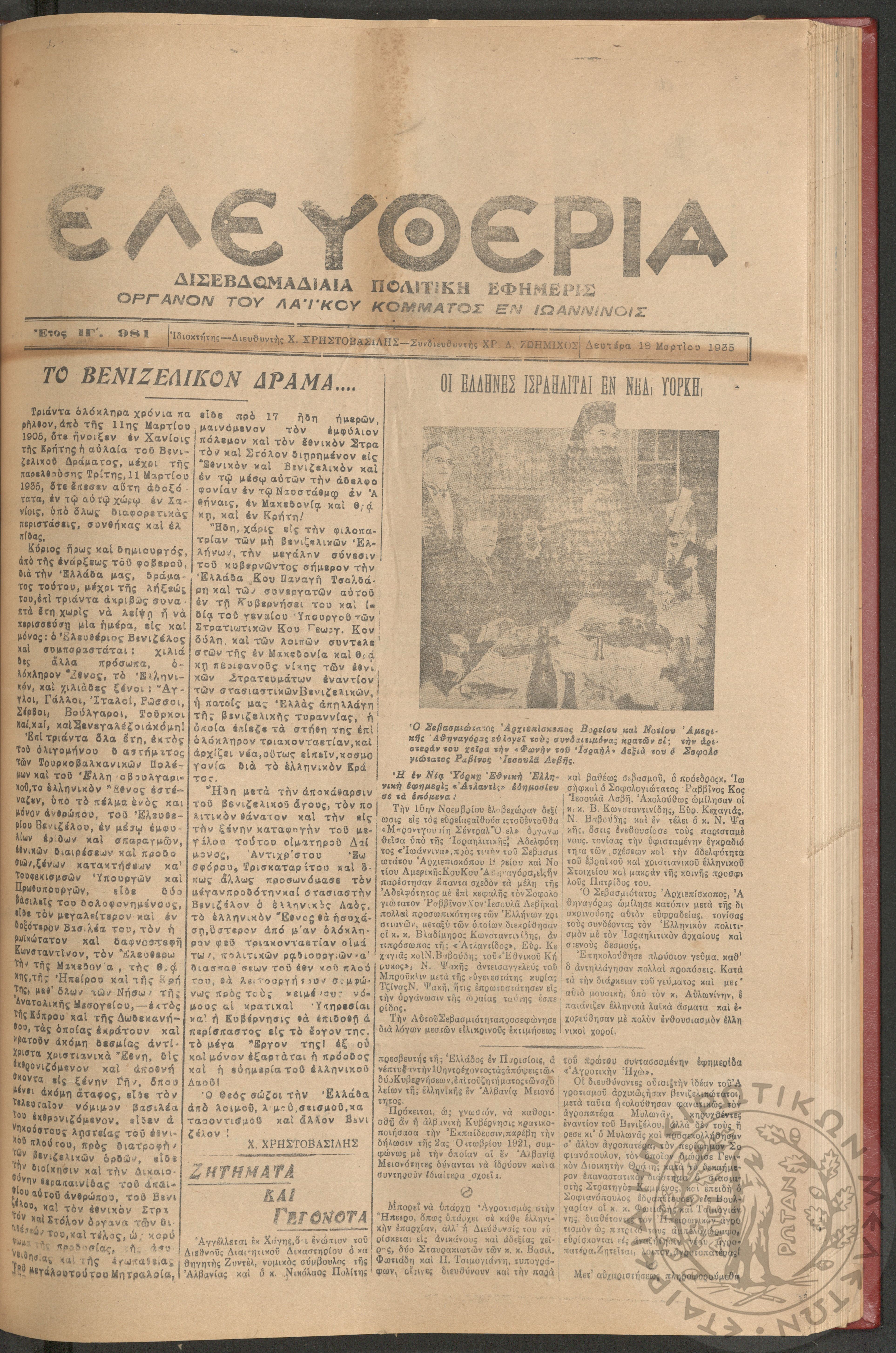 Ελευθερία: δισεβδομαδιαία Ηπειρωτική πολιτική εφημερίς, 1935, φ. 981