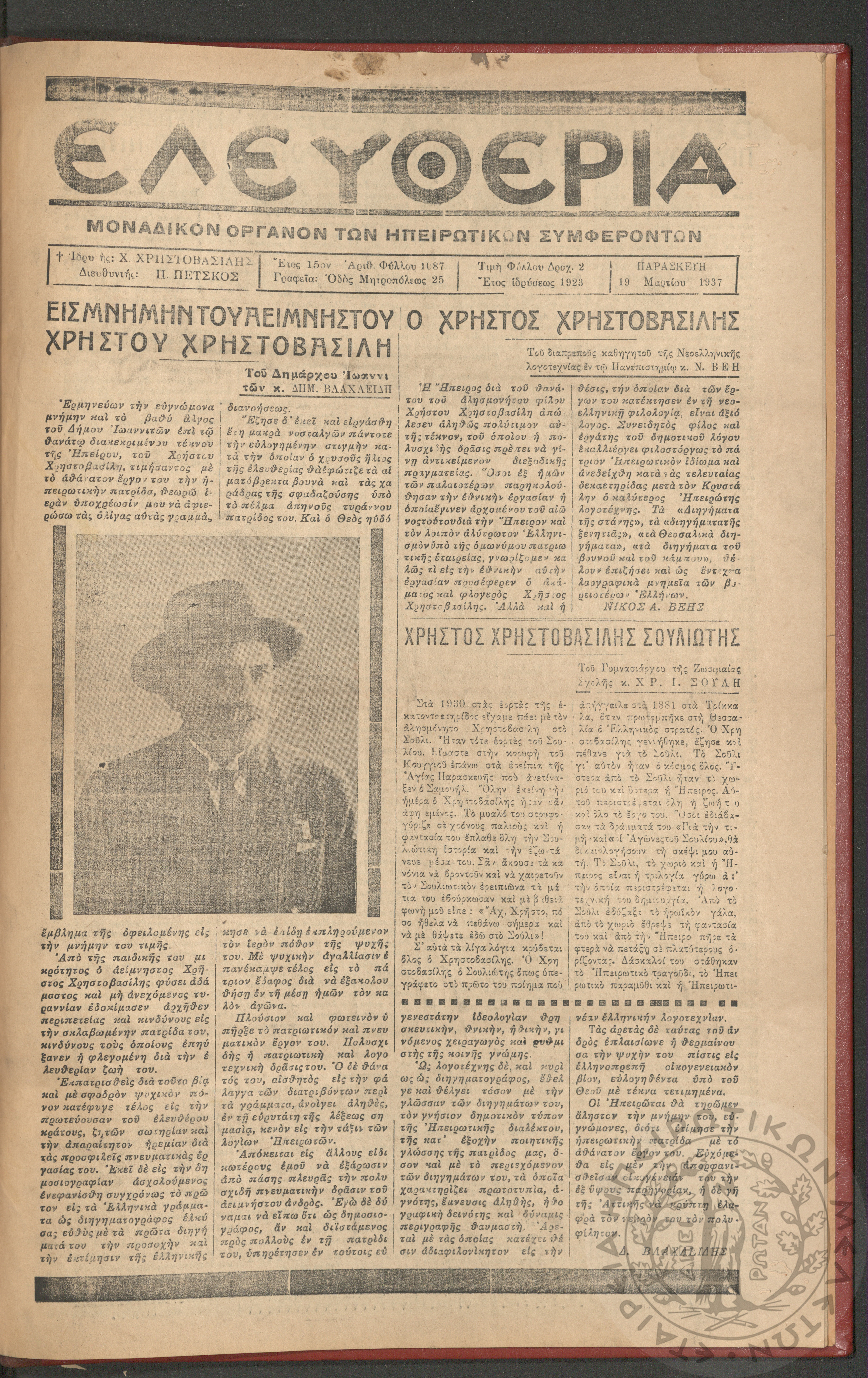 Ελευθερία: δισεβδομαδιαία Ηπειρωτική πολιτική εφημερίς, 1937, φ. 1087
