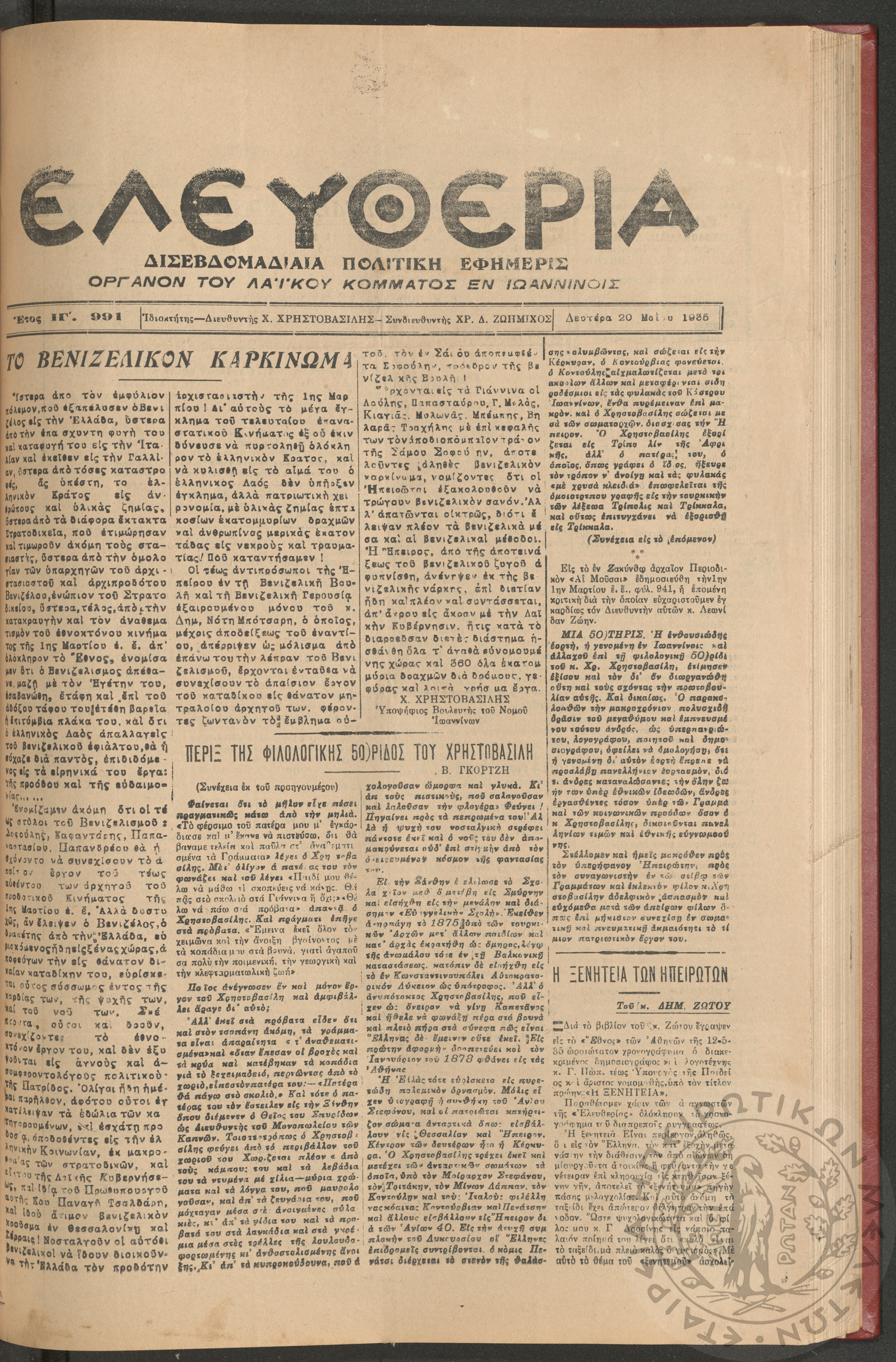 Ελευθερία: δισεβδομαδιαία Ηπειρωτική πολιτική εφημερίς, 1935, φ. 991
