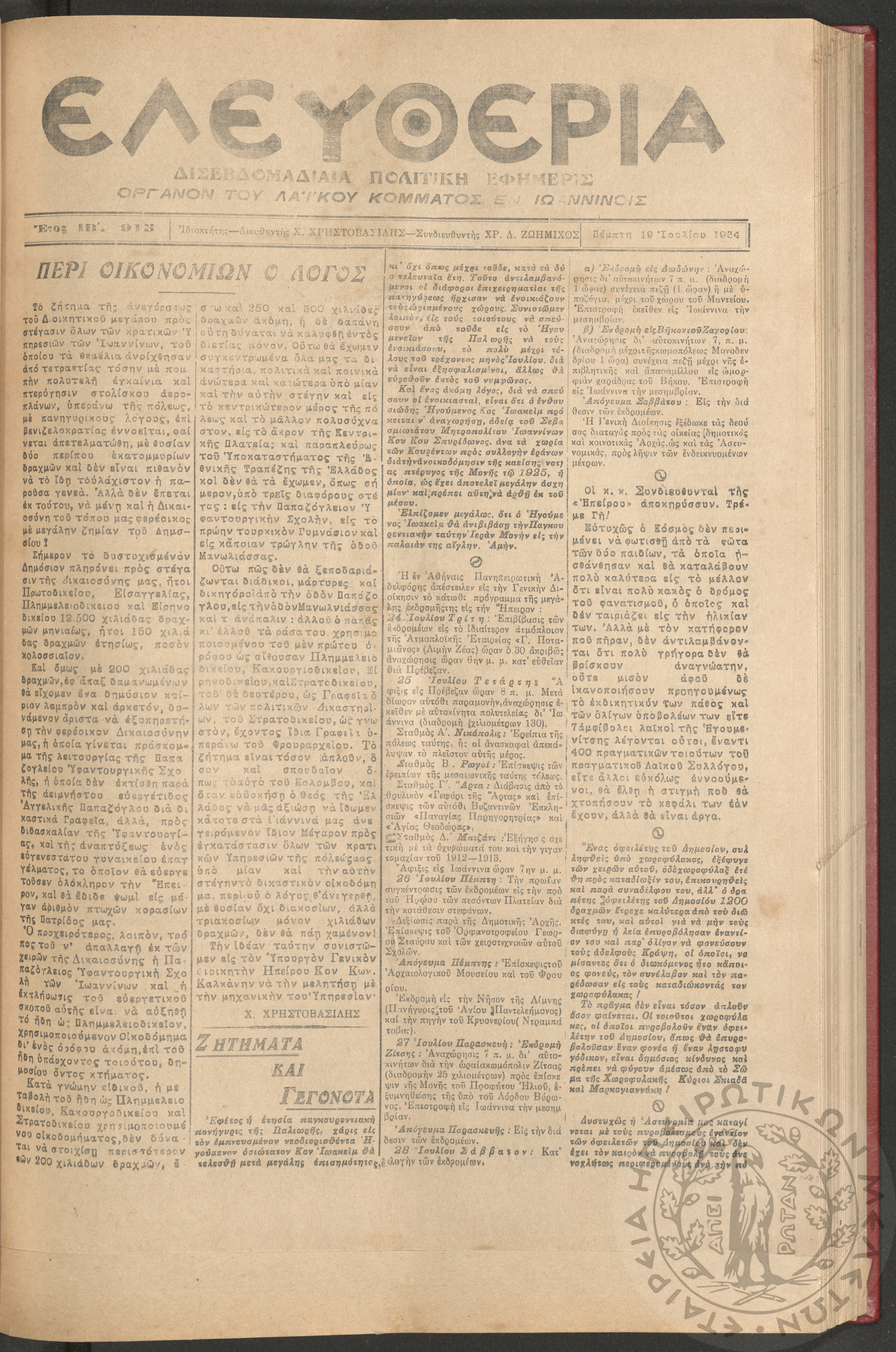 Ελευθερία: δισεβδομαδιαία Ηπειρωτική πολιτική εφημερίς, 1934, φ. 915