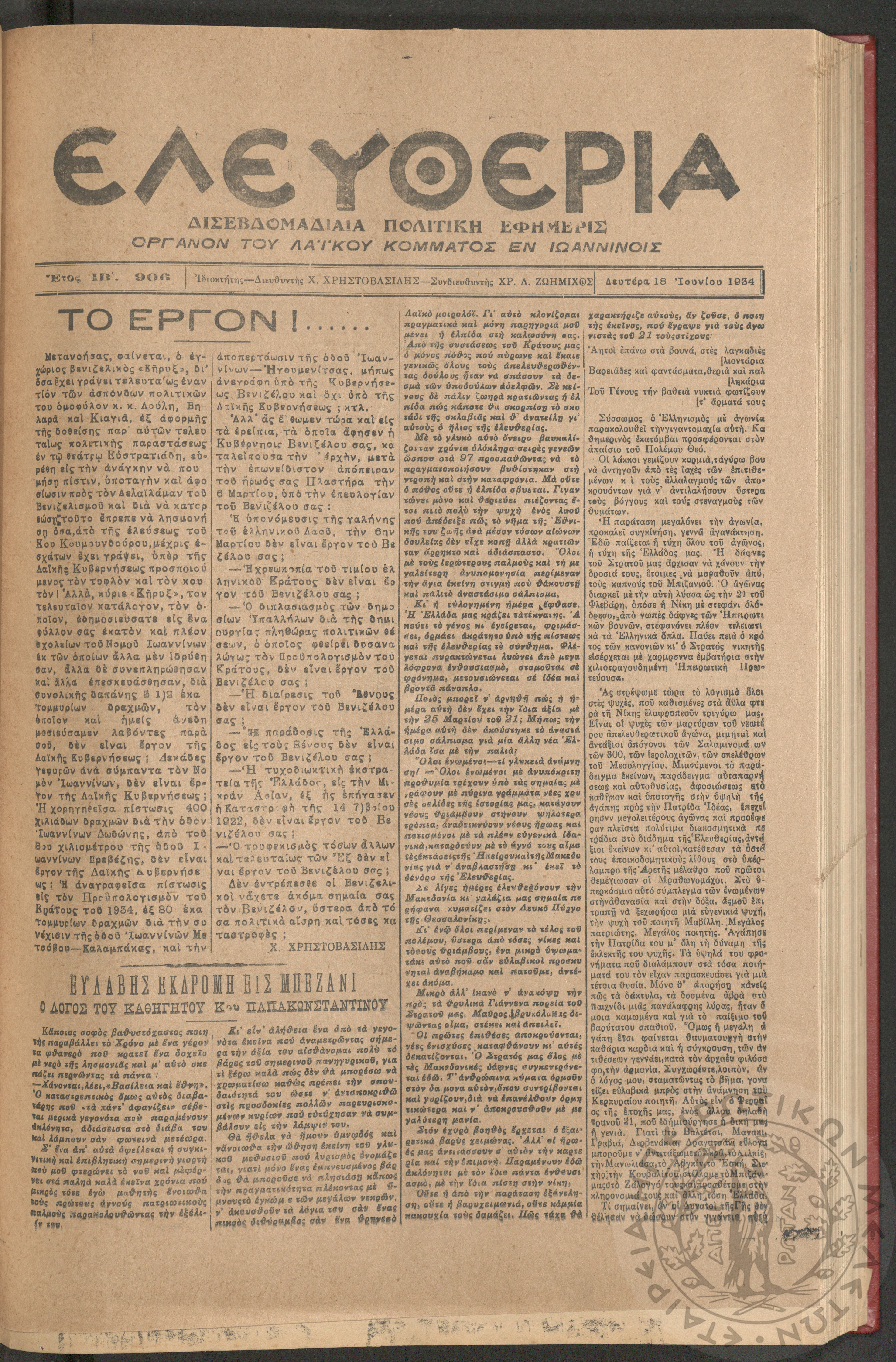 Ελευθερία: δισεβδομαδιαία Ηπειρωτική πολιτική εφημερίς, 1934, φ. 906