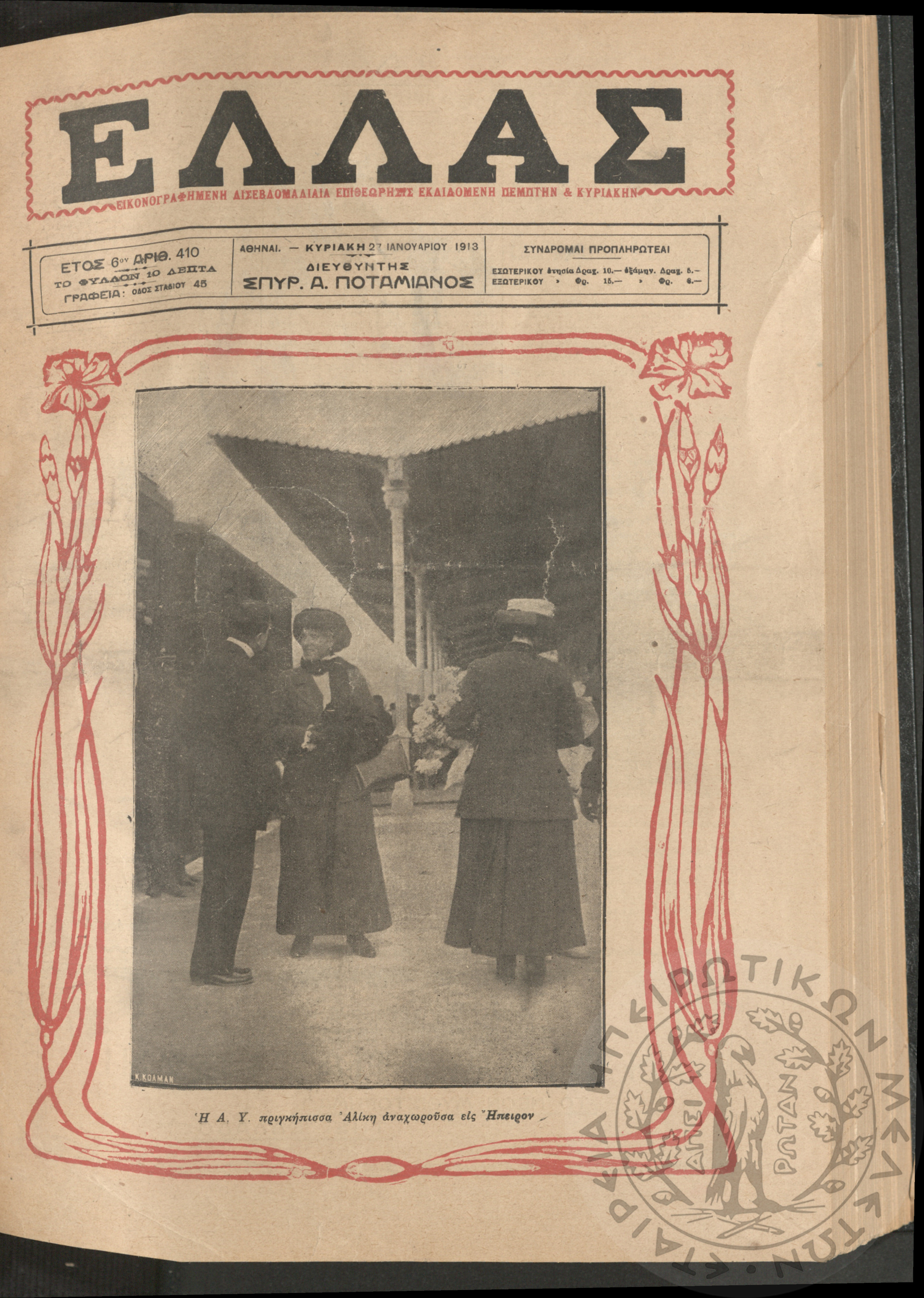 Ελλάς: εικονογραφημένη δισεβδομαδιαία επιθεώρησις εκδιδόμενη Πέμπτην και Κυριακήν (τεύχ. 410)Έτος ΣΤ΄, τεύχ. 410...