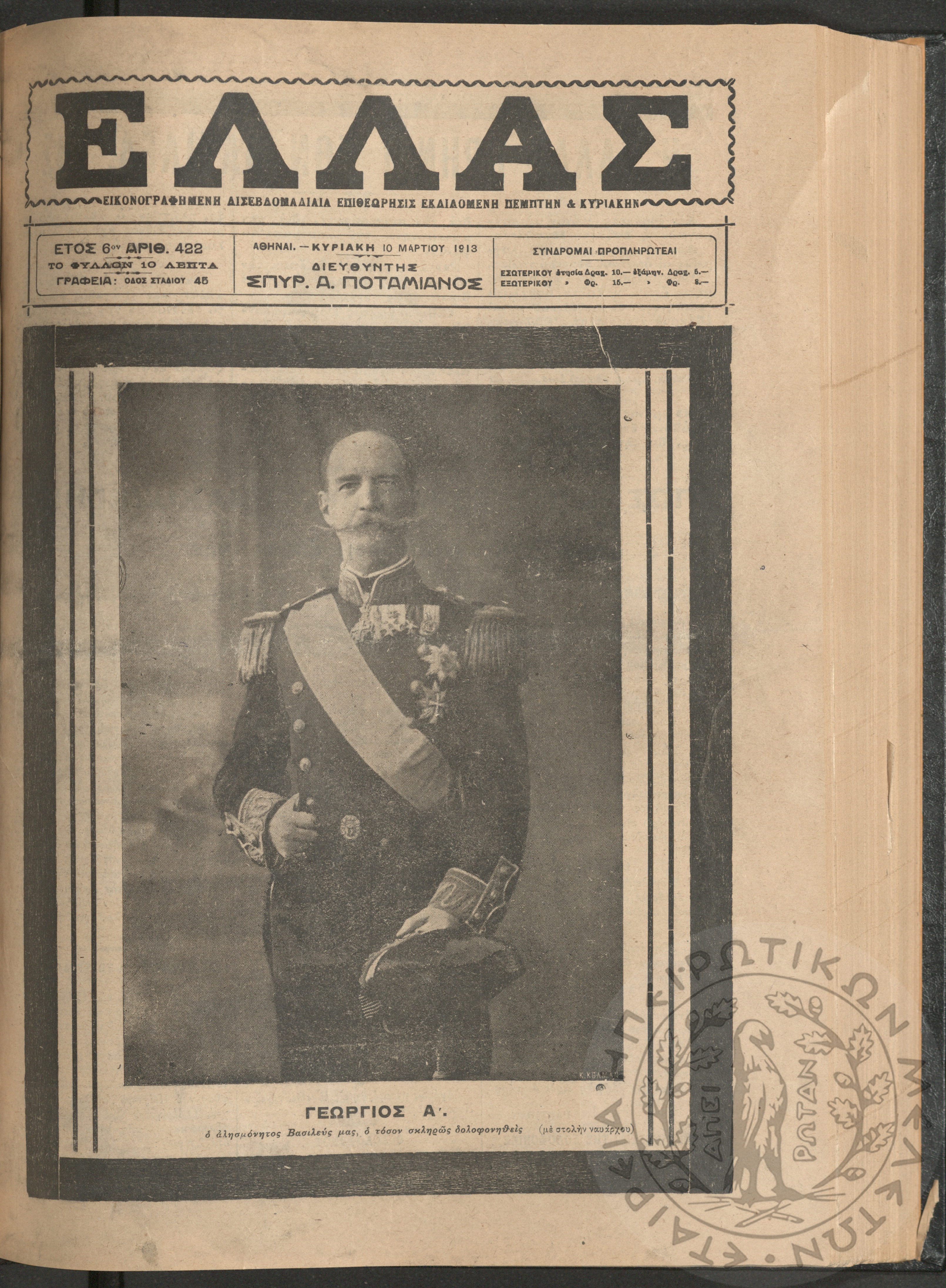 Ελλάς: εικονογραφημένη δισεβδομαδιαία επιθεώρησις εκδιδόμενη Πέμπτην και Κυριακήν (τεύχ. 422)Έτος ΣΤ΄, τεύχ. 422...