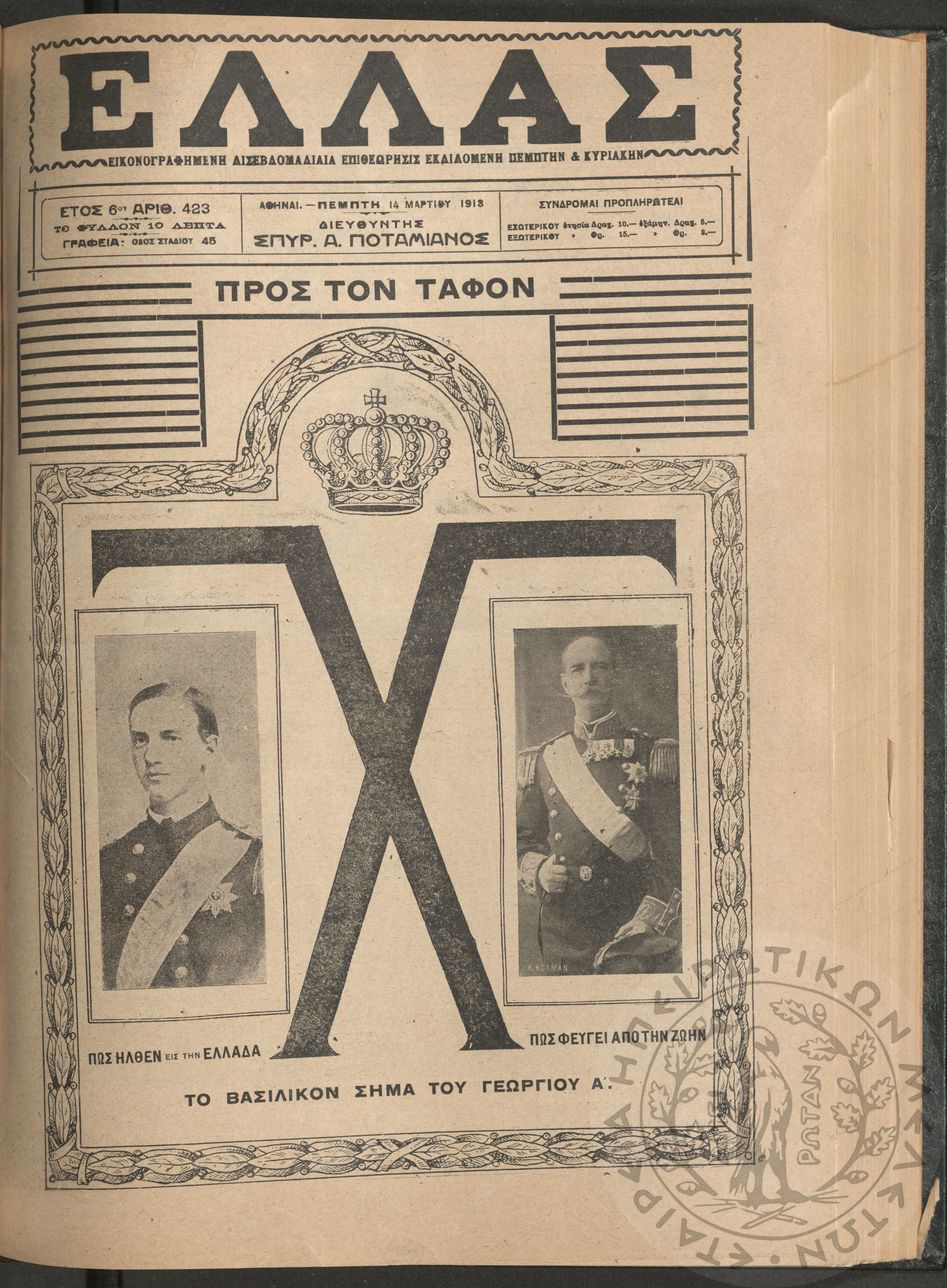 Ελλάς: εικονογραφημένη δισεβδομαδιαία επιθεώρησις εκδιδόμενη Πέμπτην και Κυριακήν (τεύχ. 423)Έτος ΣΤ΄, τεύχ. 423...