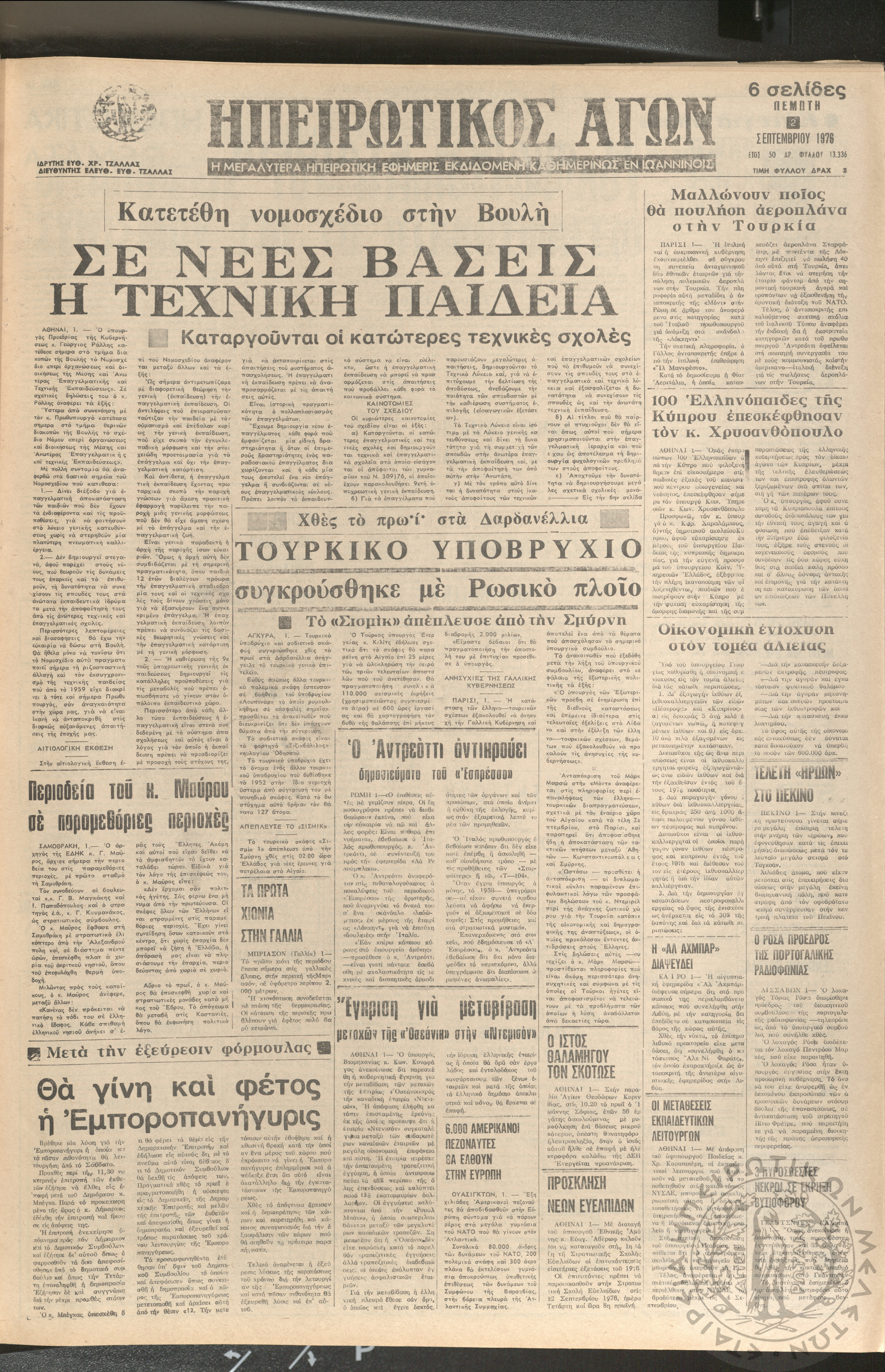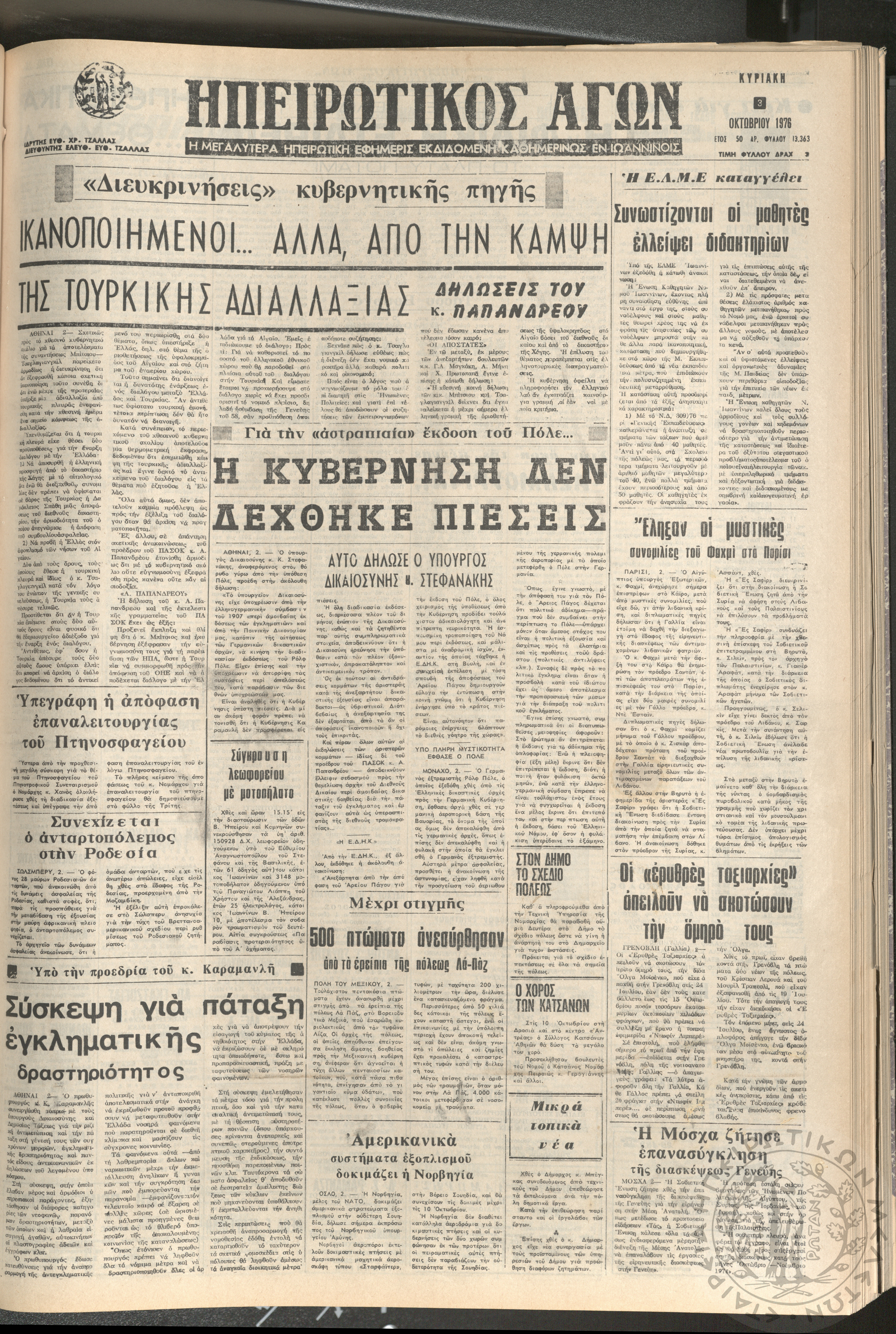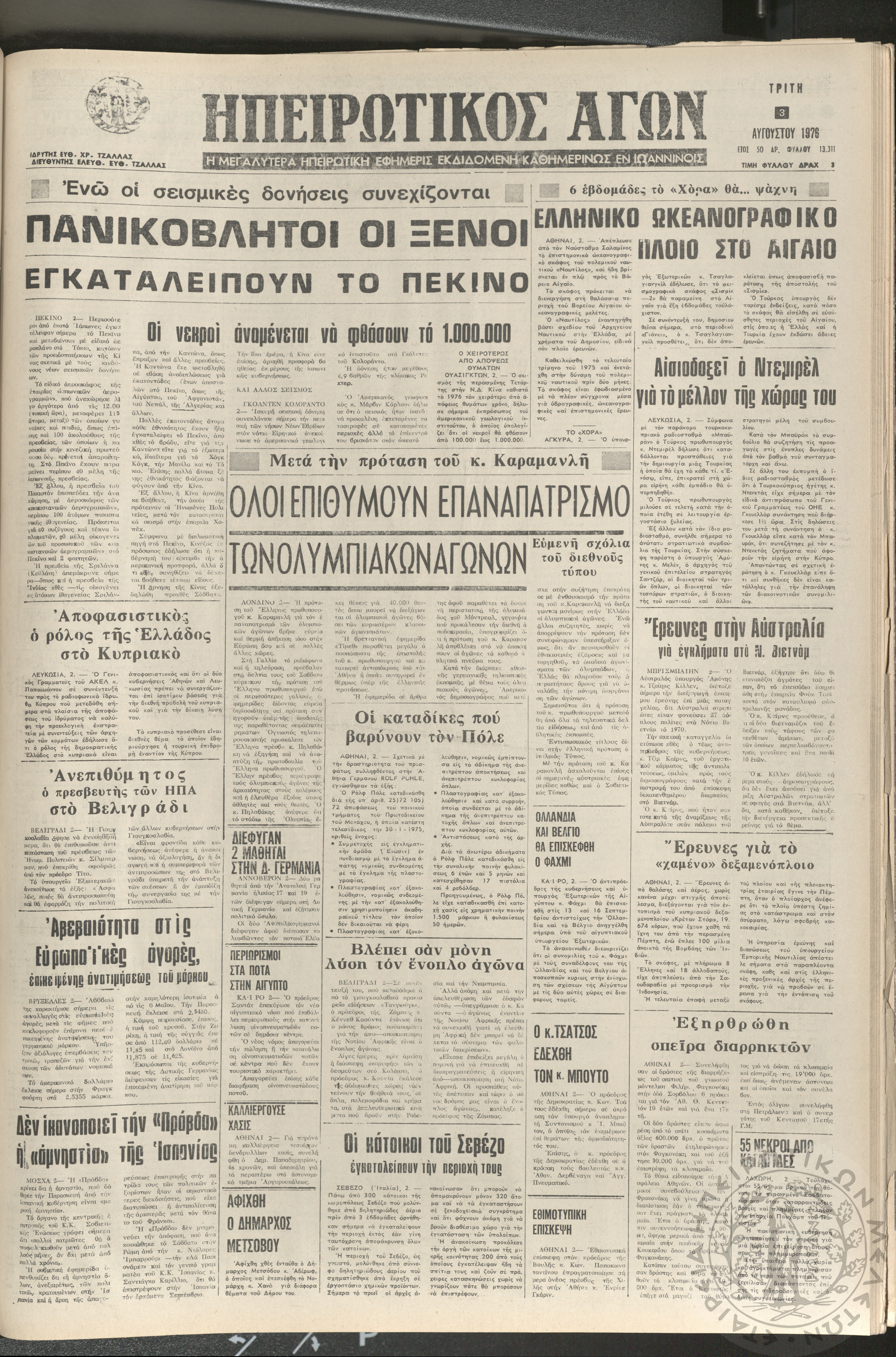 Ηπειρωτικός Αγών: η μεγαλυτέρα ηπειρωτική εφημερίς εκδιδόμενη καθημερινώς εν Ιωαννίνοις 1976 (φ. 13363)Έτος 50, φ. 13363...