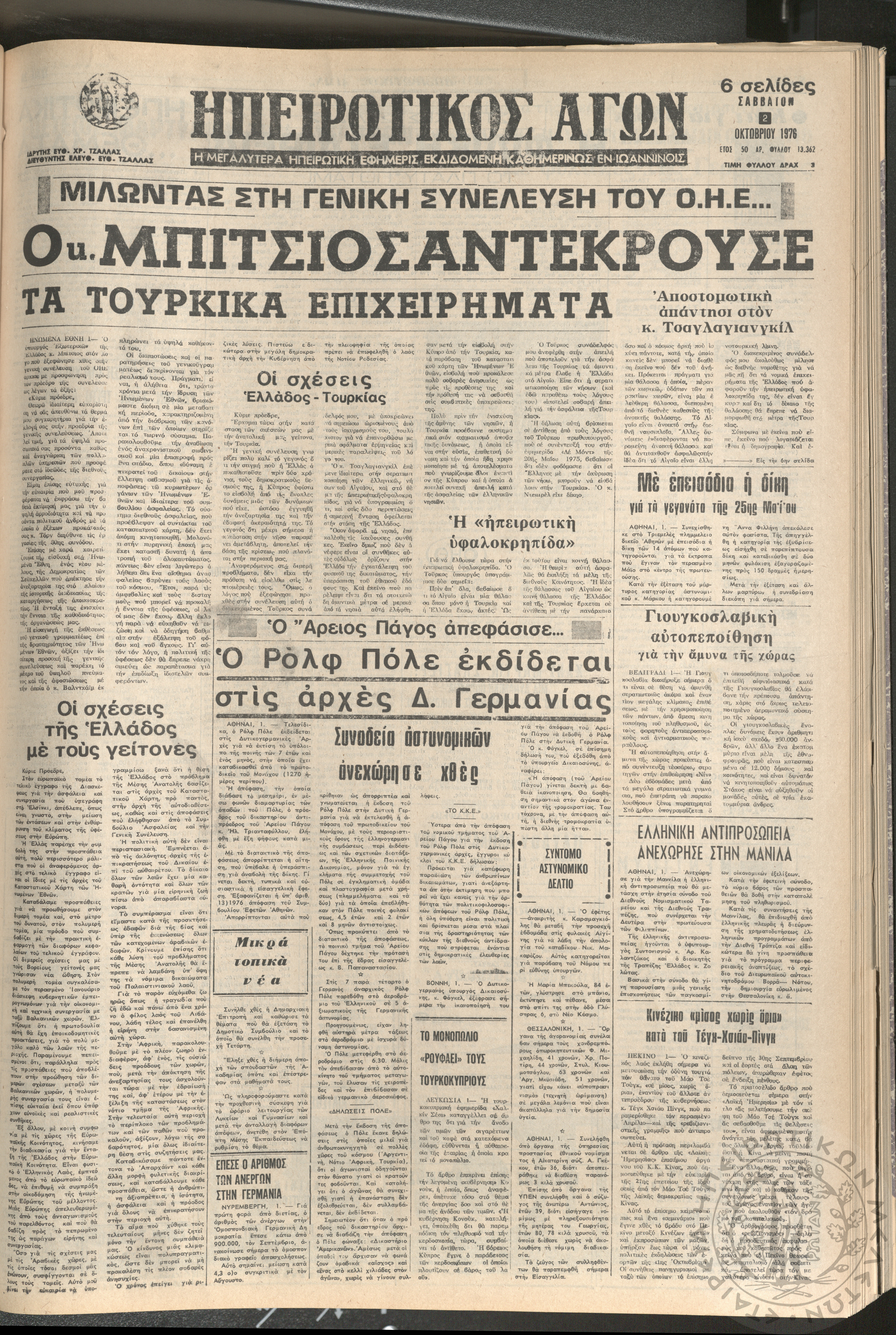 Ηπειρωτικός Αγών: η μεγαλυτέρα ηπειρωτική εφημερίς εκδιδόμενη καθημερινώς εν Ιωαννίνοις 1976 (φ. 13388)Έτος 50, φ. 13388...