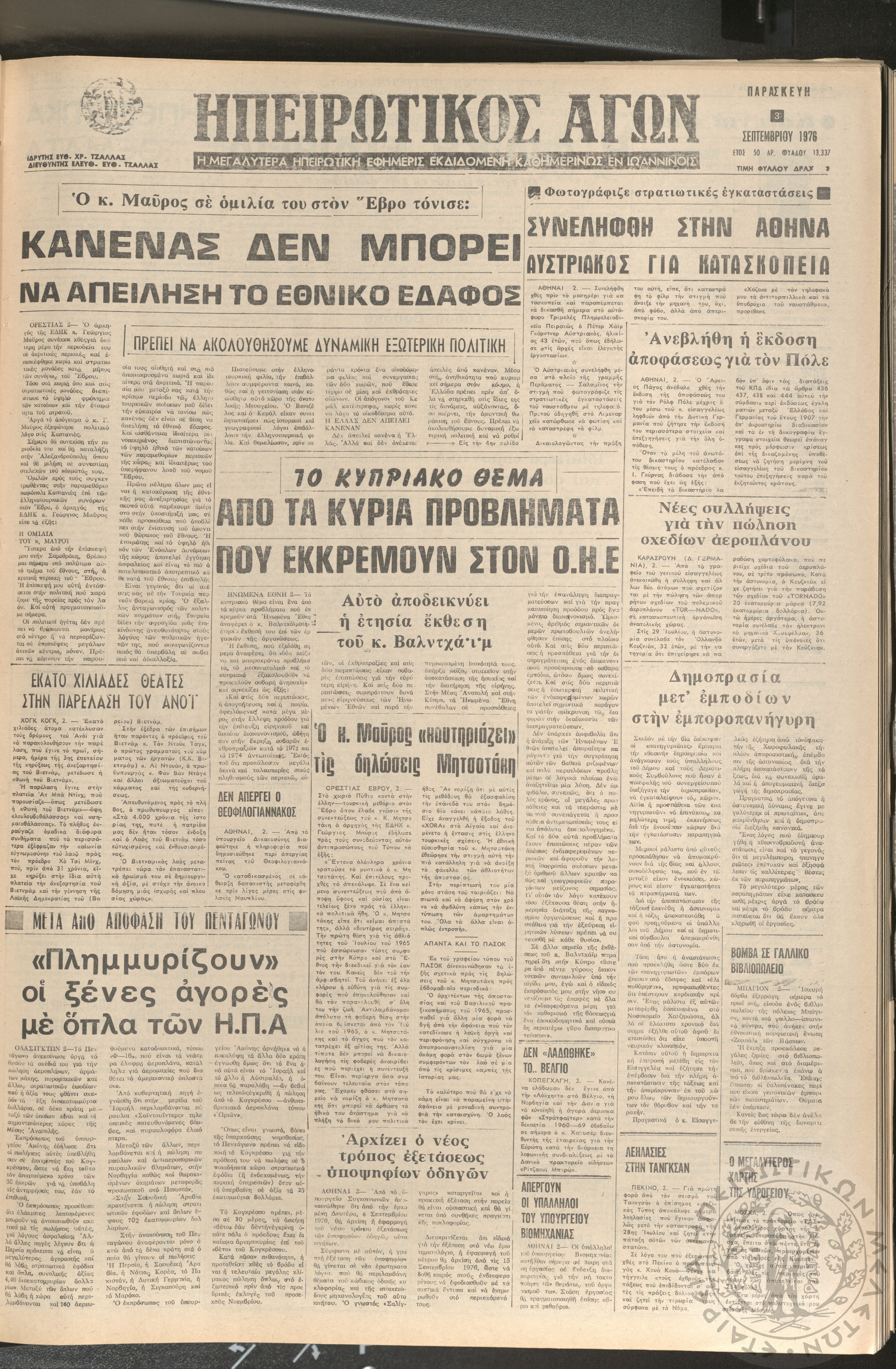 Ηπειρωτικός Αγών: η μεγαλυτέρα ηπειρωτική εφημερίς εκδιδόμενη καθημερινώς εν Ιωαννίνοις 1976 (φ. 13337)Έτος 50, φ. 13337...