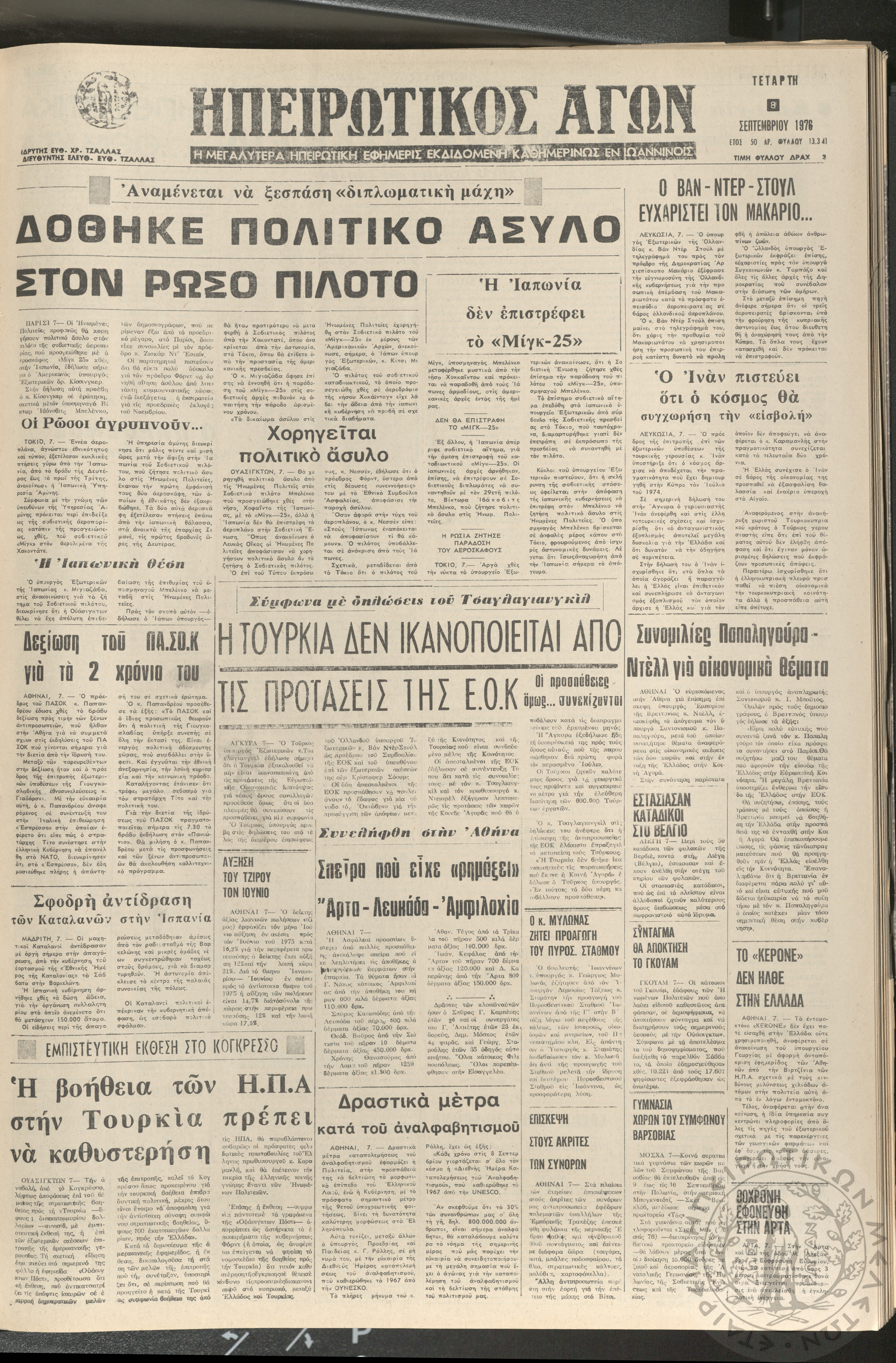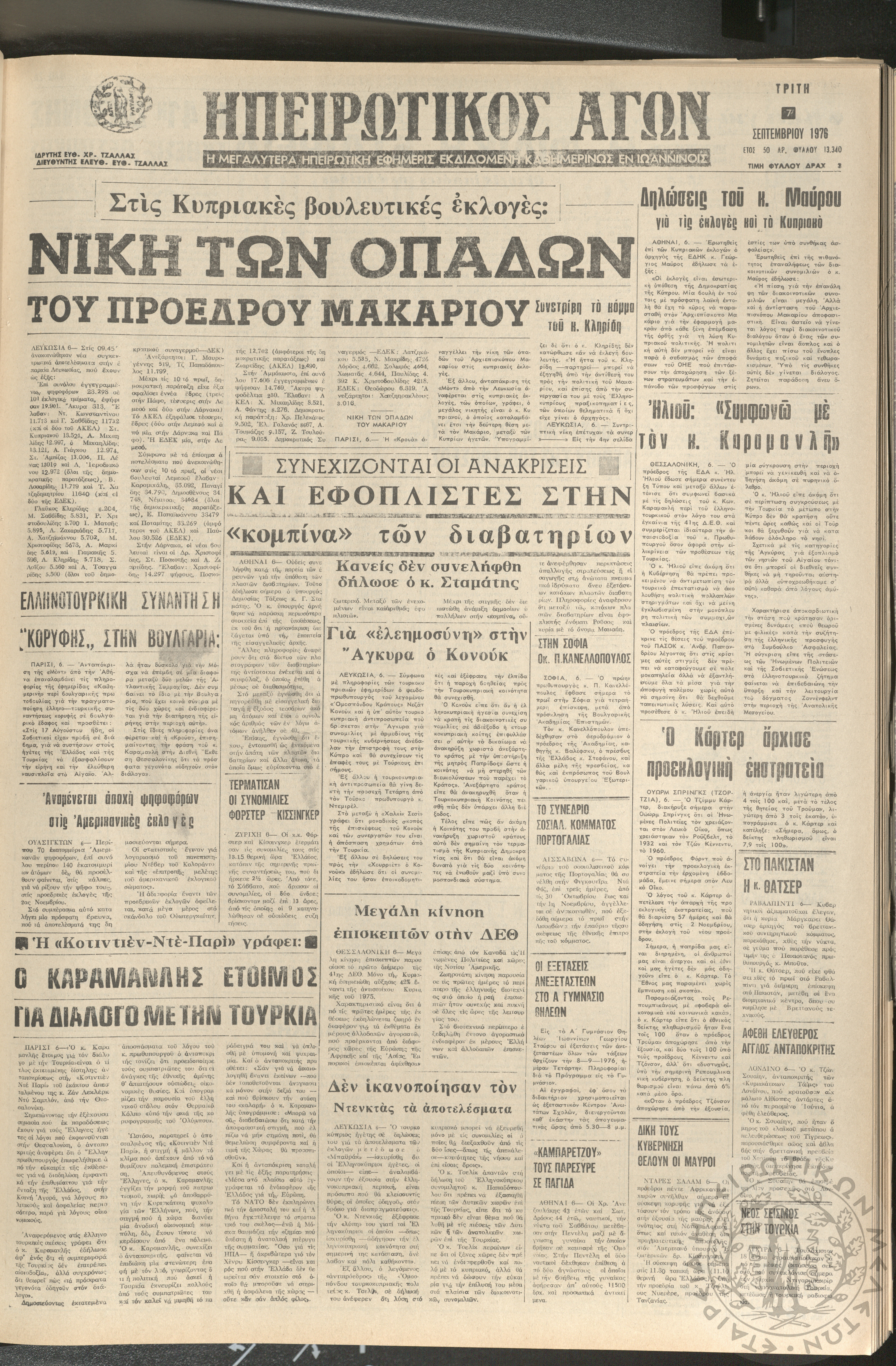 Ηπειρωτικός Αγών: η μεγαλυτέρα ηπειρωτική εφημερίς εκδιδόμενη καθημερινώς εν Ιωαννίνοις 1976 (φ. 13340)Έτος 50, φ. 13340...