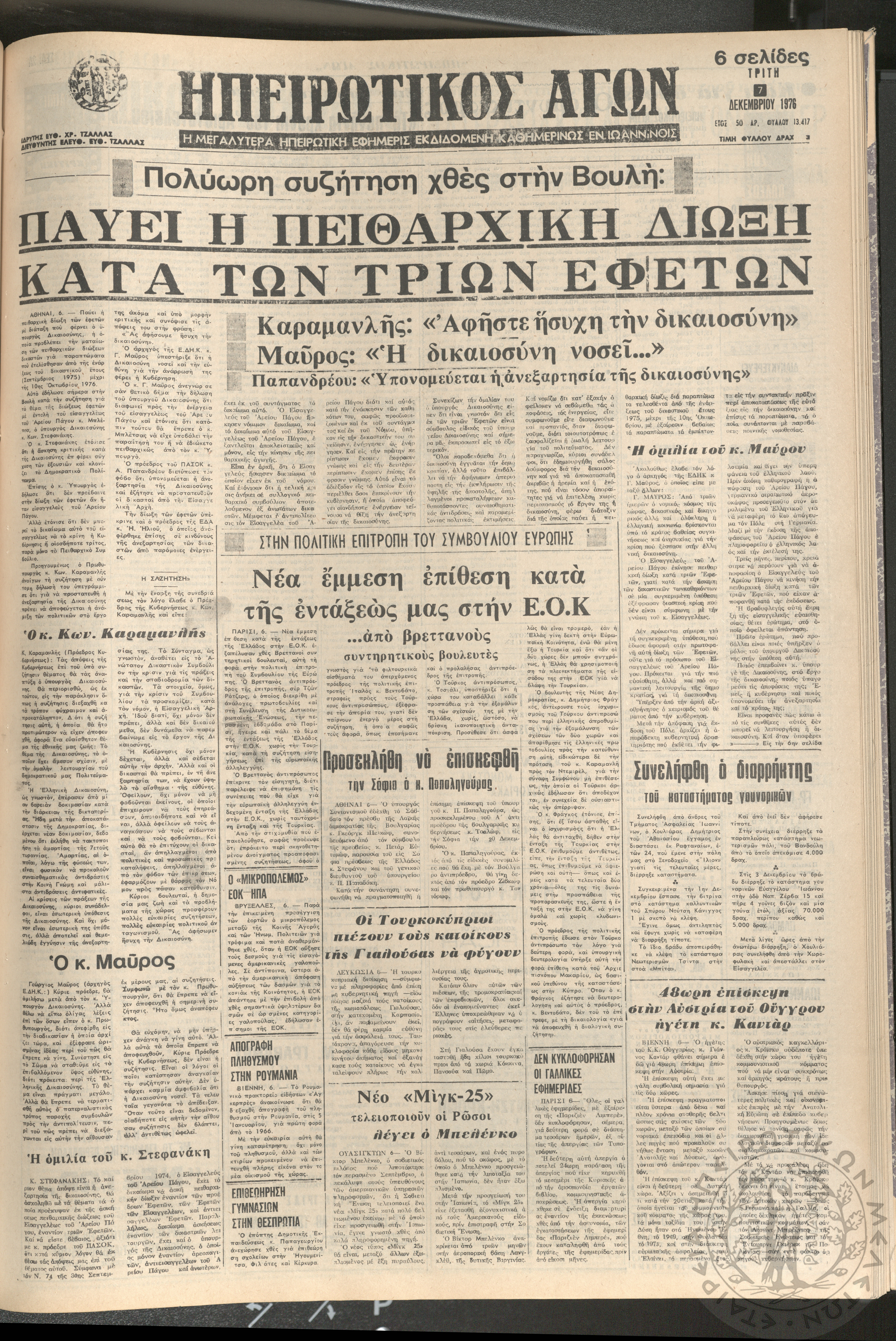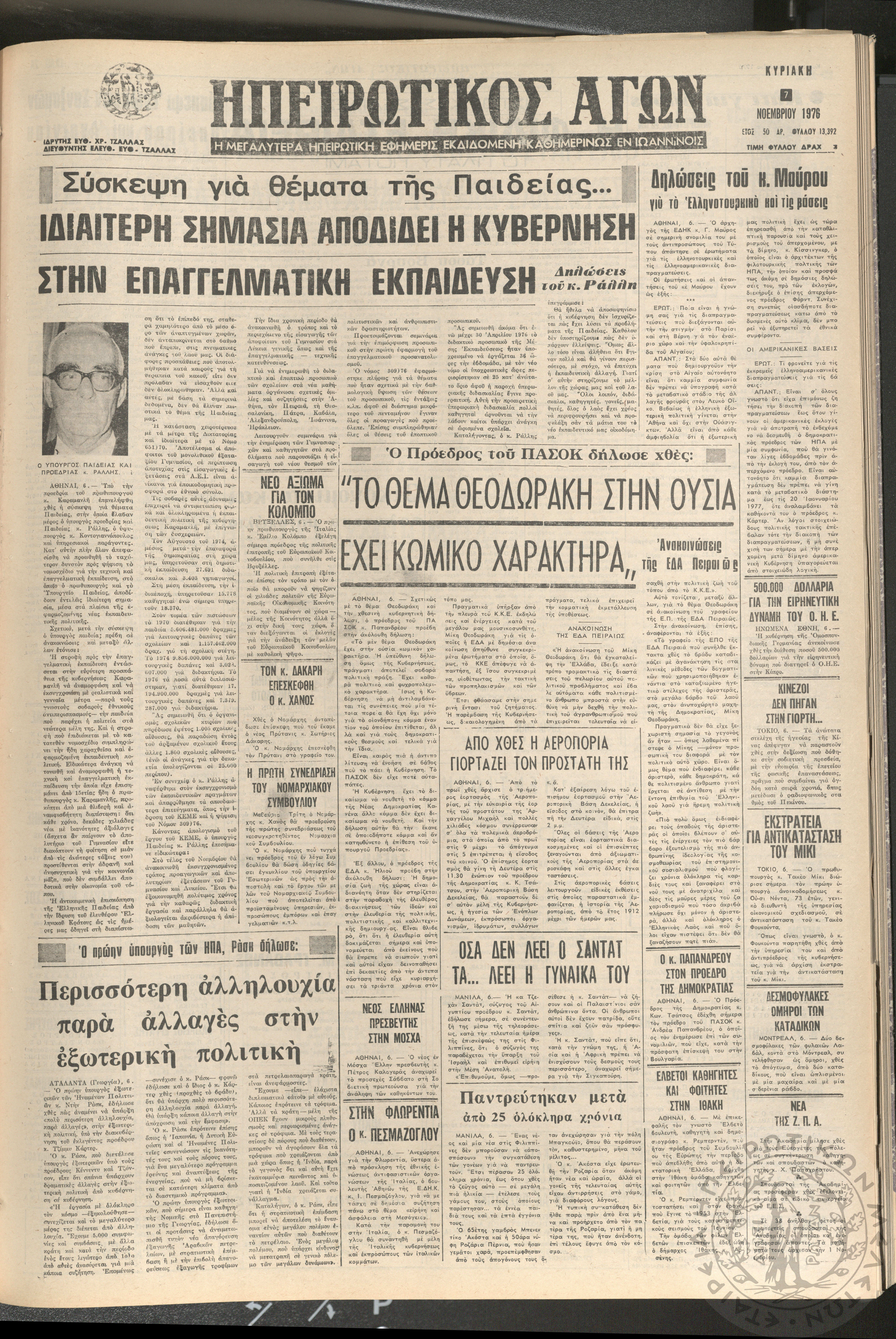 Ηπειρωτικός Αγών: η μεγαλυτέρα ηπειρωτική εφημερίς εκδιδόμενη καθημερινώς εν Ιωαννίνοις 1976 (φ. 13392)Έτος 50, φ. 13392...