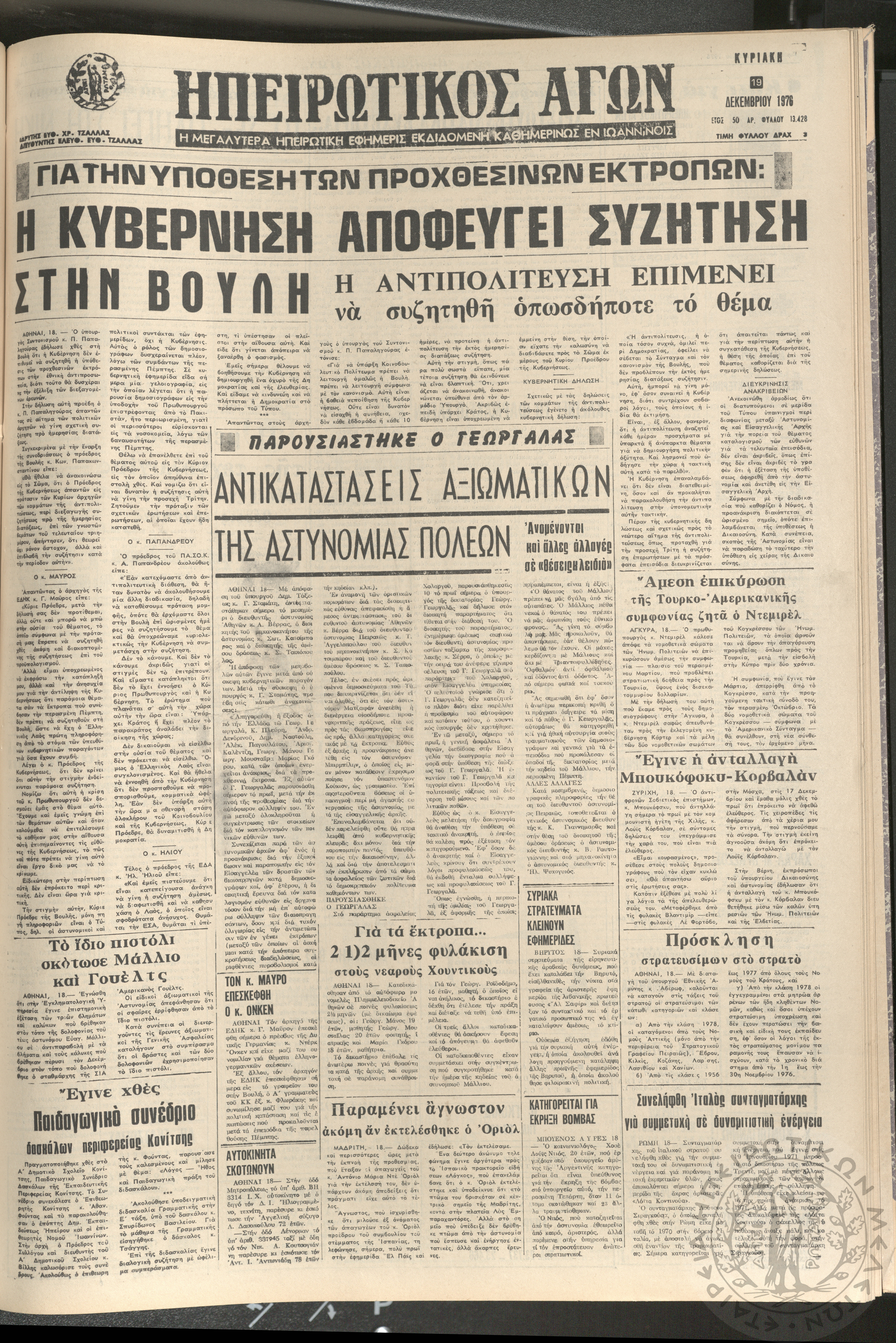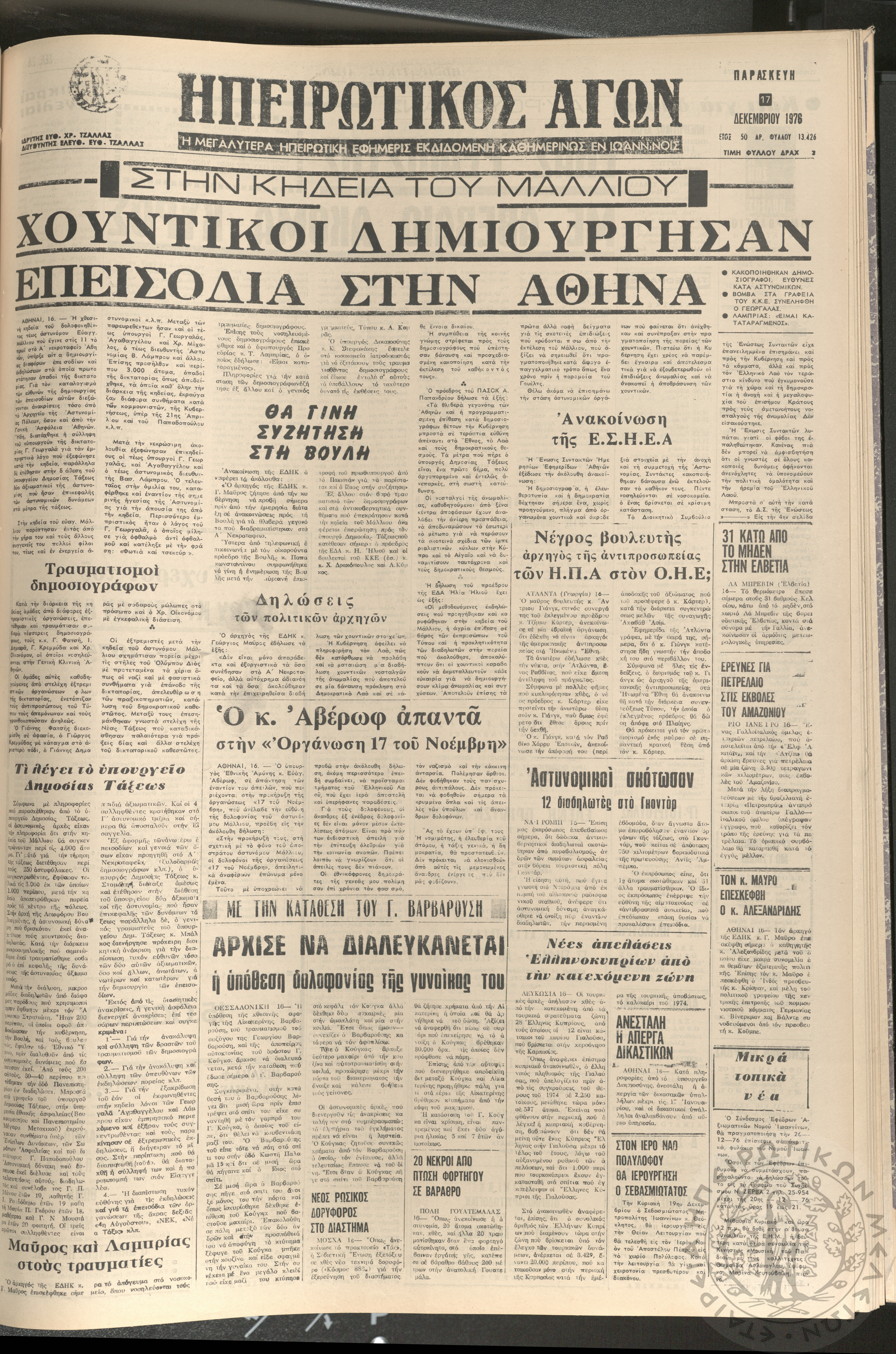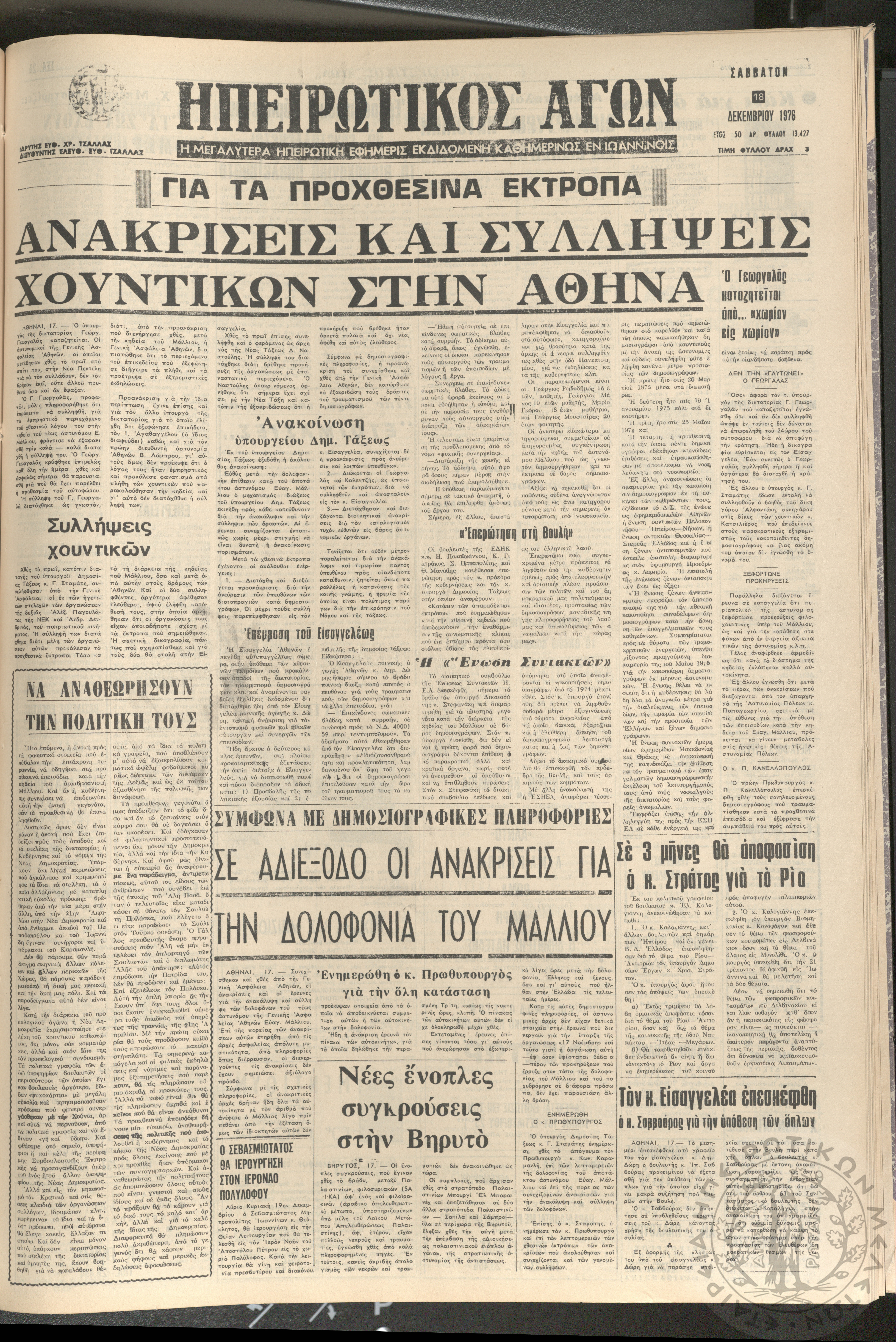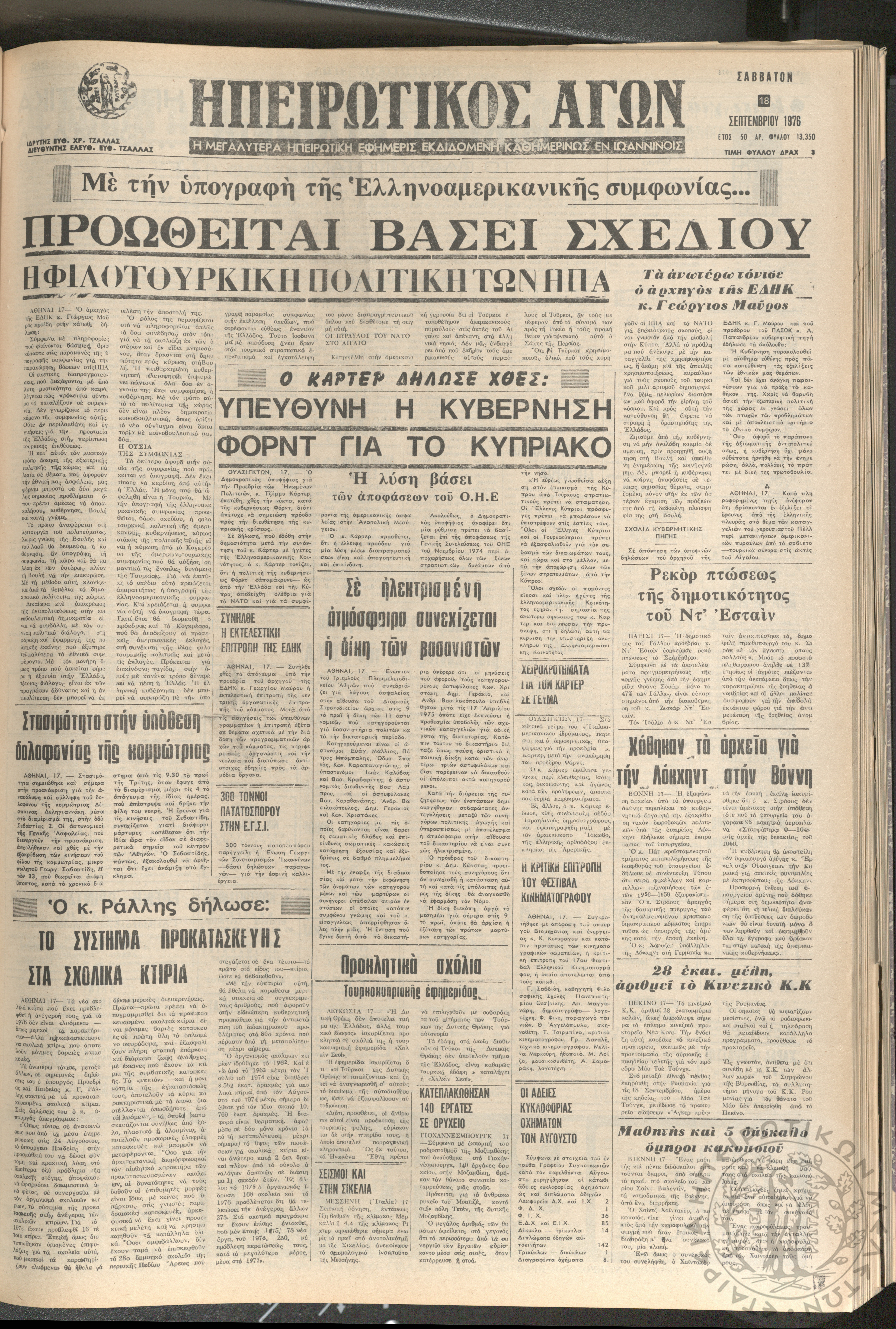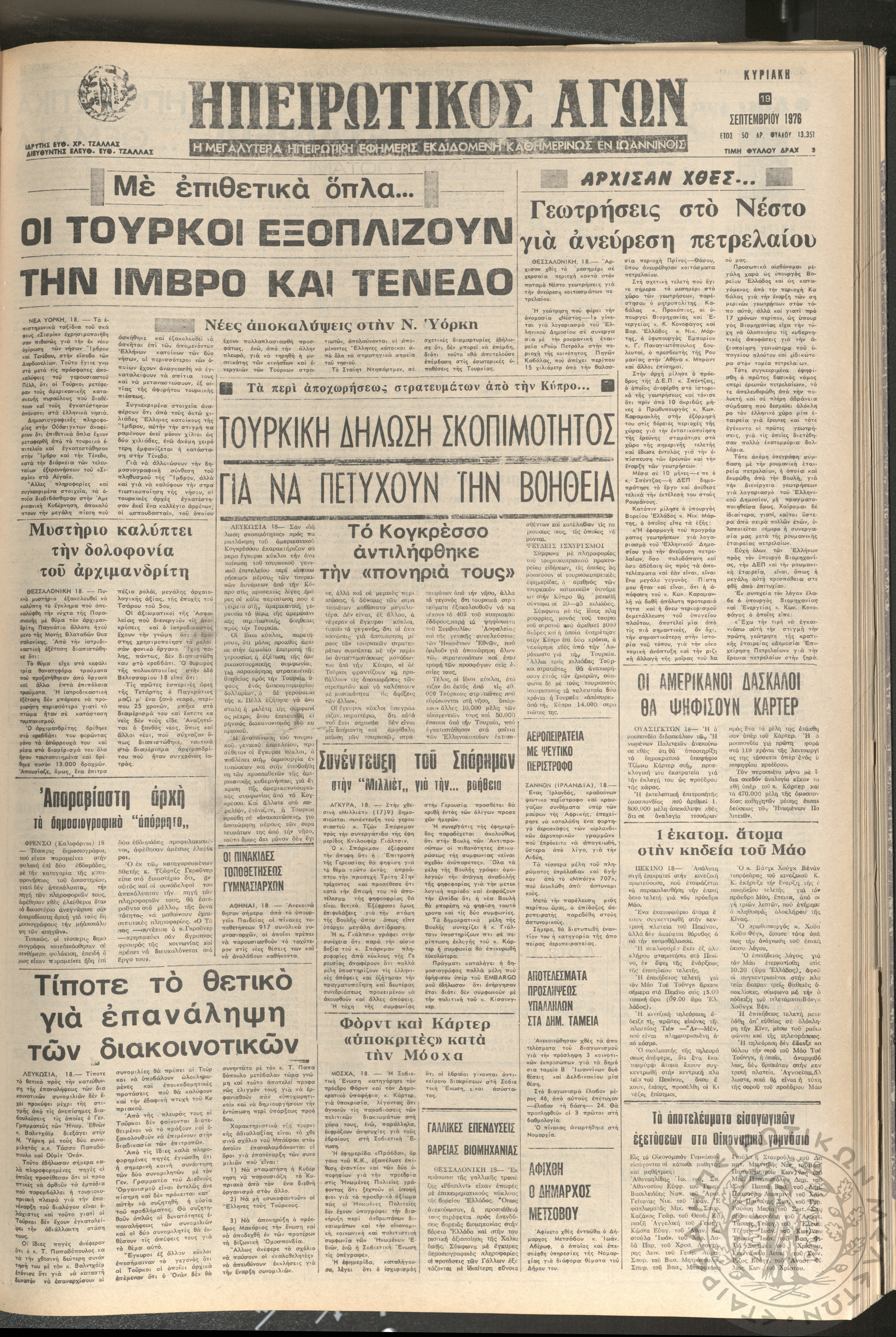 Ηπειρωτικός Αγών: η μεγαλυτέρα ηπειρωτική εφημερίς εκδιδόμενη καθημερινώς εν Ιωαννίνοις 1976 (φ. 13428)Έτος 50, φ. 13428...