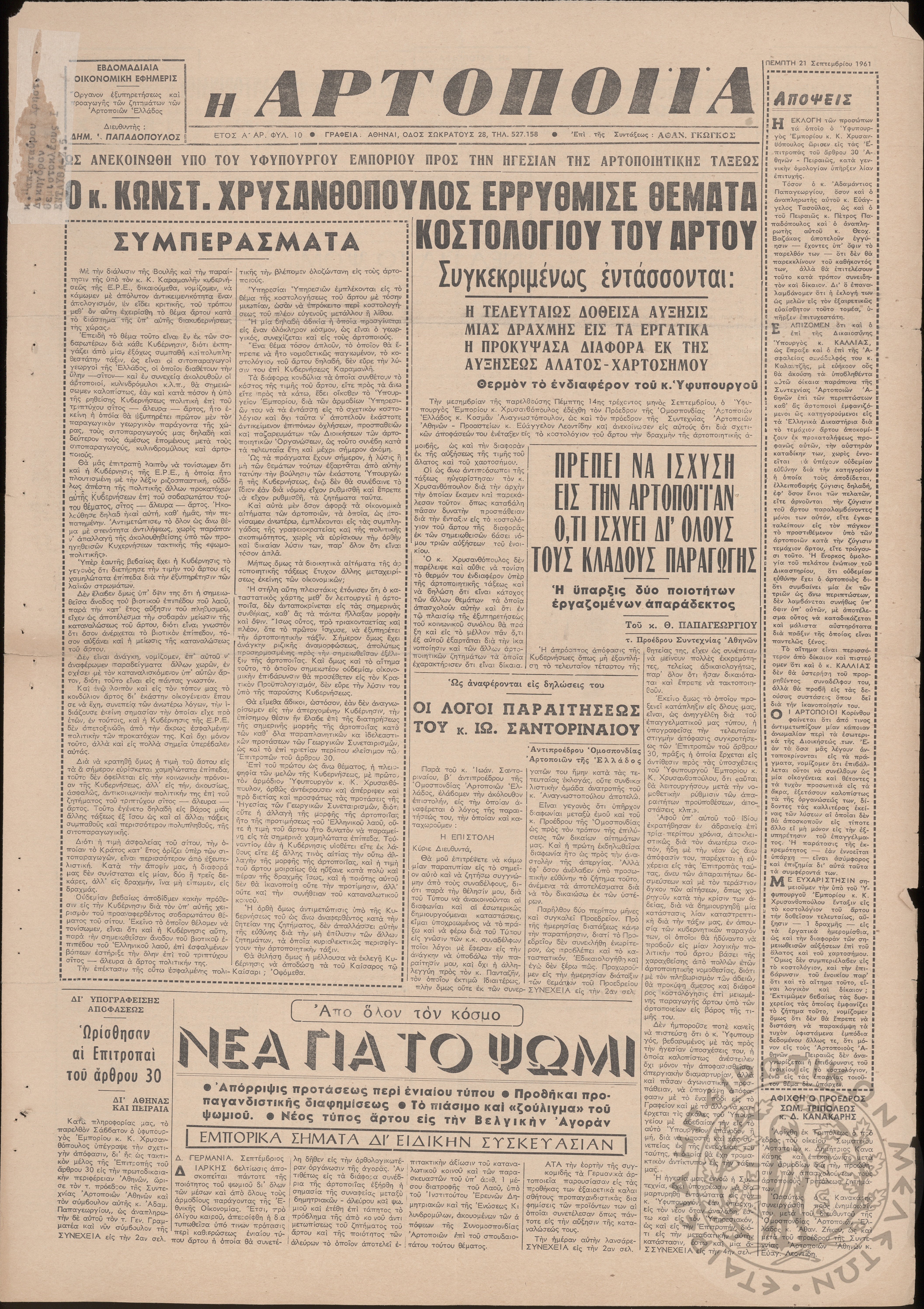 Η Αρτοποιία: εβδομαδιαία οικονομική εφημερίς, όργανον εξυπηρέτησεως και προαγωγής των ζητημάτων των αρτοποιών της Ελλάδας, 1961, φ. 10Έτος Α΄, φ. 10...