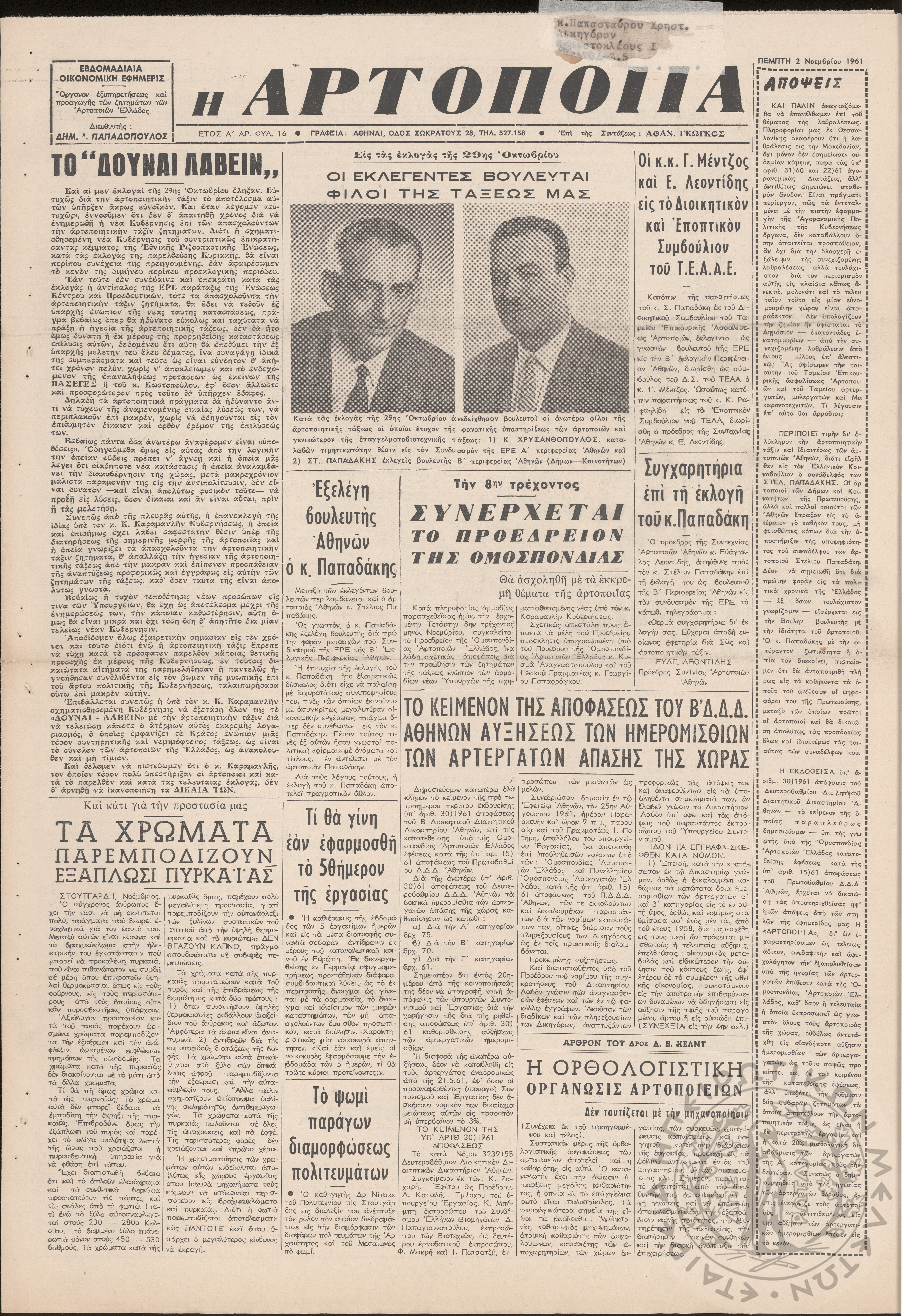 Η Αρτοποιία: εβδομαδιαία οικονομική εφημερίς, όργανον εξυπηρέτησεως και προαγωγής των ζητημάτων των αρτοποιών της Ελλάδας, 1961, φ. 16Έτος Α΄, φ. 16...