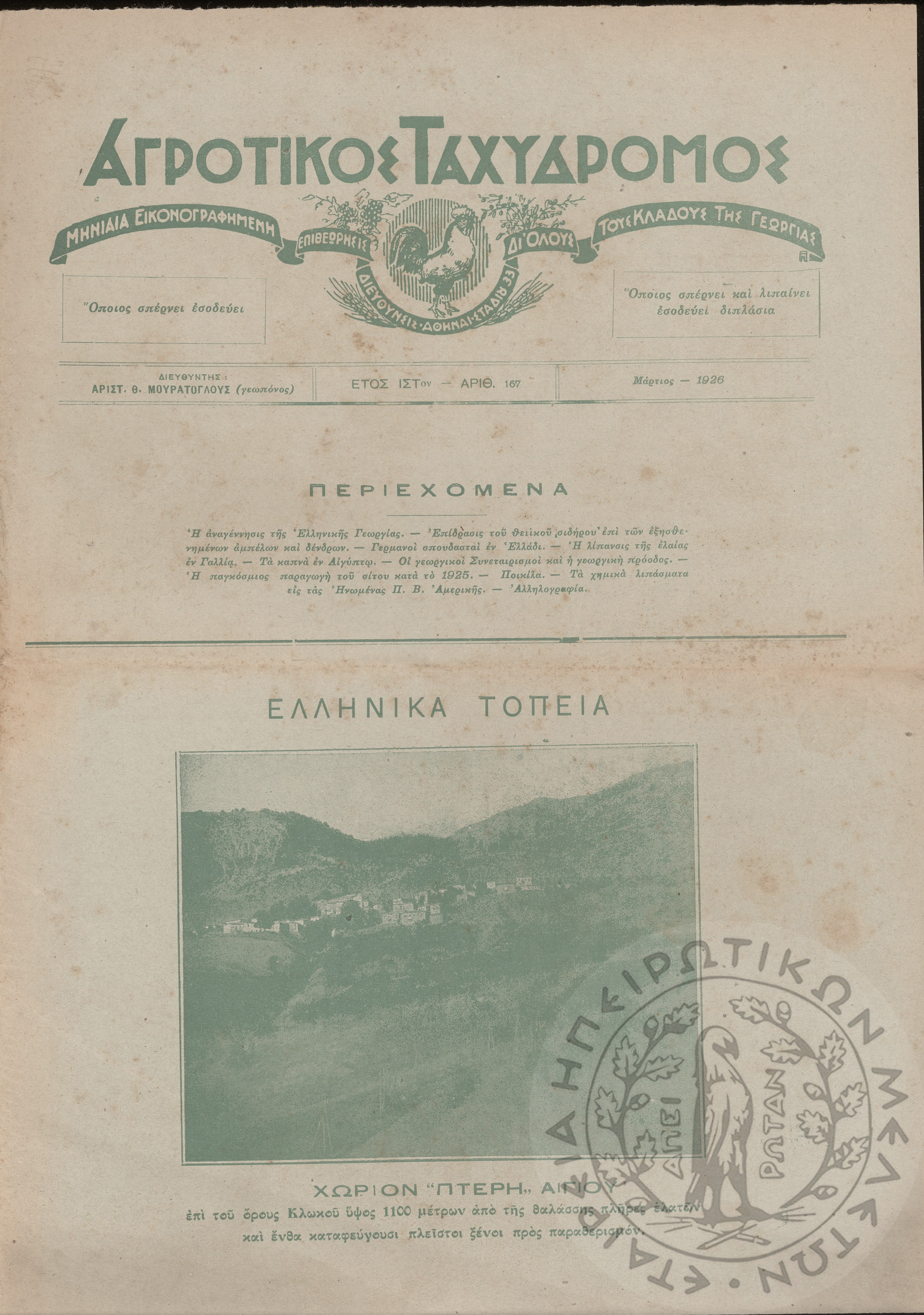 Αγροτικός ταχυδρόμος: μηνιαίον εικονογραφημένον περιοδικόν δι' όλους τους κλάδους της γεωργίας (τεύχ. 167)Έτος ΙΣΤ', τεύχ. 167...