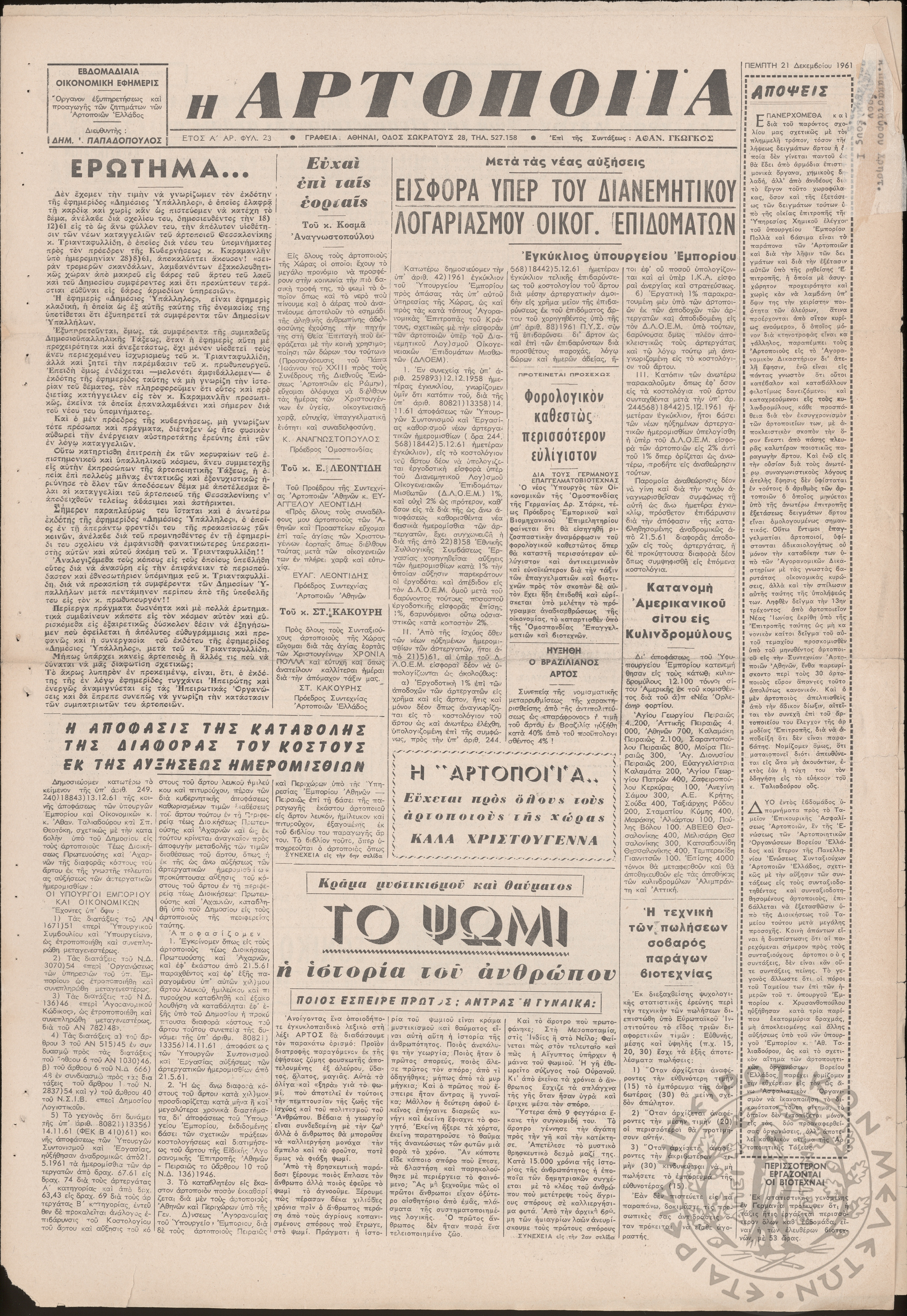 Η Αρτοποιία: εβδομαδιαία οικονομική εφημερίς, όργανον εξυπηρέτησεως και προαγωγής των ζητημάτων των αρτοποιών της Ελλάδας, 1961, φ. 23Έτος Α΄, φ. 23...