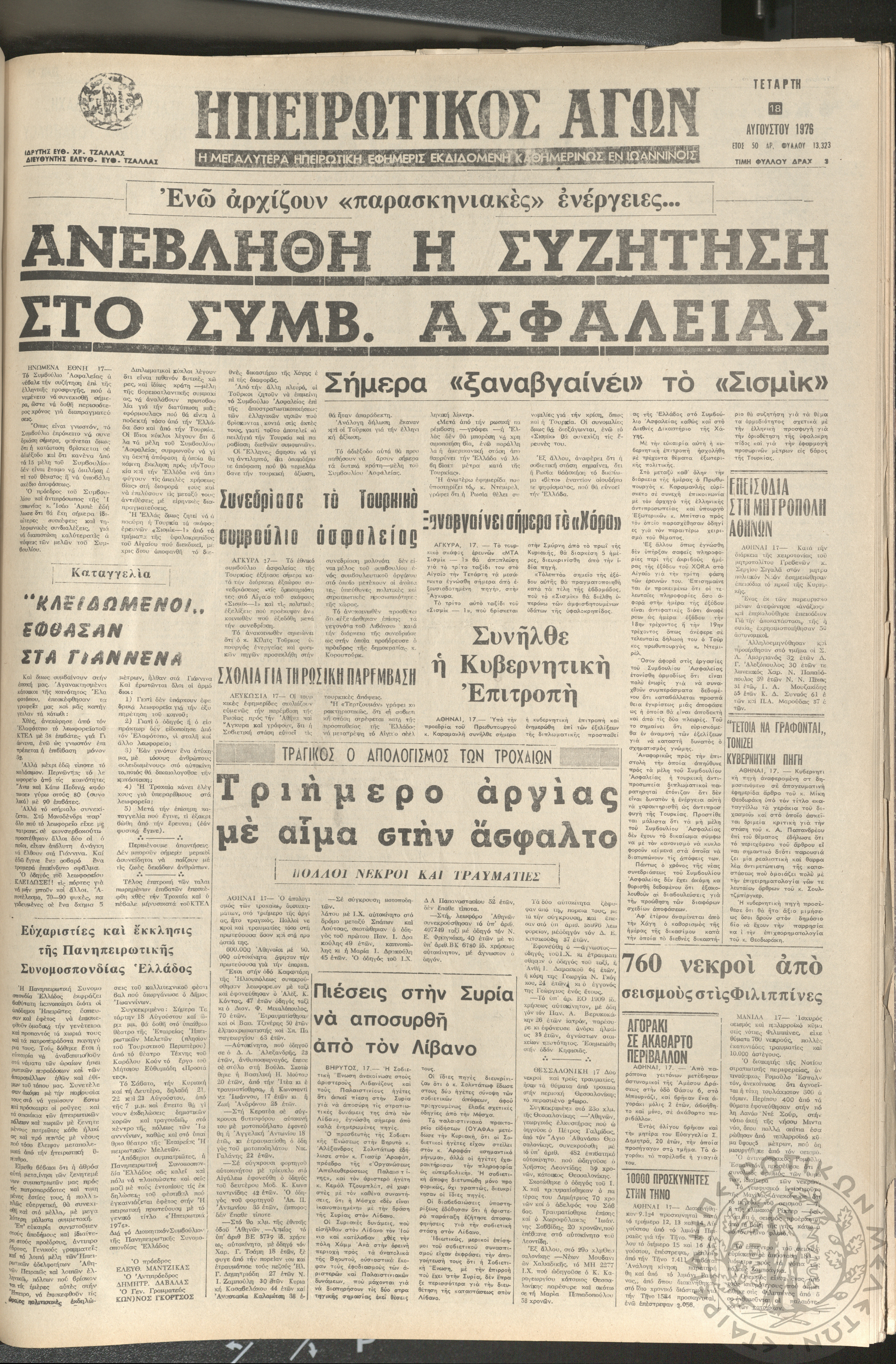 Ηπειρωτικός Αγών: η μεγαλυτέρα ηπειρωτική εφημερίς εκδιδόμενη καθημερινώς εν Ιωαννίνοις 1976 (φ. 13323)Έτος 50, φ. 13323...