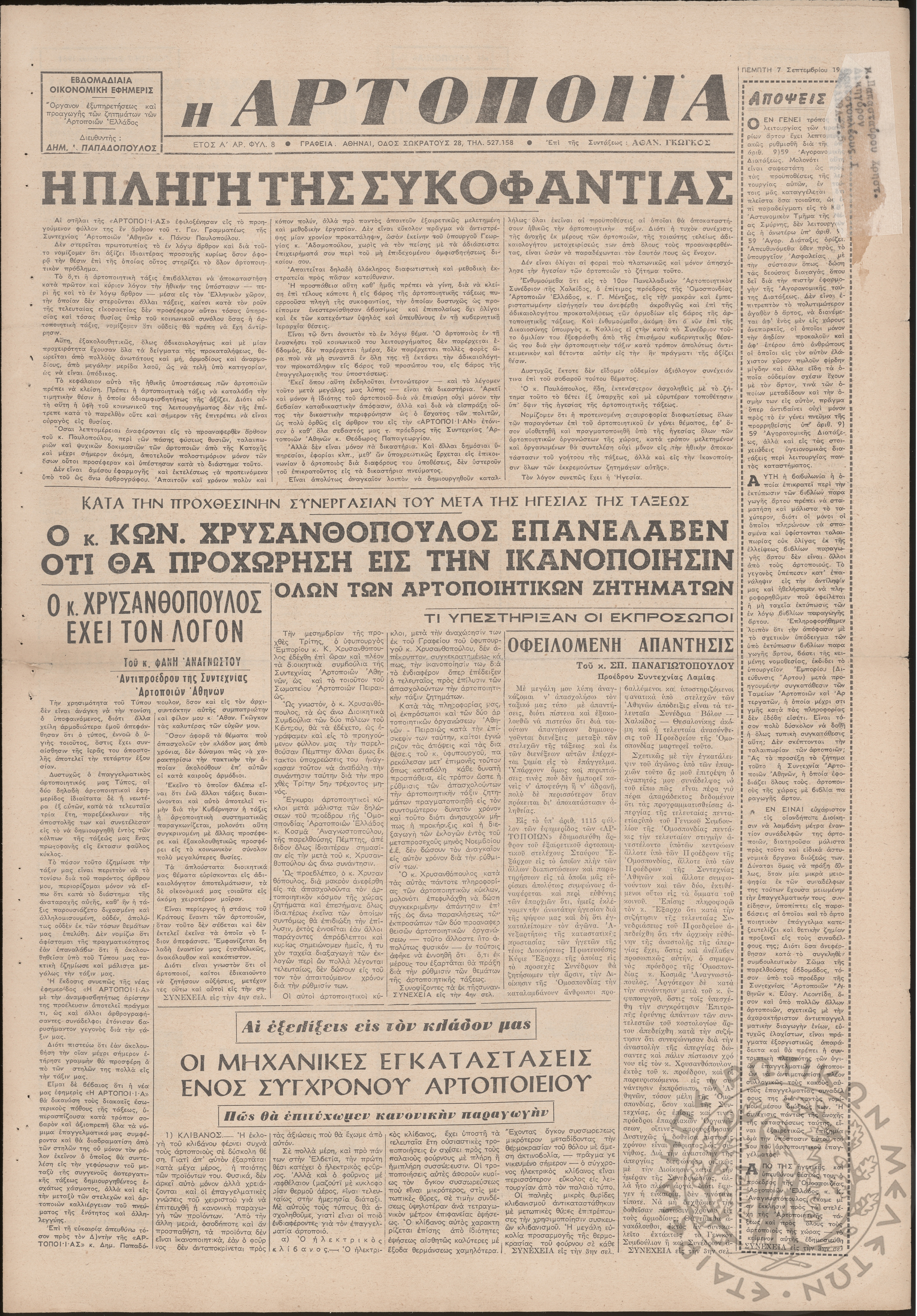 Η Αρτοποιία: εβδομαδιαία οικονομική εφημερίς, όργανον εξυπηρέτησεως και προαγωγής των ζητημάτων των αρτοποιών της Ελλάδας, 1961, φ. 7Έτος Α΄, φ. 7...