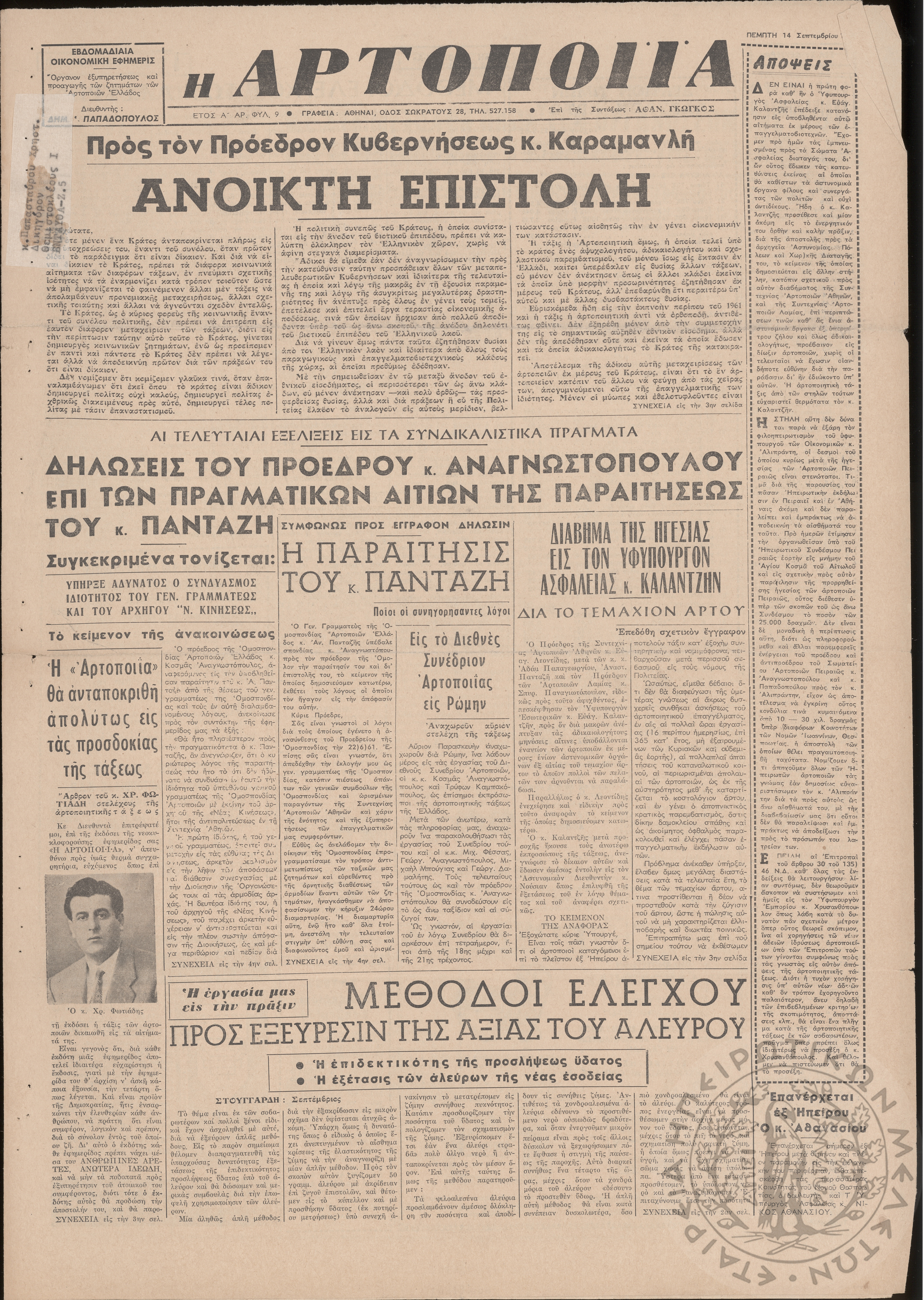 Η Αρτοποιία: εβδομαδιαία οικονομική εφημερίς, όργανον εξυπηρέτησεως και προαγωγής των ζητημάτων των αρτοποιών της Ελλάδας, 1961, φ. 9Έτος Α΄, φ. 9...