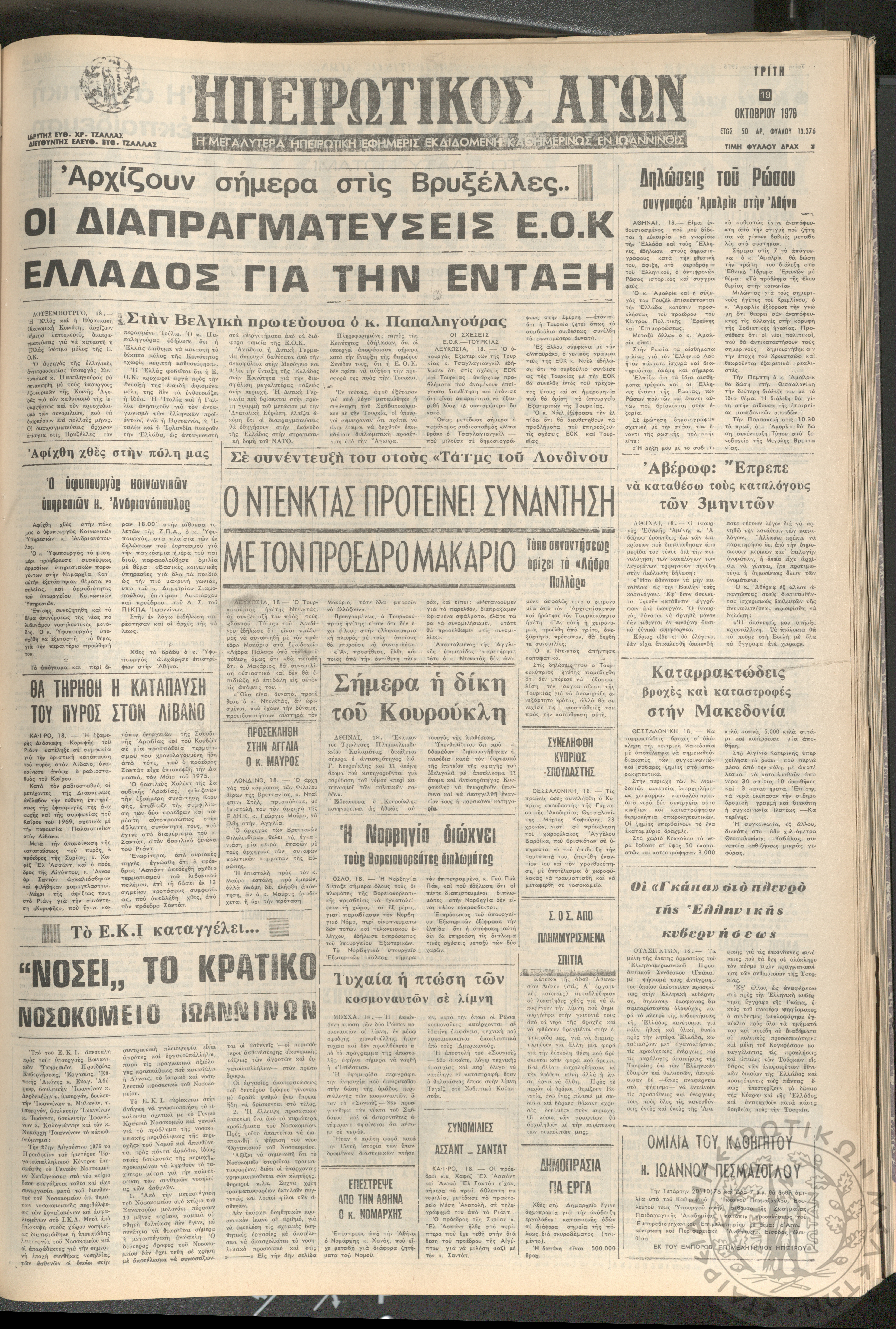 Ηπειρωτικός Αγών: η μεγαλυτέρα ηπειρωτική εφημερίς εκδιδόμενη καθημερινώς εν Ιωαννίνοις 1976 (φ. 13376)Έτος 50, φ. 13376...