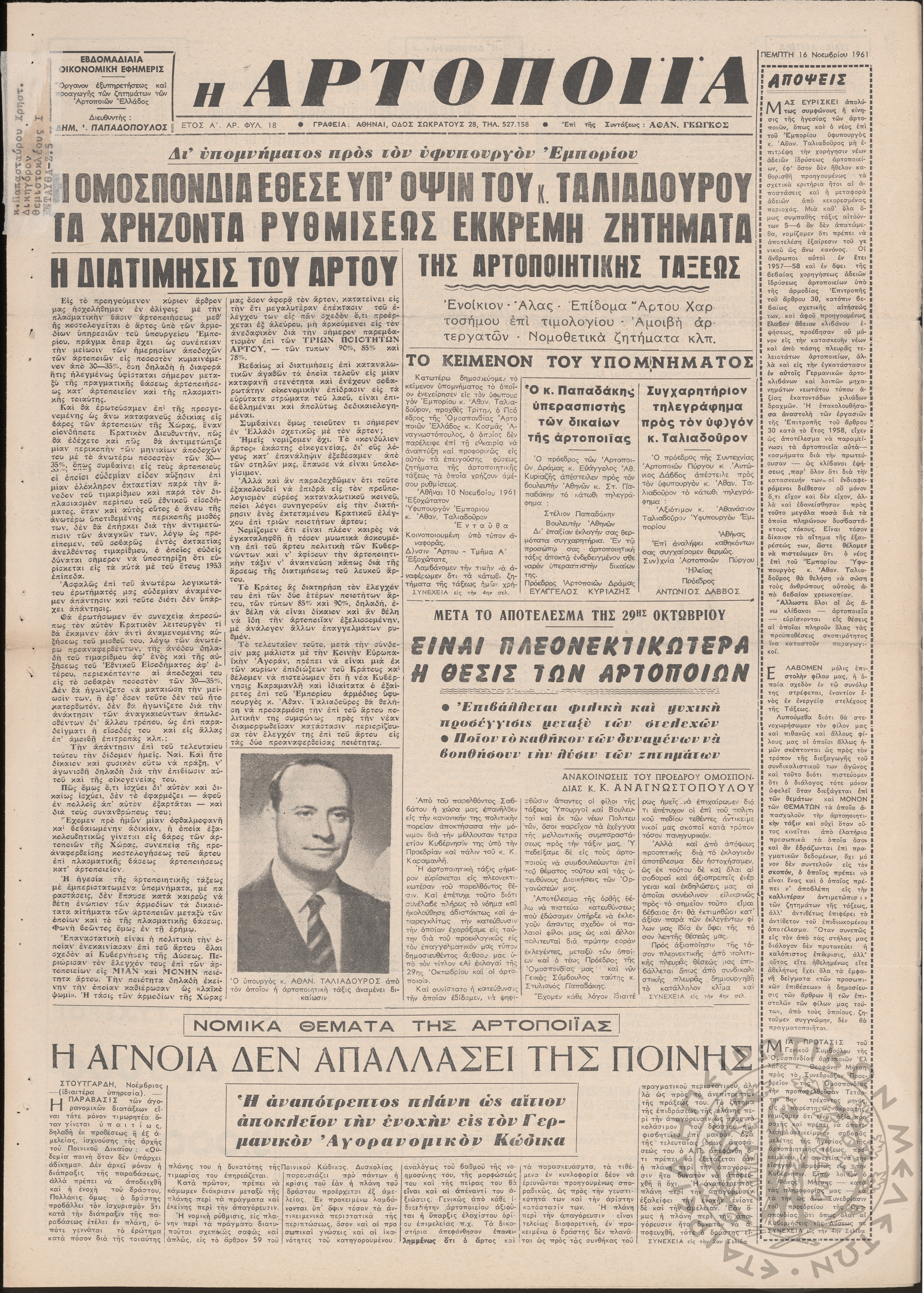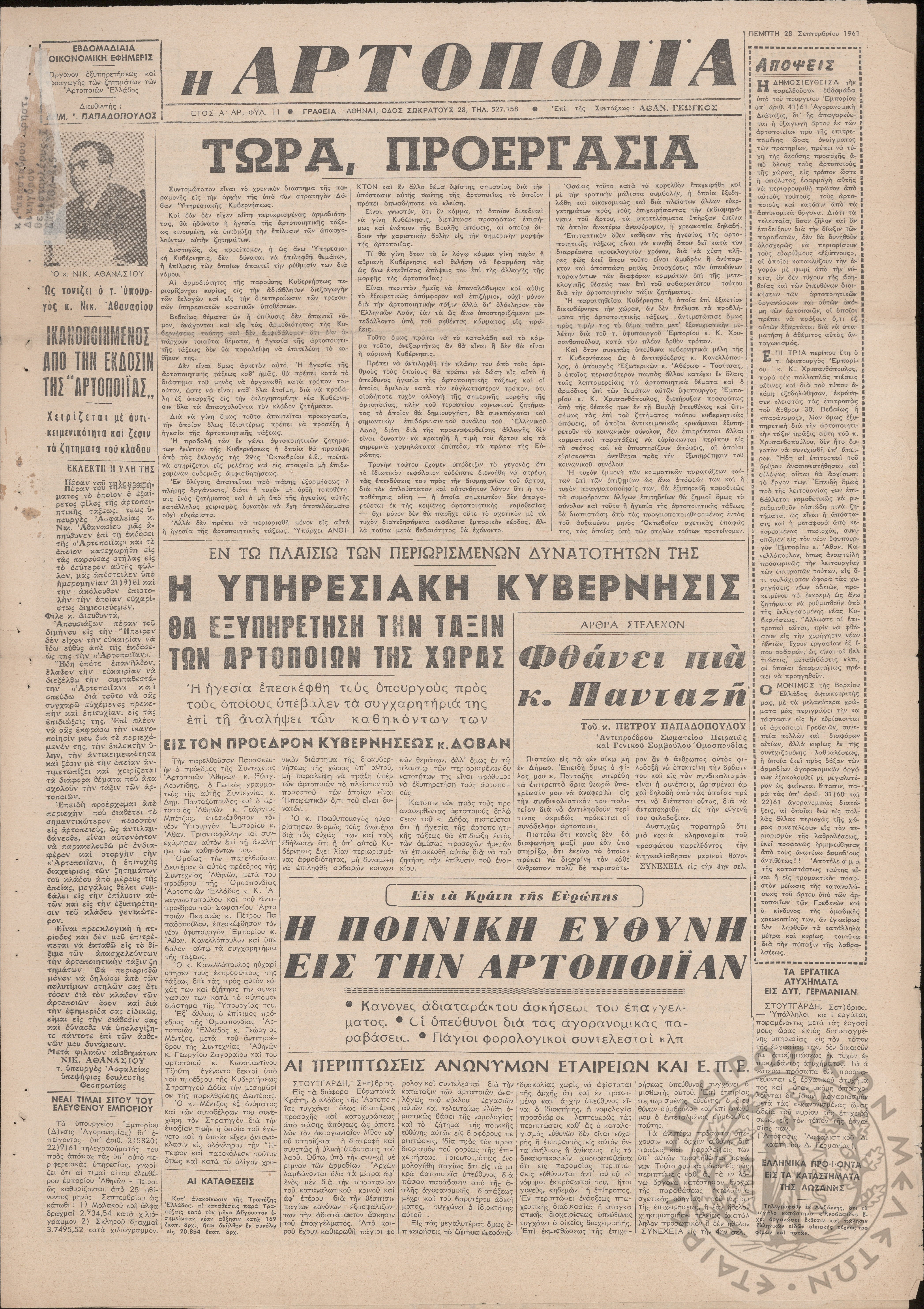 Η Αρτοποιία: εβδομαδιαία οικονομική εφημερίς, όργανον εξυπηρέτησεως και προαγωγής των ζητημάτων των αρτοποιών της Ελλάδας, 1961, φ. 11Έτος Α΄, φ. 11...