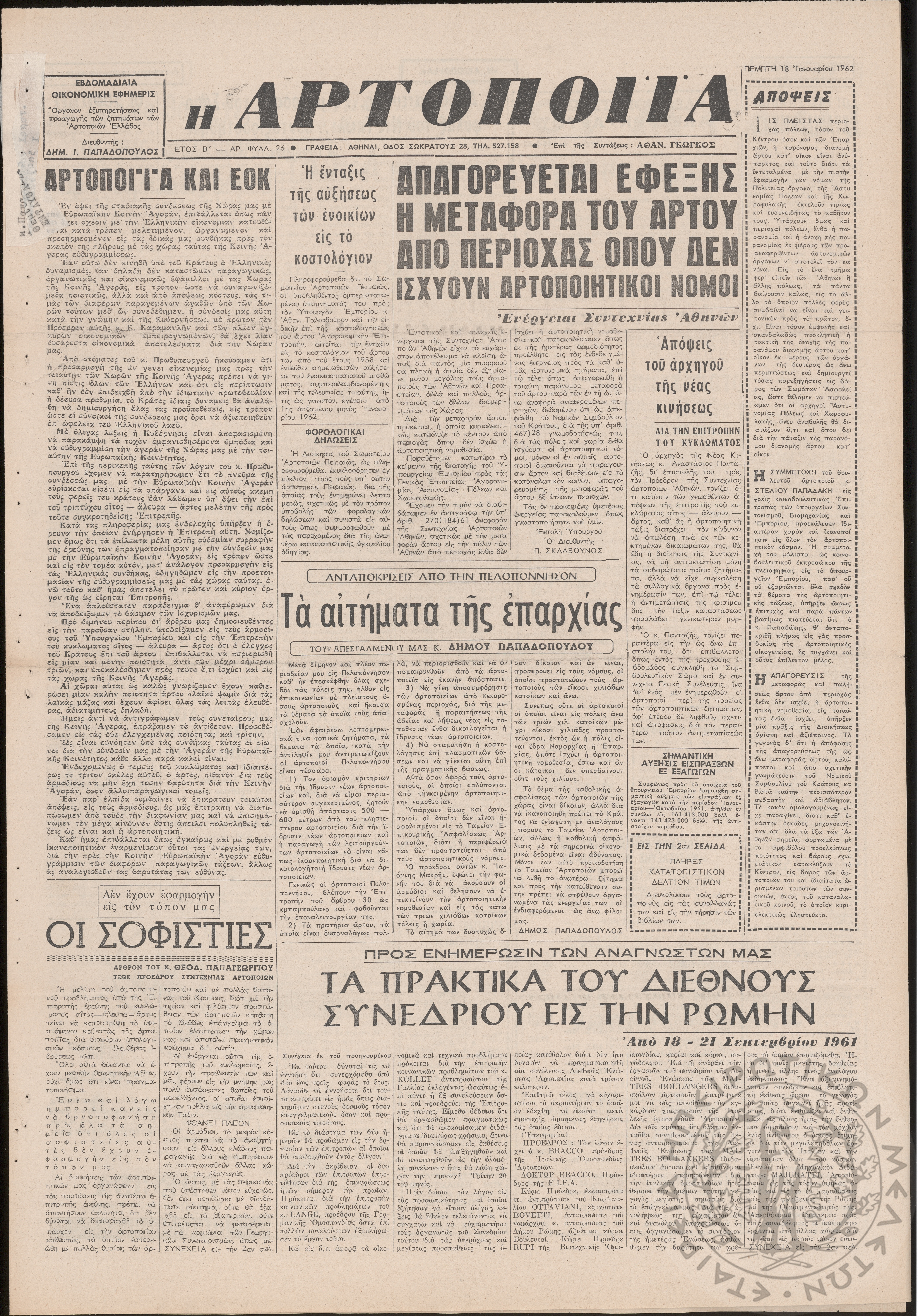 Η Αρτοποιία: εβδομαδιαία οικονομική εφημερίς, όργανον εξυπηρέτησεως και προαγωγής των ζητημάτων των αρτοποιών της Ελλάδας, 1962, φ. 26Έτος Β΄, φ. 26...