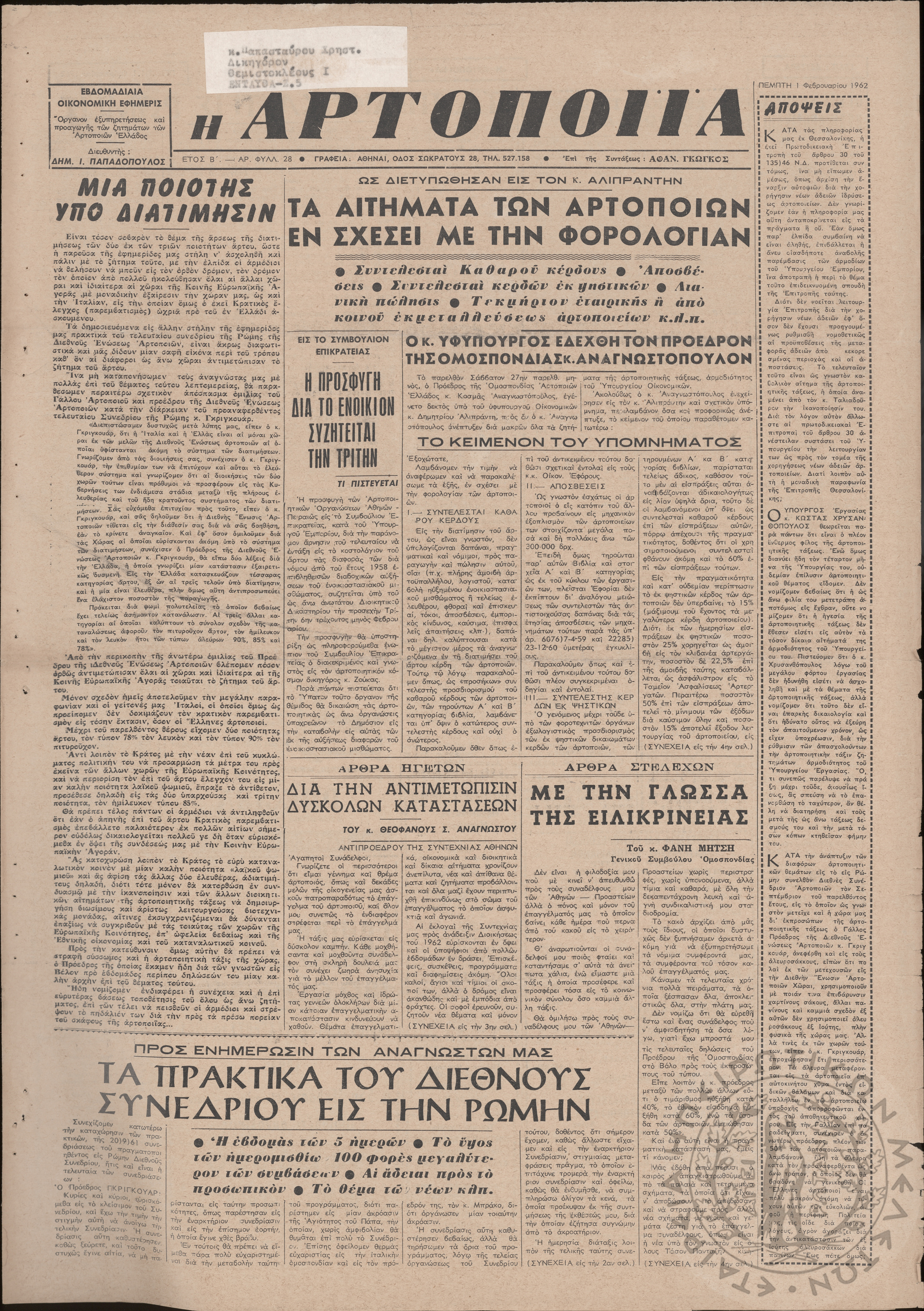 Η Αρτοποιία: εβδομαδιαία οικονομική εφημερίς, όργανον εξυπηρέτησεως και προαγωγής των ζητημάτων των αρτοποιών της Ελλάδας, 1962, φ. 28Έτος Β΄, φ. 28...