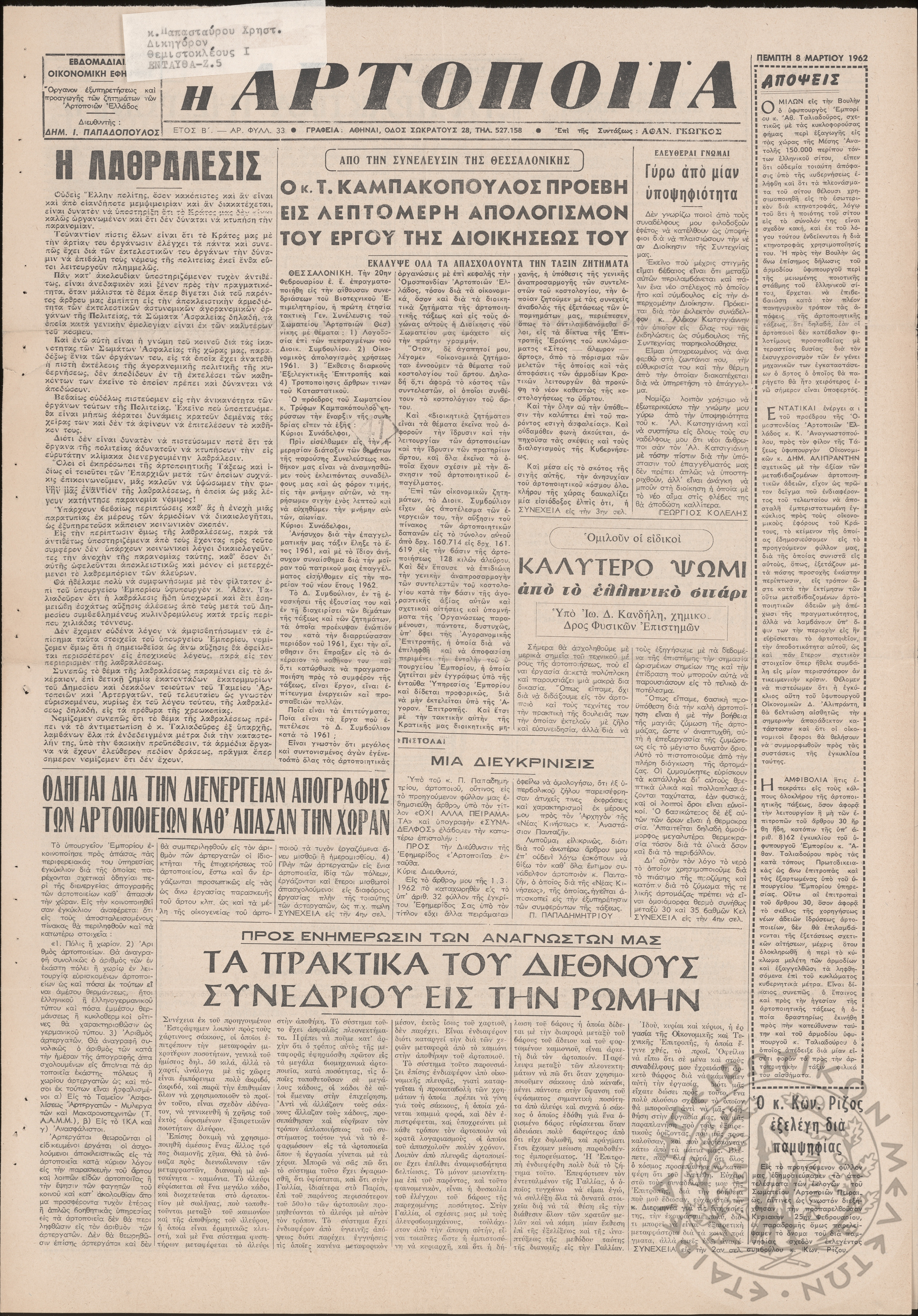 Η Αρτοποιία: εβδομαδιαία οικονομική εφημερίς, όργανον εξυπηρέτησεως και προαγωγής των ζητημάτων των αρτοποιών της Ελλάδας, 1962, φ. 33Έτος Β΄, φ. 33...